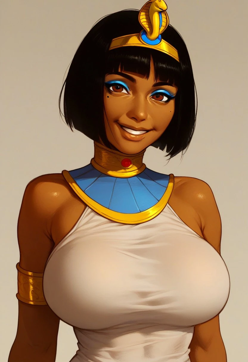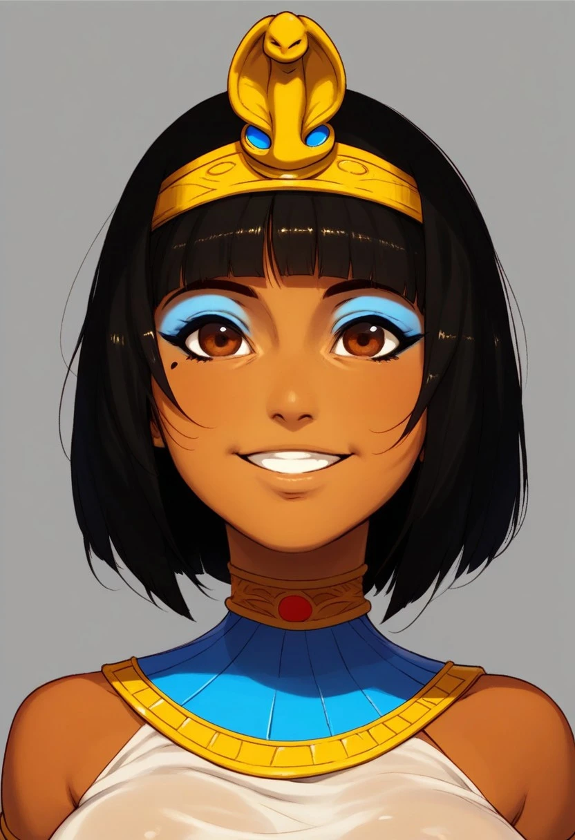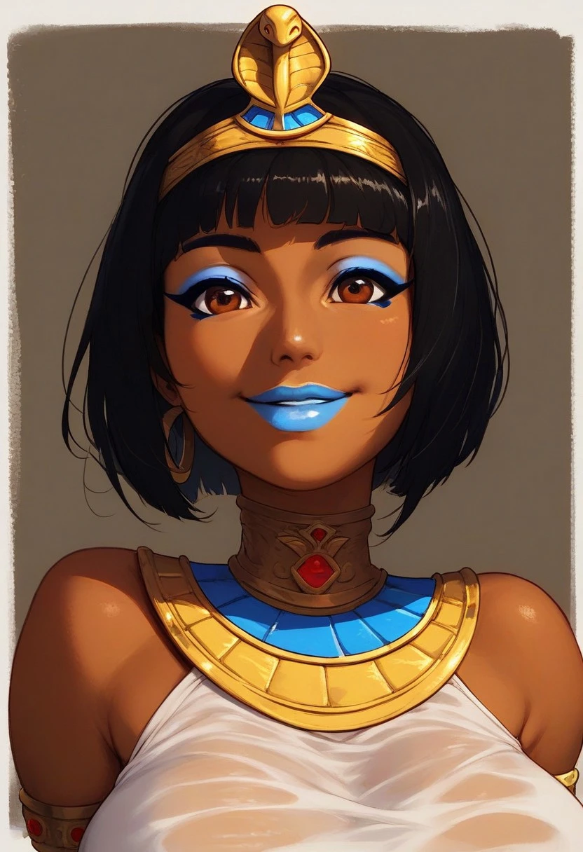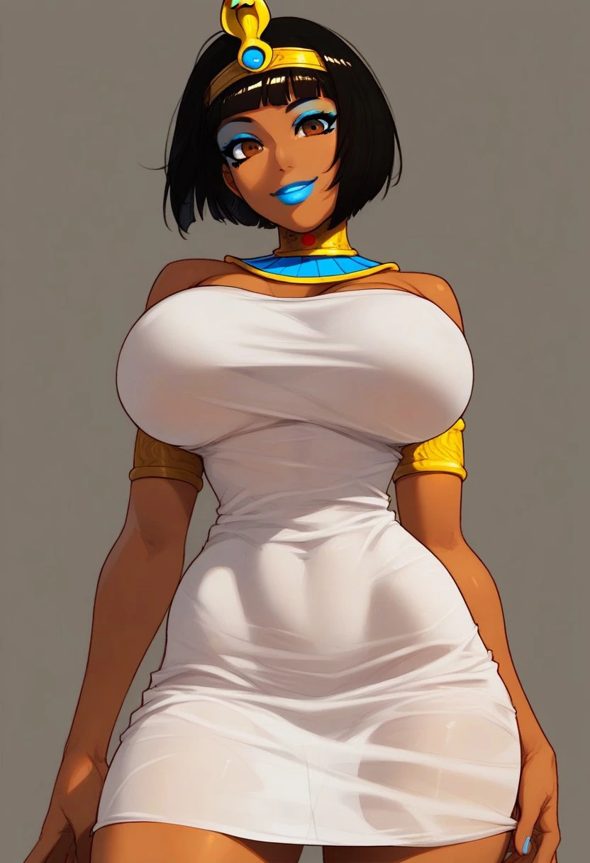opala, dark-skinned female, egyptian female, caramel skin, big breasts, black hair, bangs, bob cut, brown eyes, blue eyeshadow,
