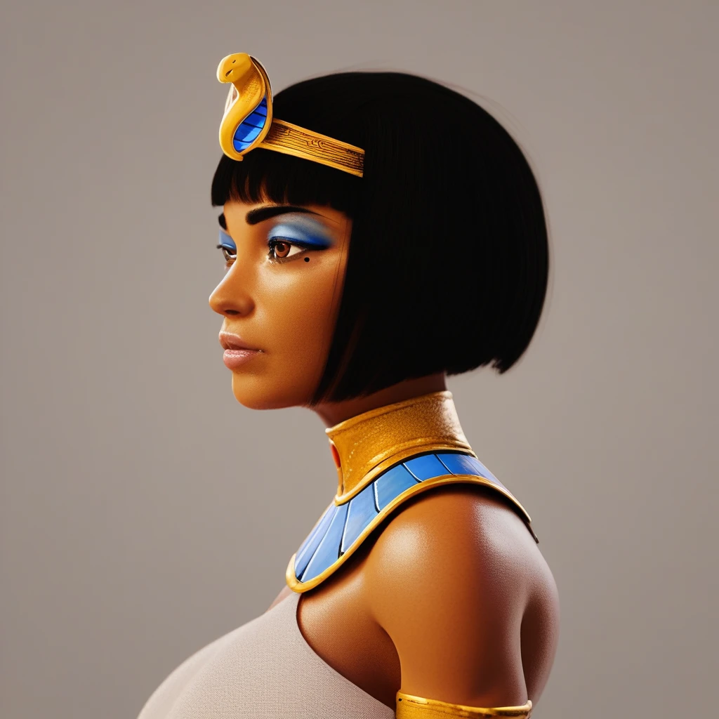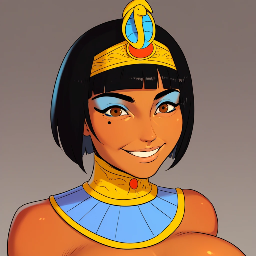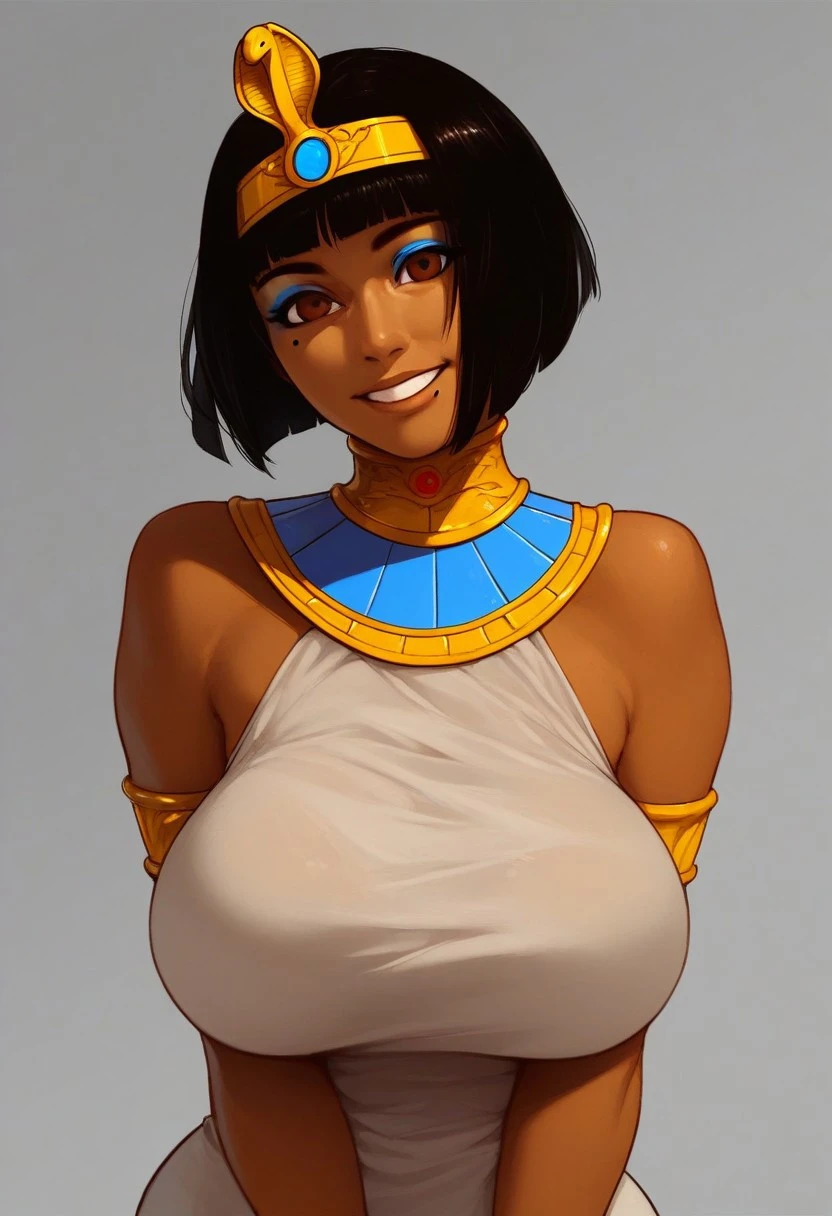 opala, dark-skinned female, egyptian female, caramel skin, big breasts, black hair, bangs, bob cut, brown eyes, blue eyeshadow,