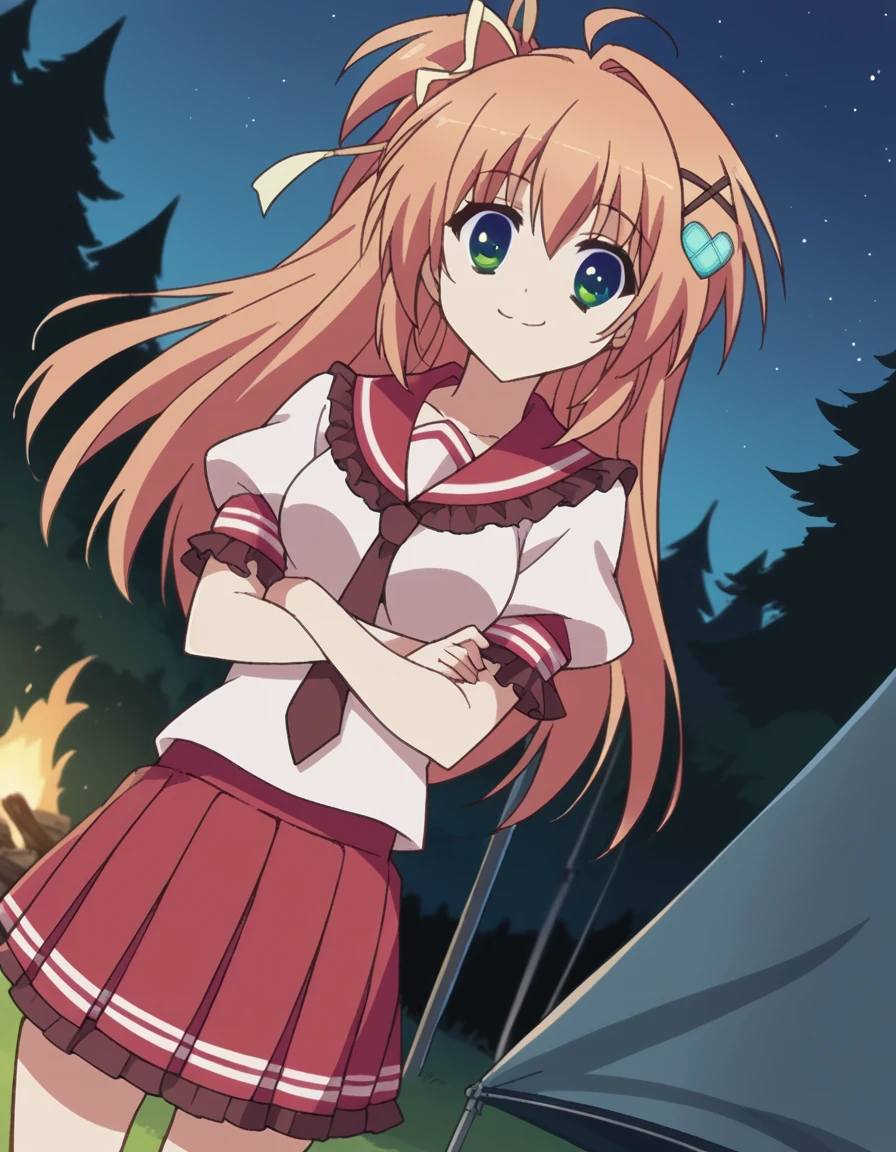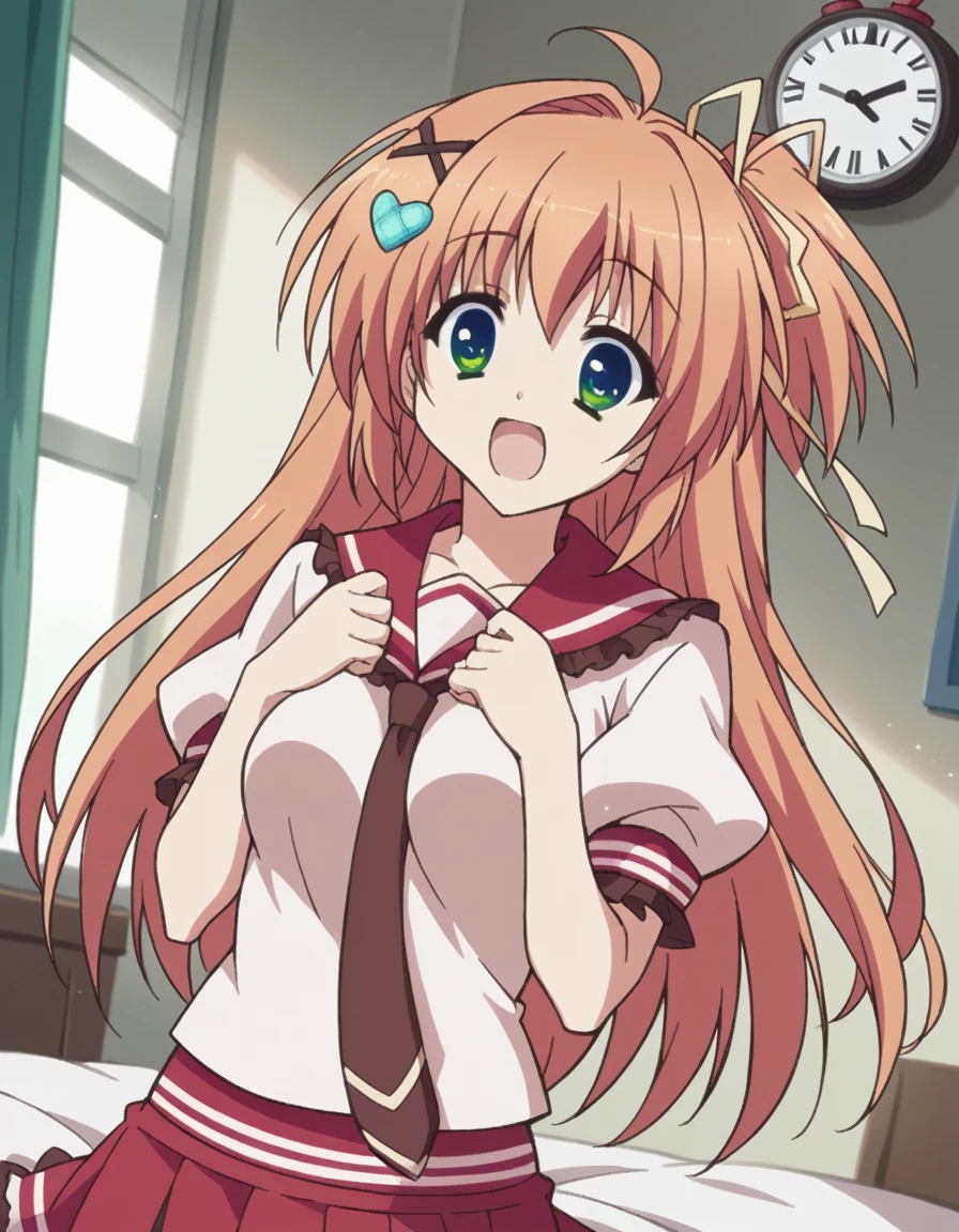 ui nakatsugawa, long hair, hair ornament, ribbon, green eyes, hair ribbon, ahoge, orange hair, heart hair ornament, medium breasts