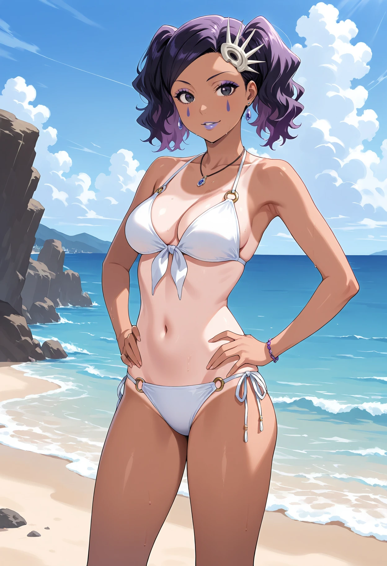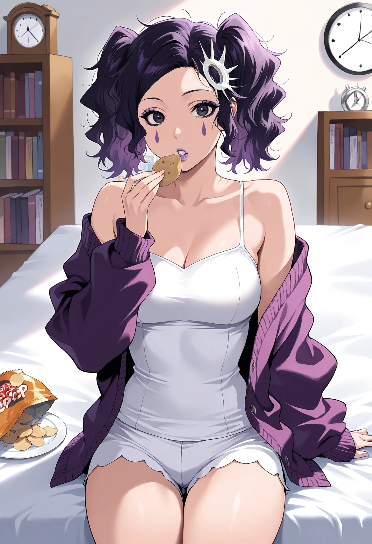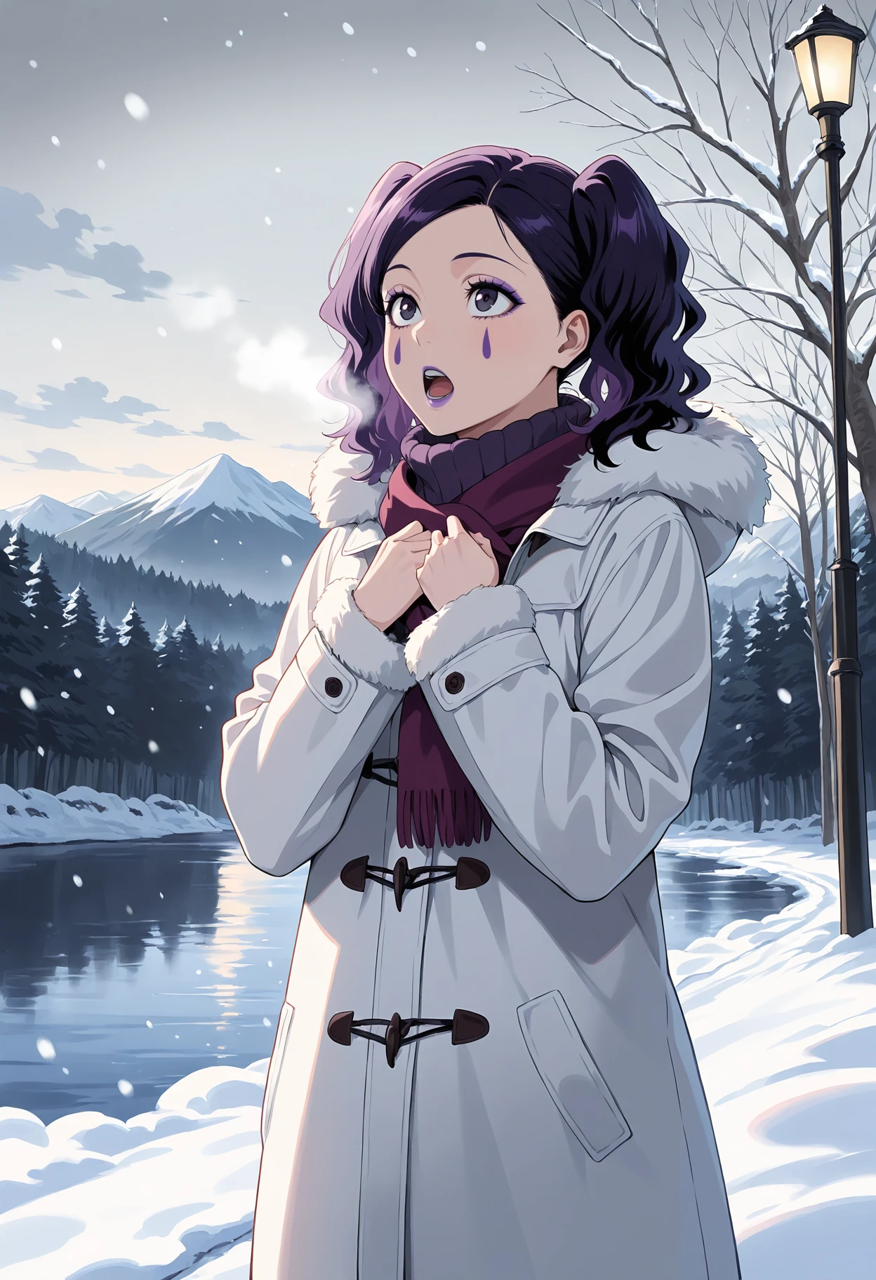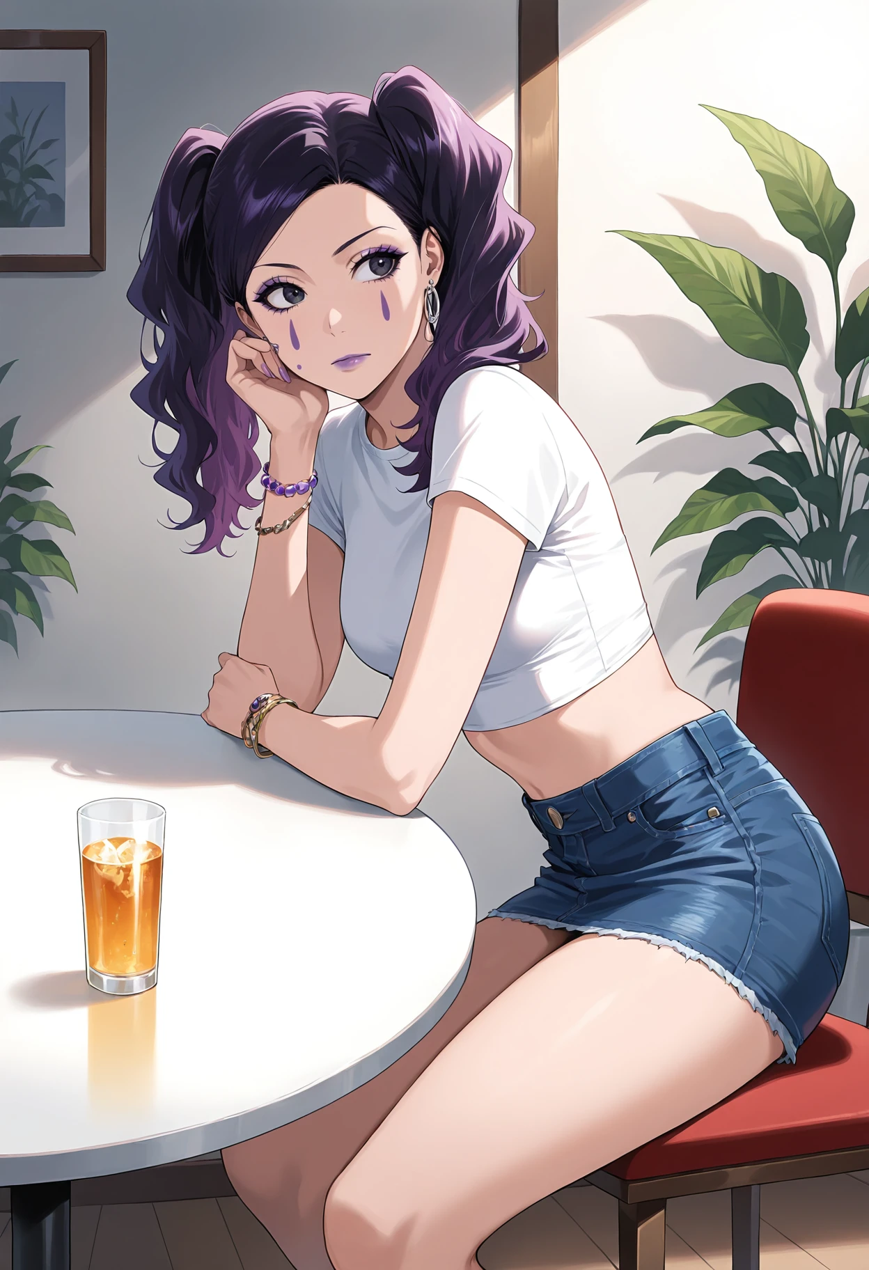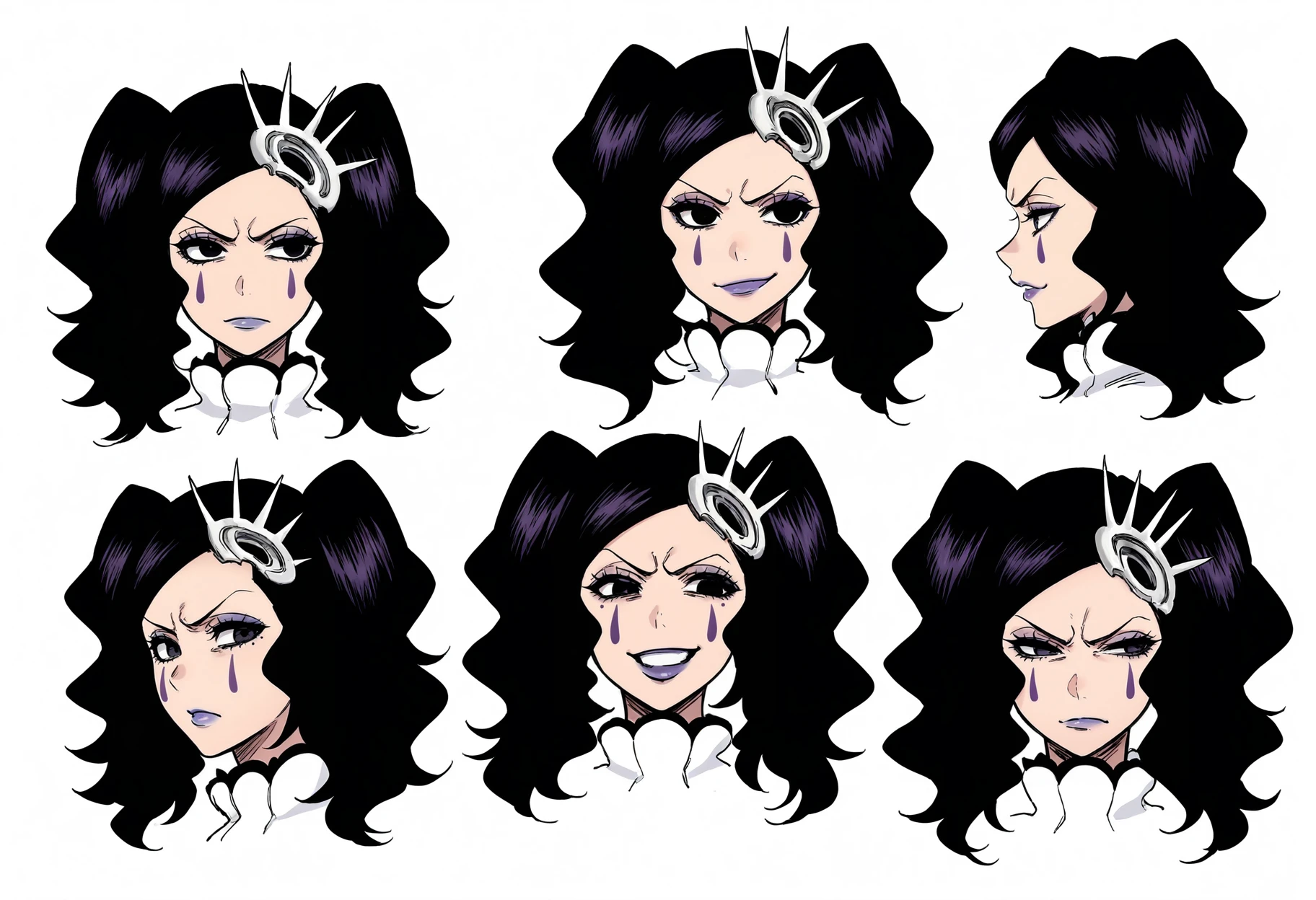 1girl,black eyes,purple eyes,black hair,purple hair,twintails,facial mark,makeup,lipstick