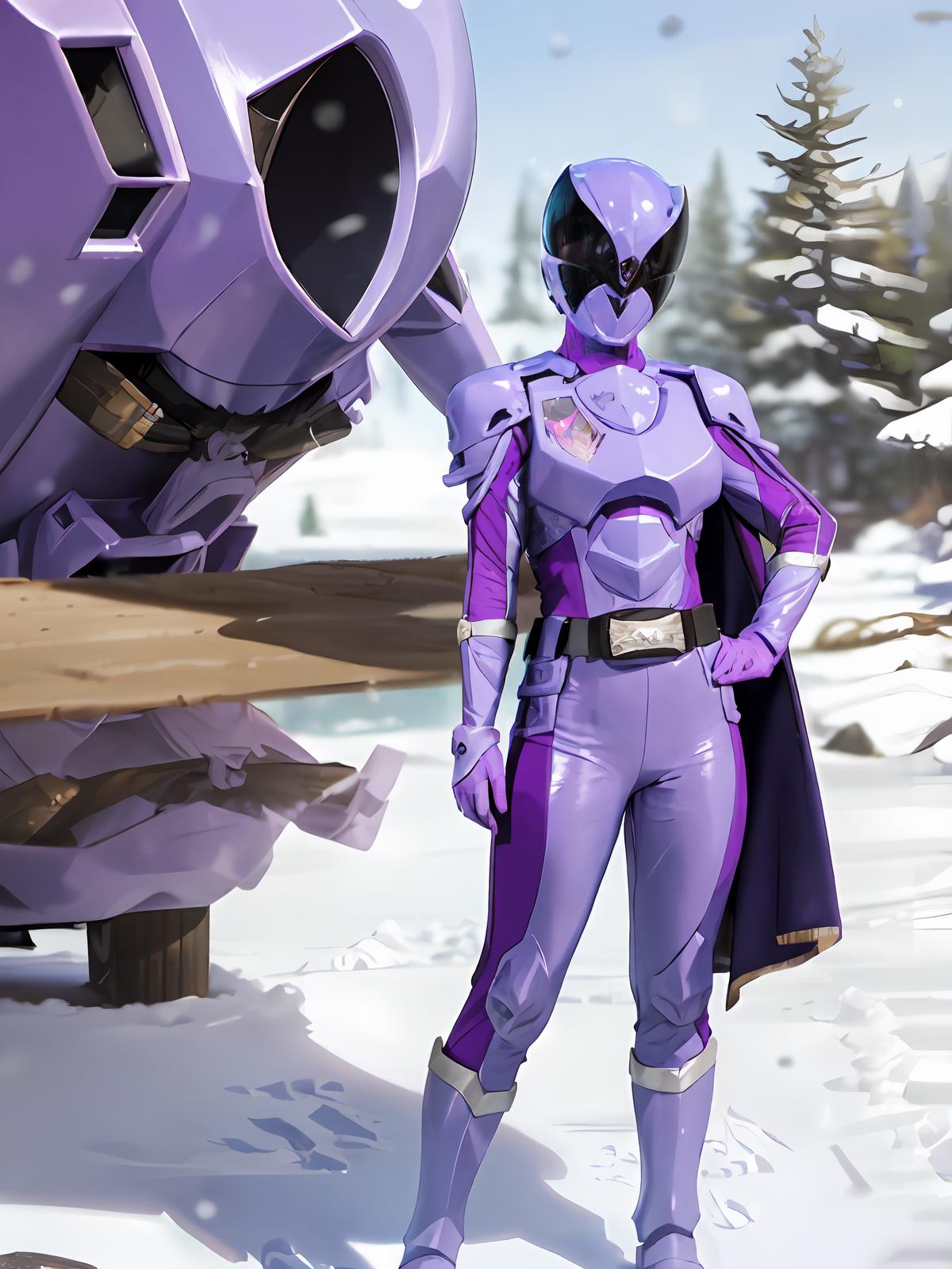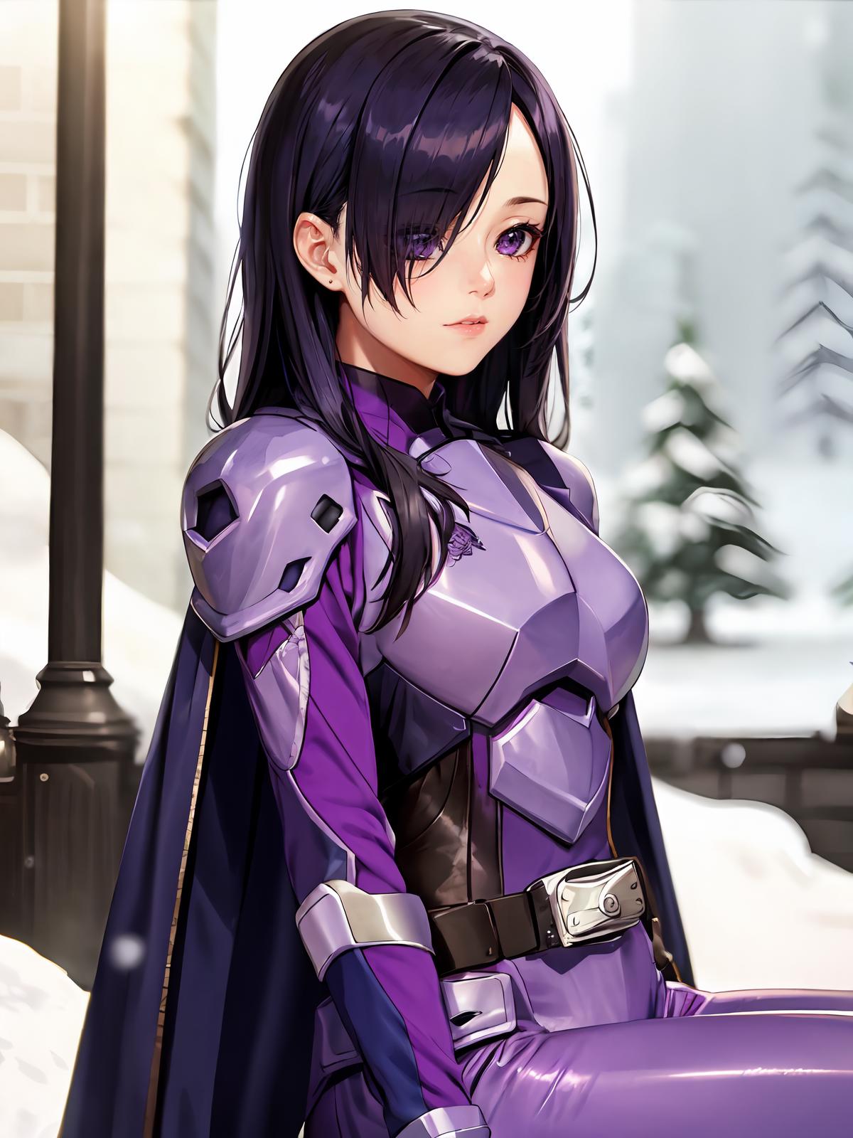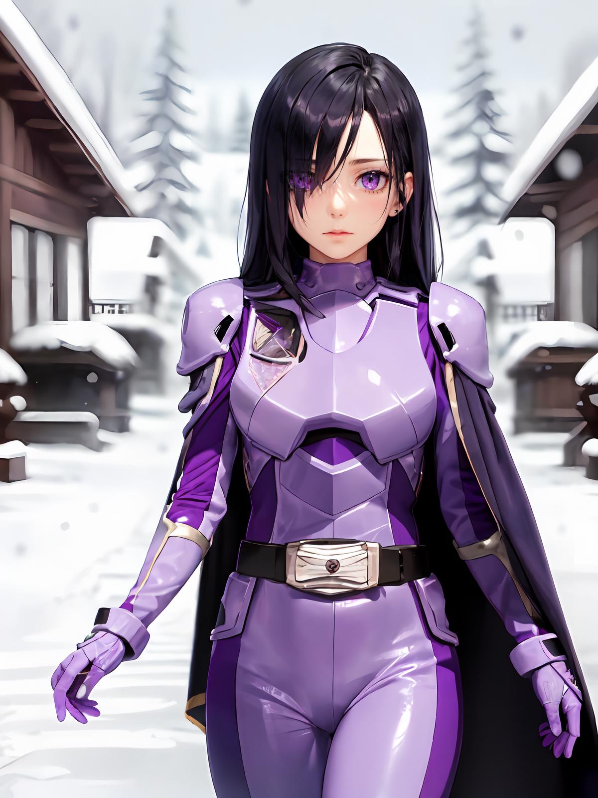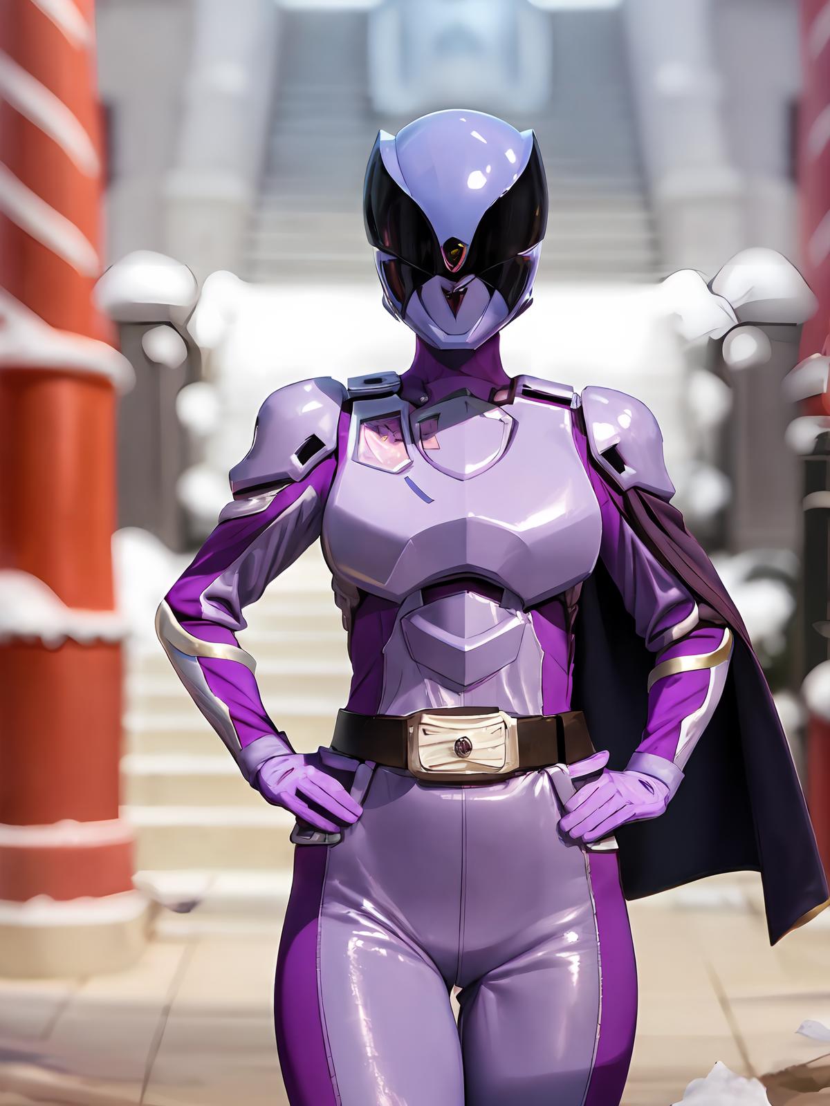 Prompts: helmet, cape, armor, belt, bodysuit, purple cape, purple bodysuit, gloves, purple gloves, buckle, purple footwear