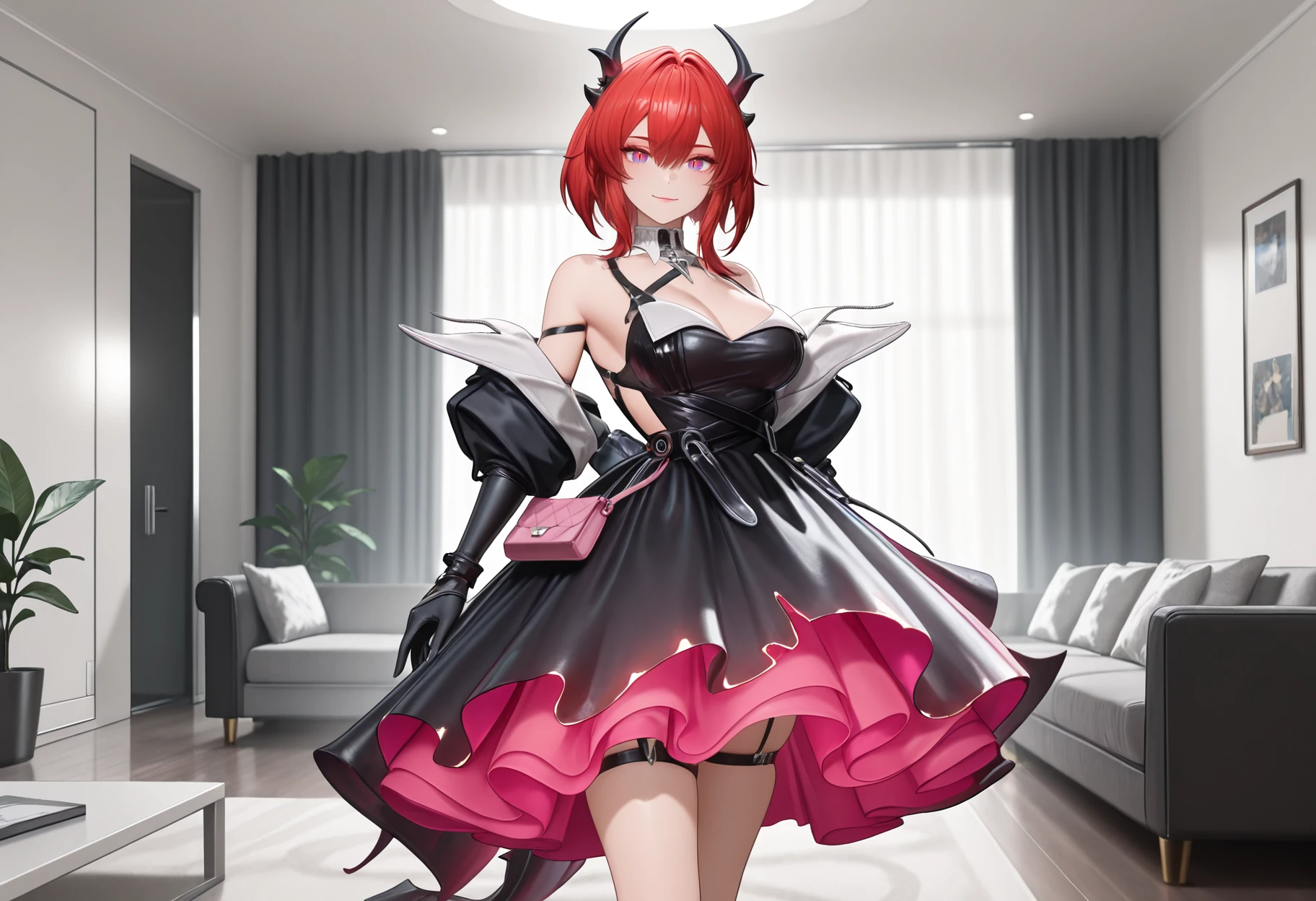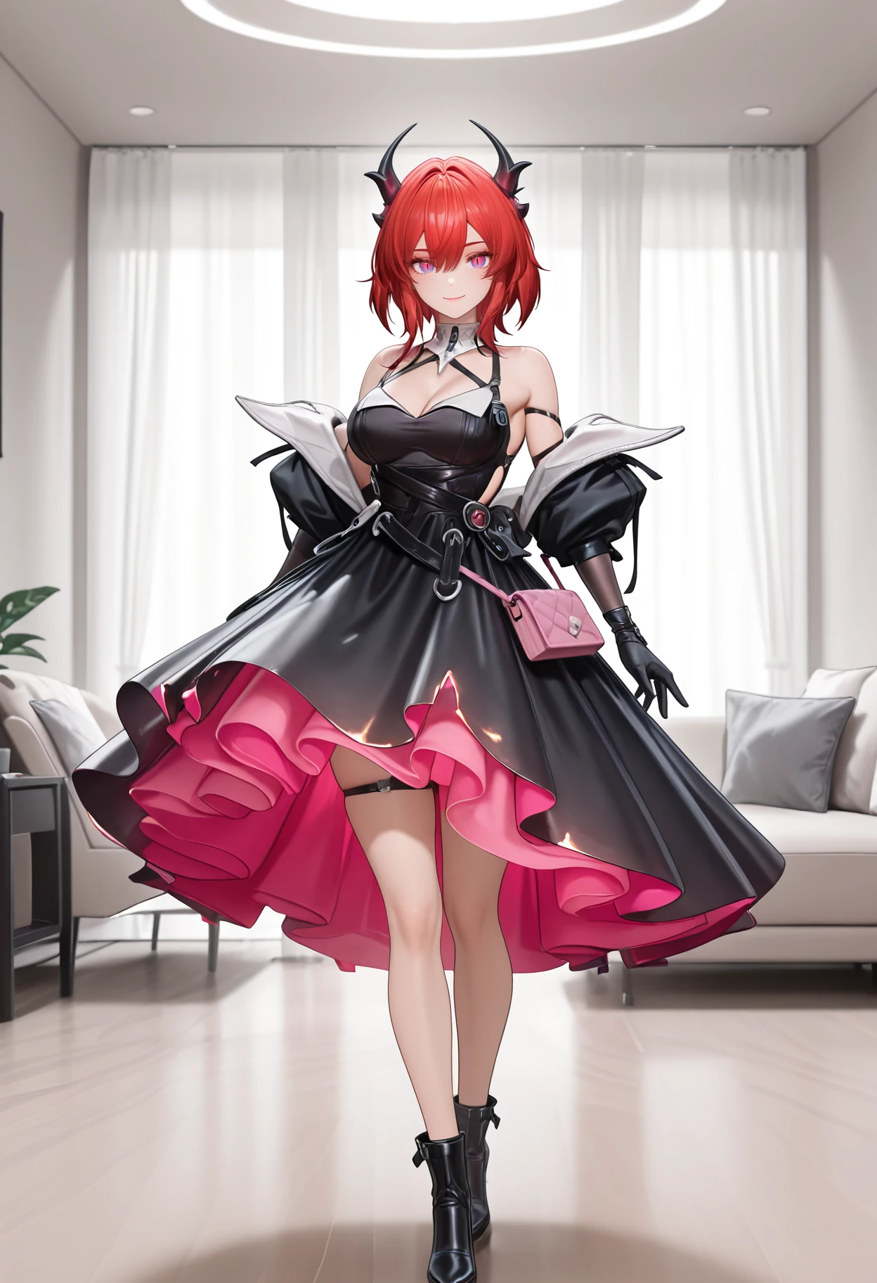 white collar, metal pendant, straps, shoulder cut, cleavage, black dreess, white cut, single free shoulder, loose jacket, black long gloves, long floating dress, pink dress interior, pink purse, dress decorations, thigh straps,