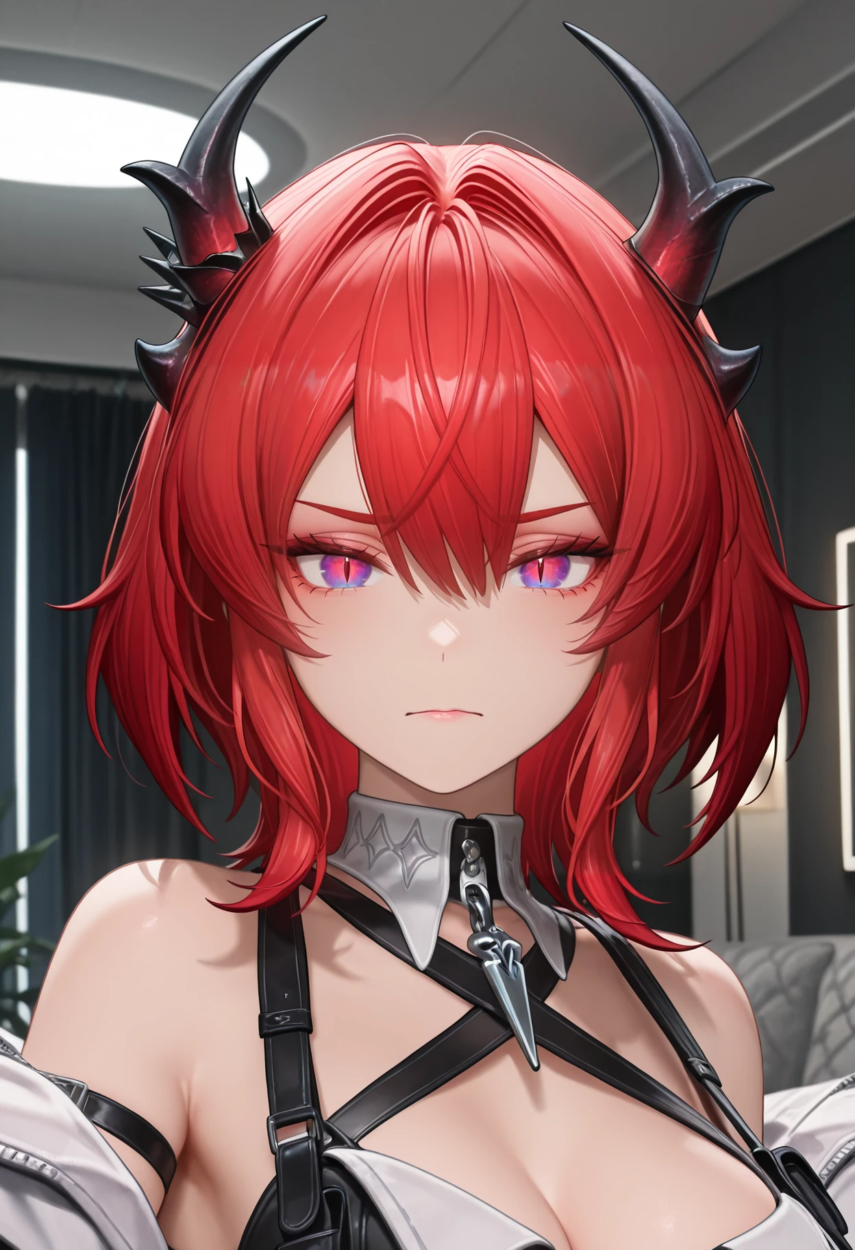 1girl, laevatain, solo, red hair, black horns, bangs, sideburns, short hair, multi-colored eyes, purple eyes, slit pupils, lipstick,