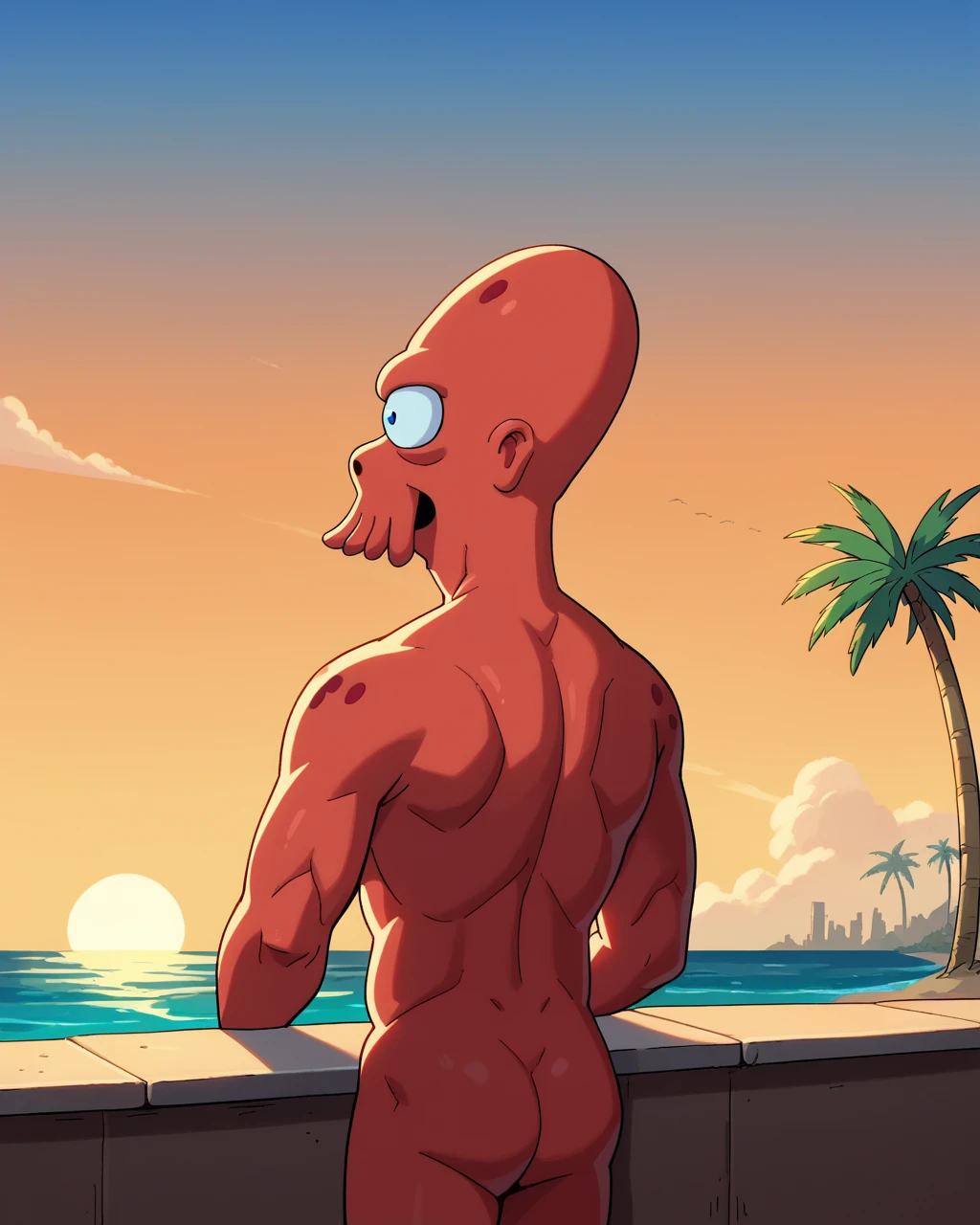 Zoidberg, red skin, tentacle mustache, blue sclera