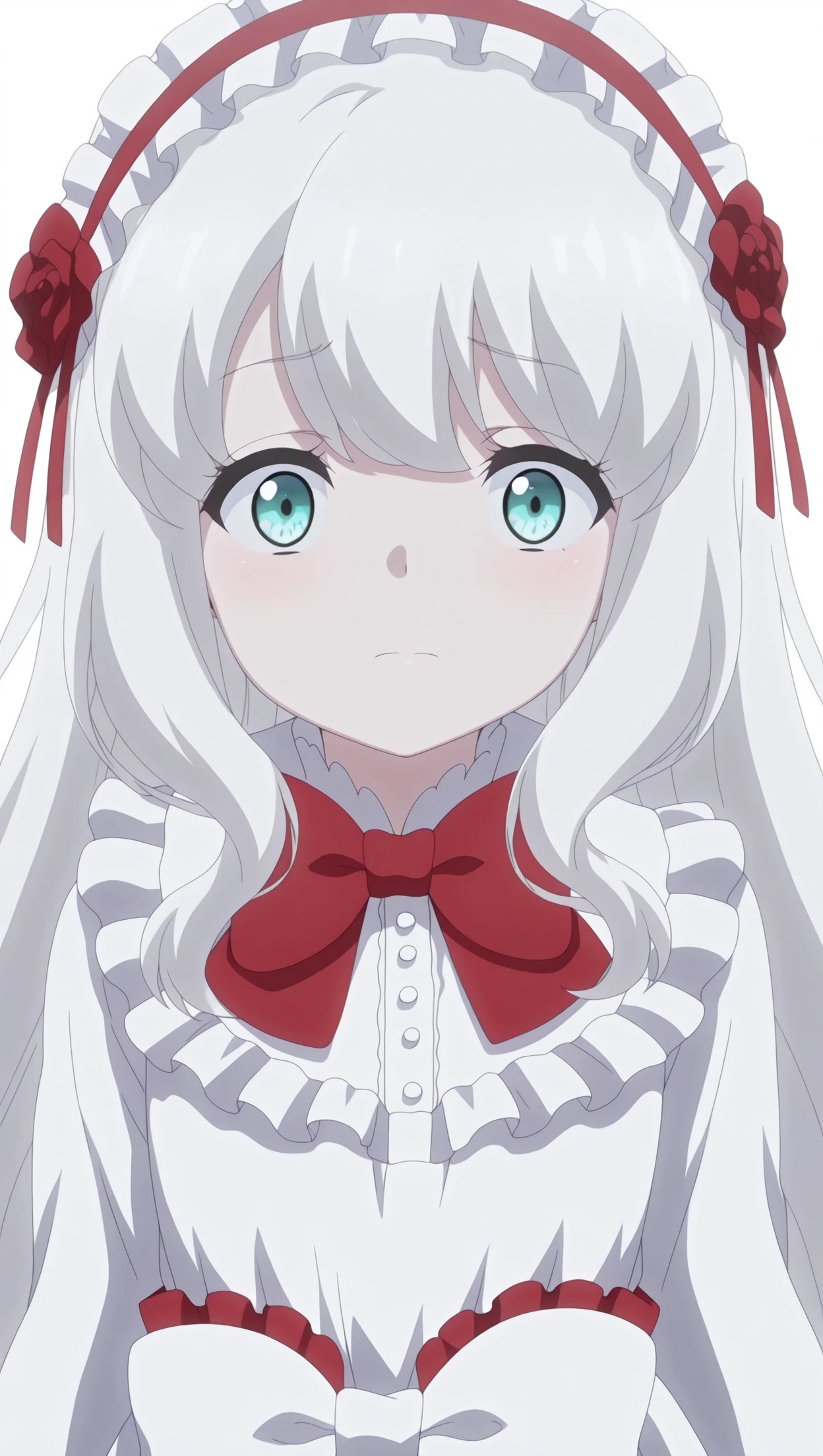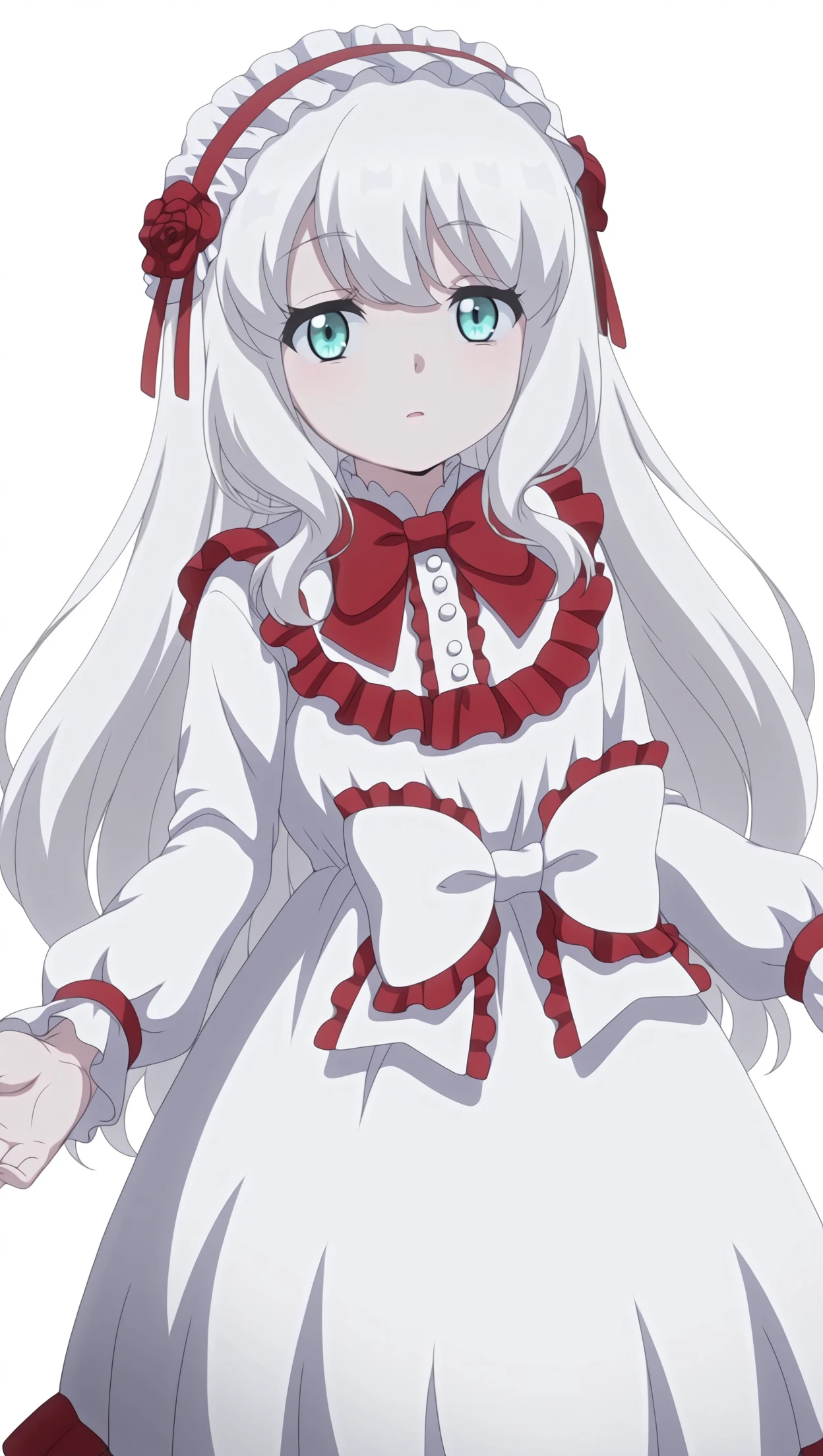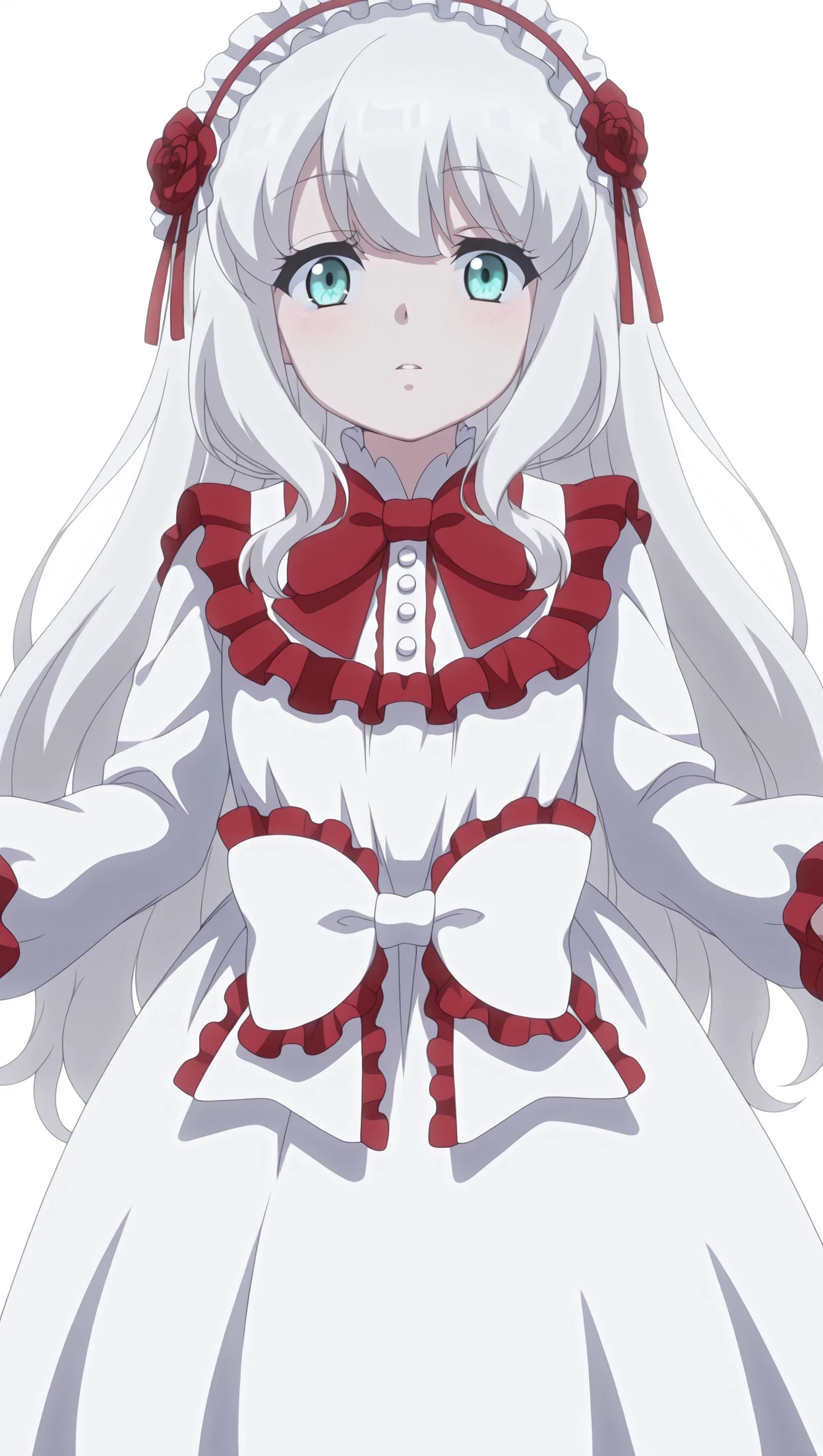 anime coloring, masterpiece, best quality, amazing quality, mary-san, 1girl, long hair, white hair, aqua eyes, flat chest, headdress, bowtie, dress, frilled dress, bow, white bow, solo, pose, standing, looking at viewer, from front, ((((white background, simple background))))⚙️ Generation Settings
