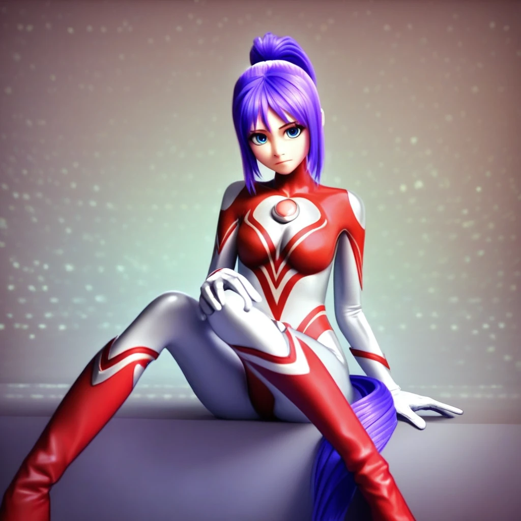 Monica, purple hair, ponytail, blue eyes, bodysuit,skin tight, blue chest jewel, gloves, red knee-high boots, simple background,
