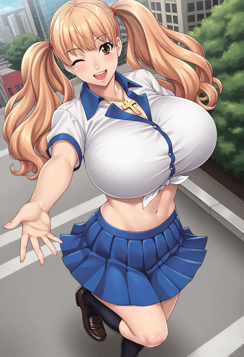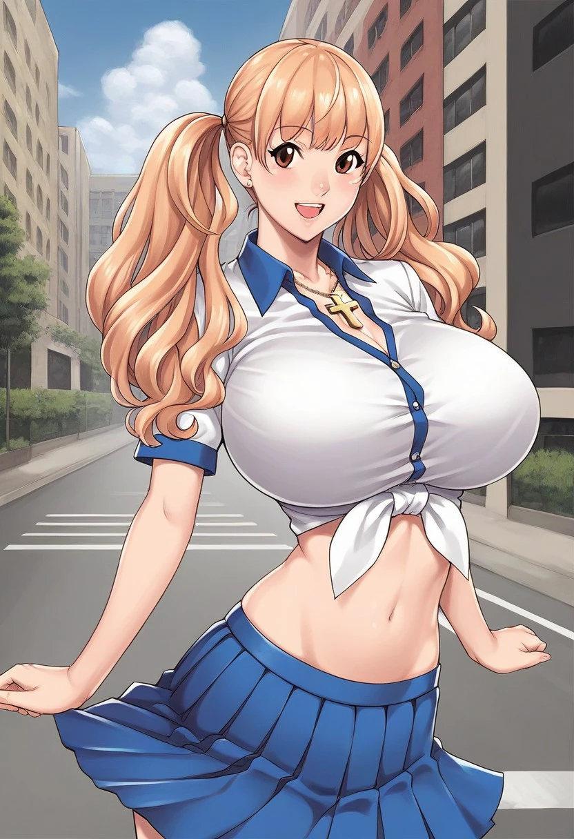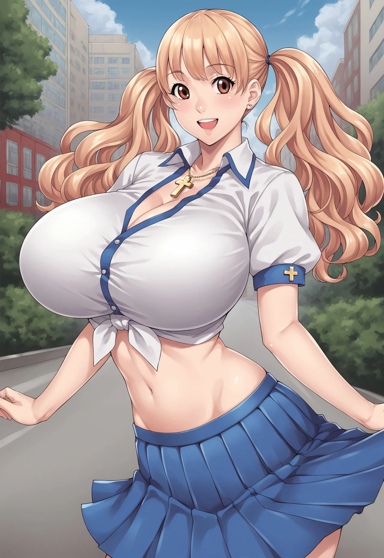 Tags: Satsuki Saijou, long hair, twin ponytails, blondish-yellow hair, wavy hair, brown eyes, huge breasts, gold cross necklace,
