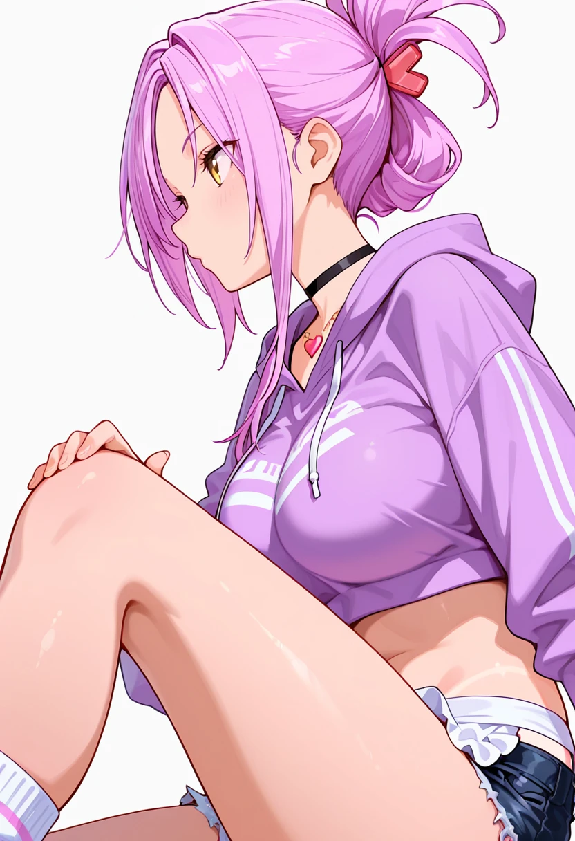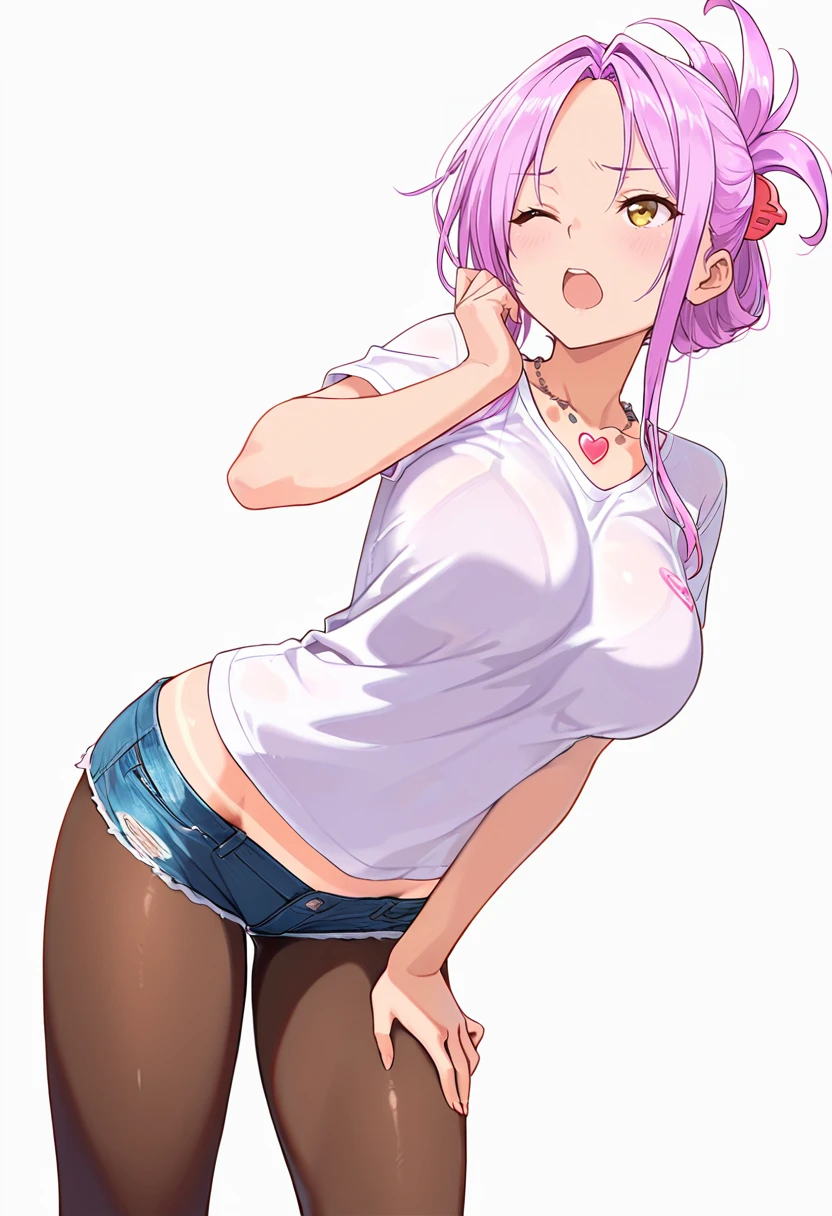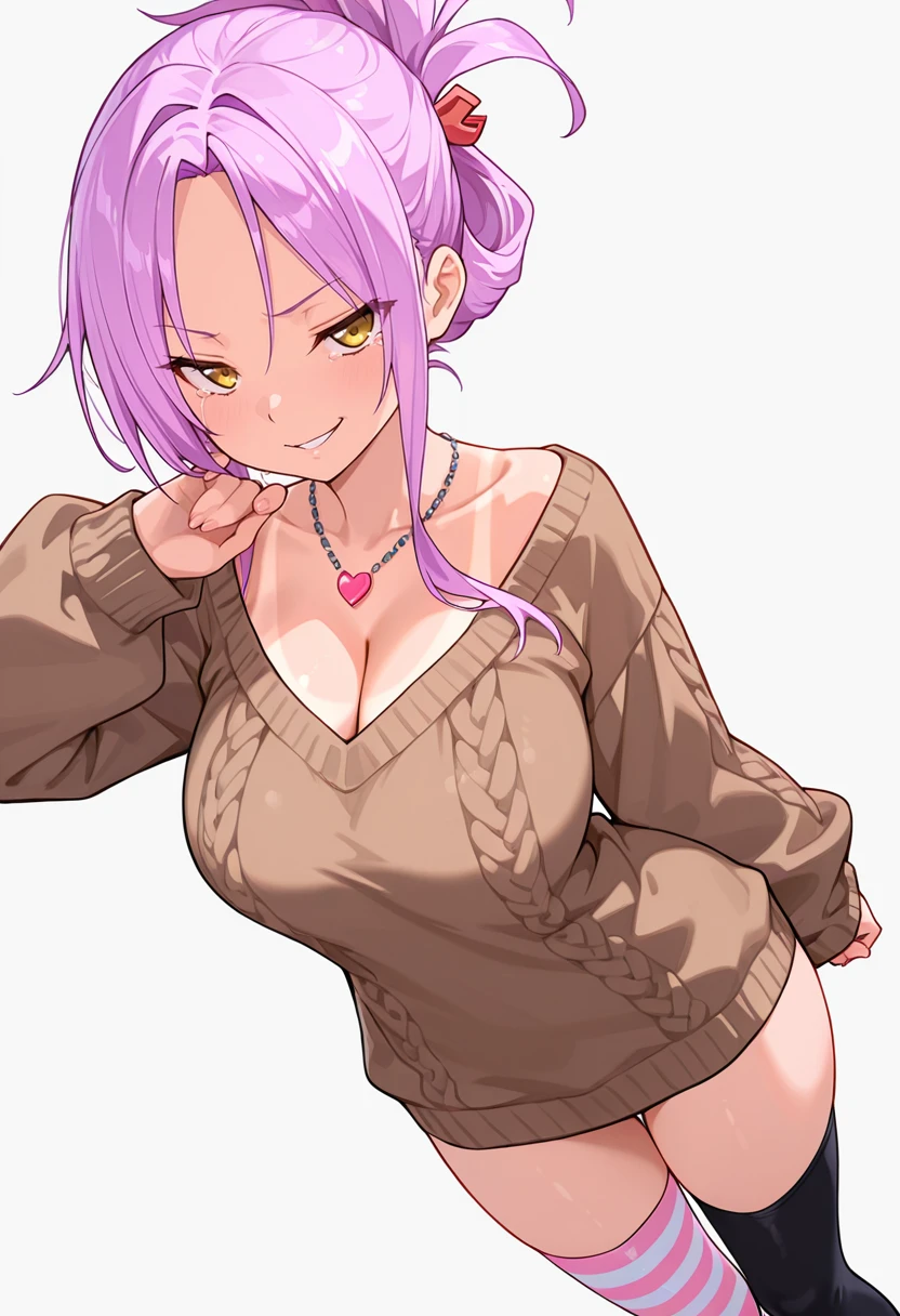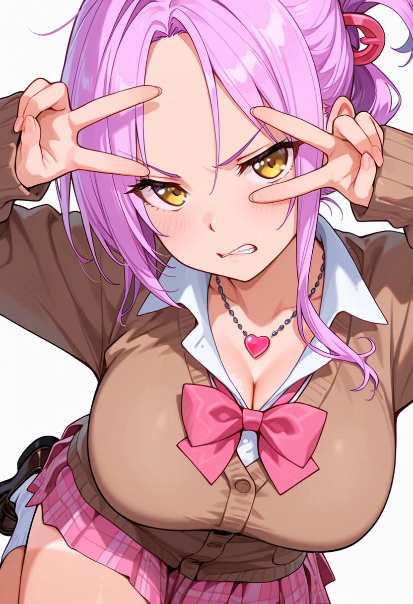 elena_cnr, 1girl purple hair, yellow eyes, pink hair, ?????????????, long hair, tanlines, folded ponytail, heart necklace, hair ornament,👗Signature Outfit