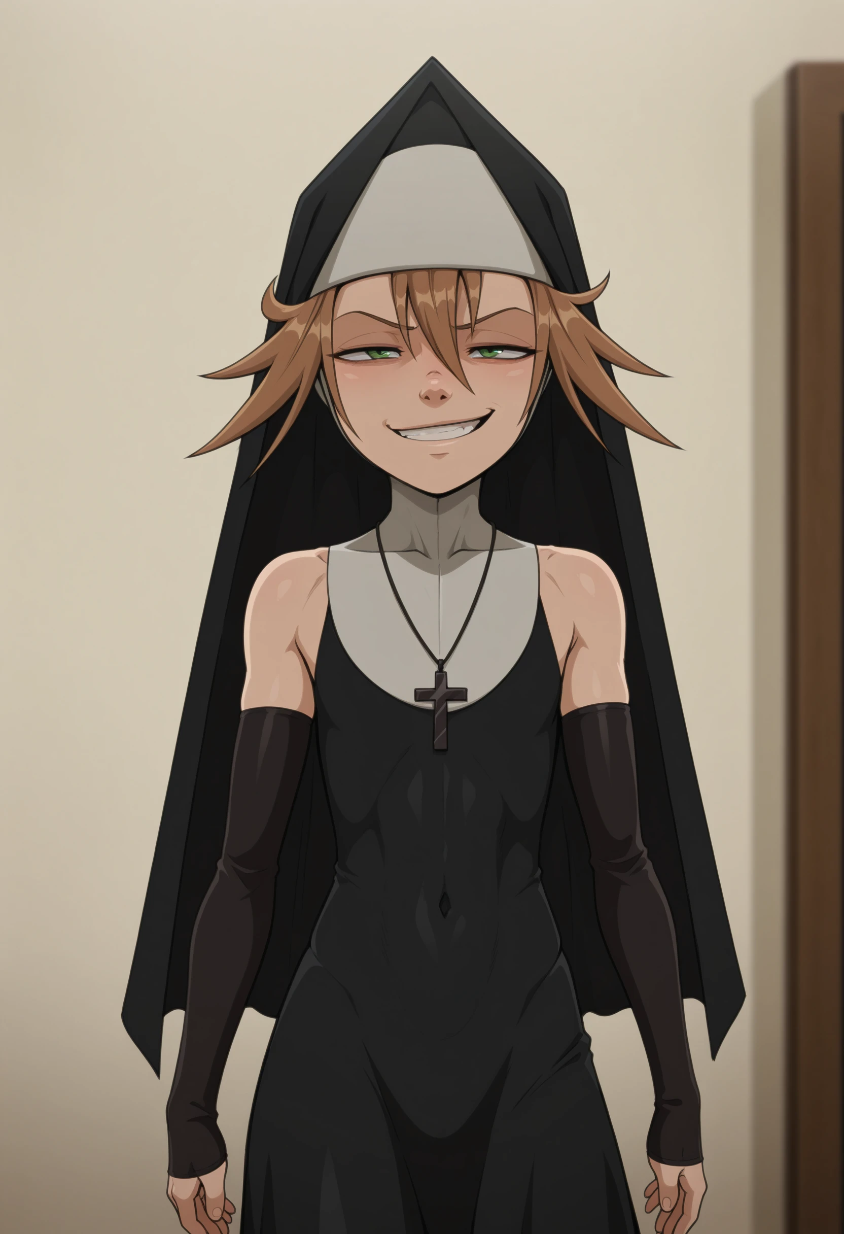 toddy, brown hair, green eyes, habit, nun , nun dress, elbow gloves, cross necklace,