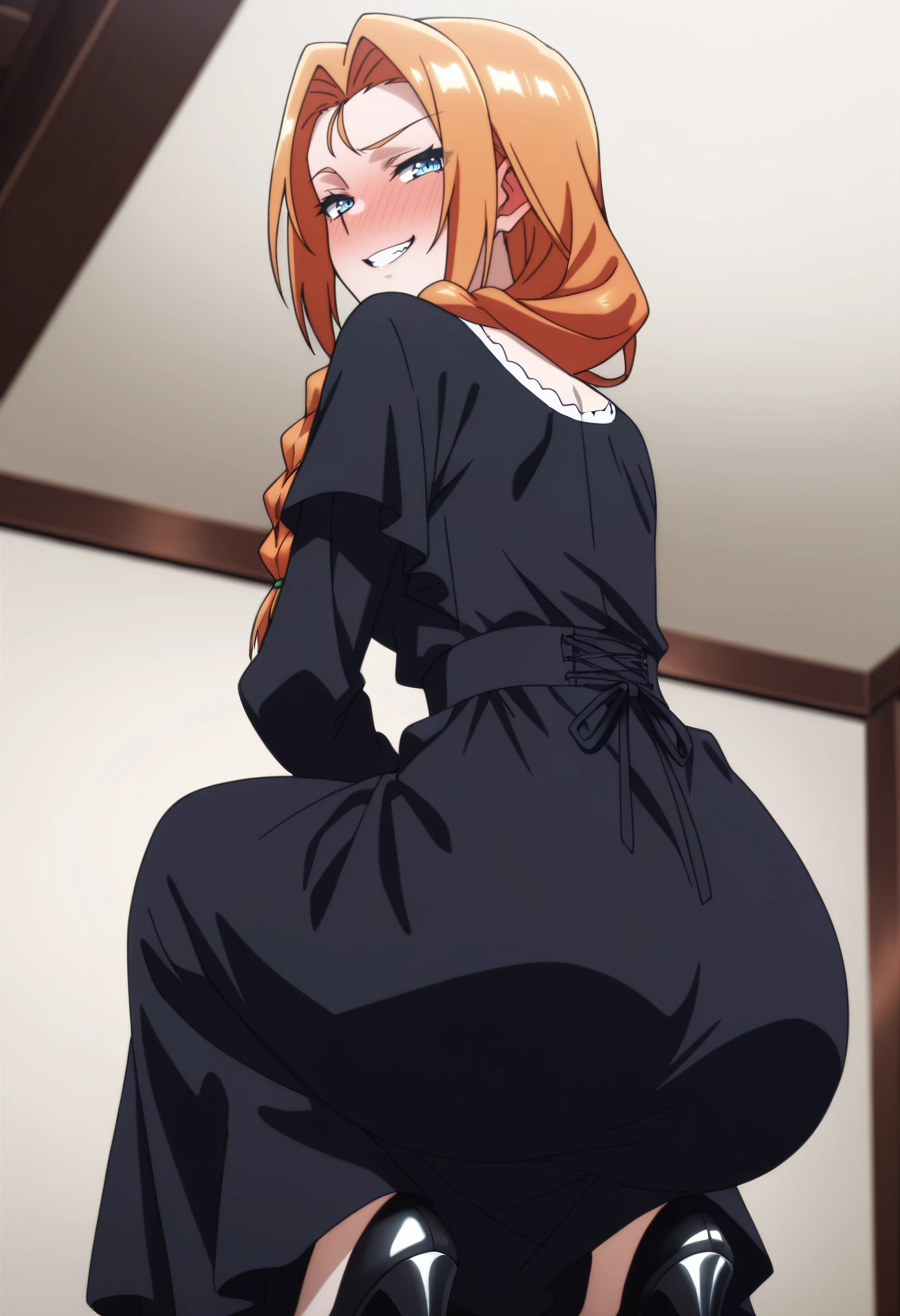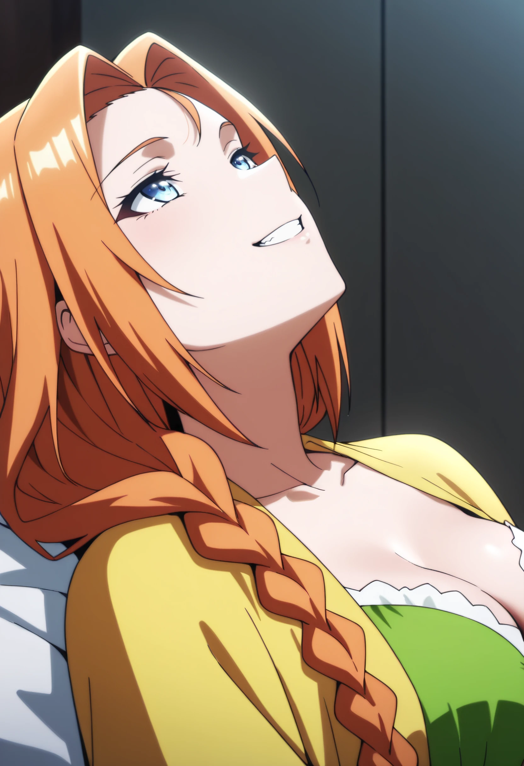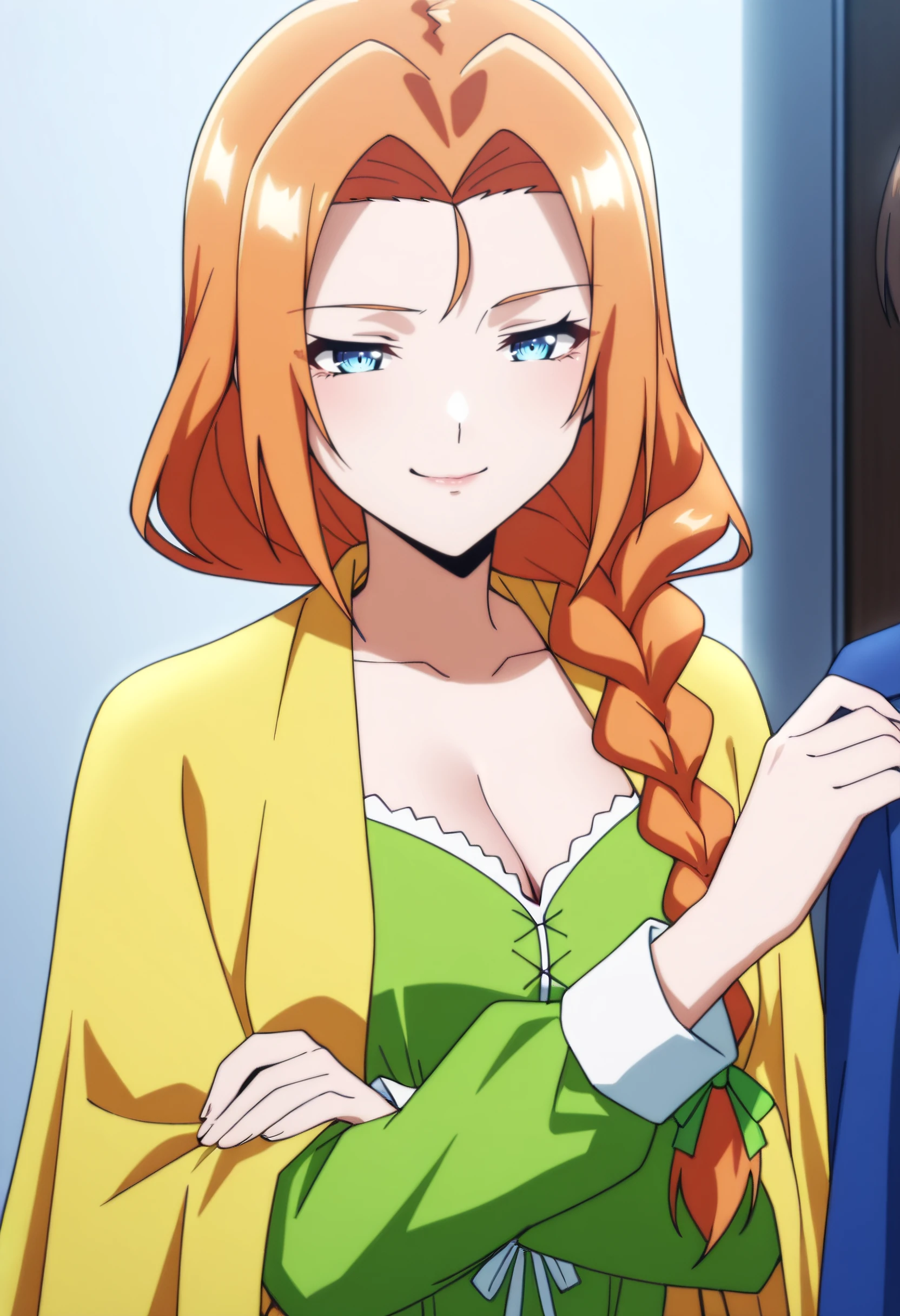 BNBAisha, long hair, blue eyes, braid, bangs, twin braids, hair over shoulder, single braid, orange hair, hair intakes, parted bangs,