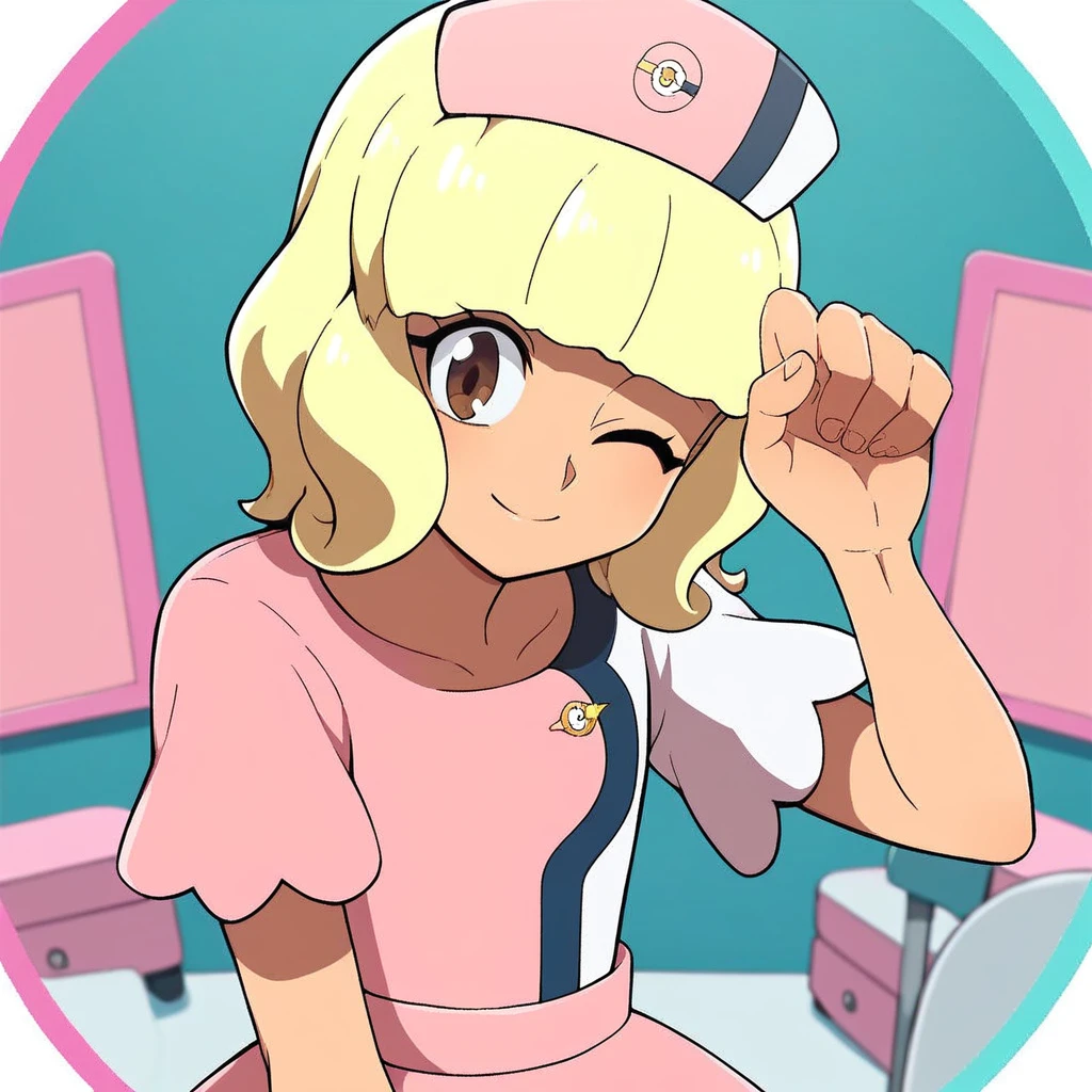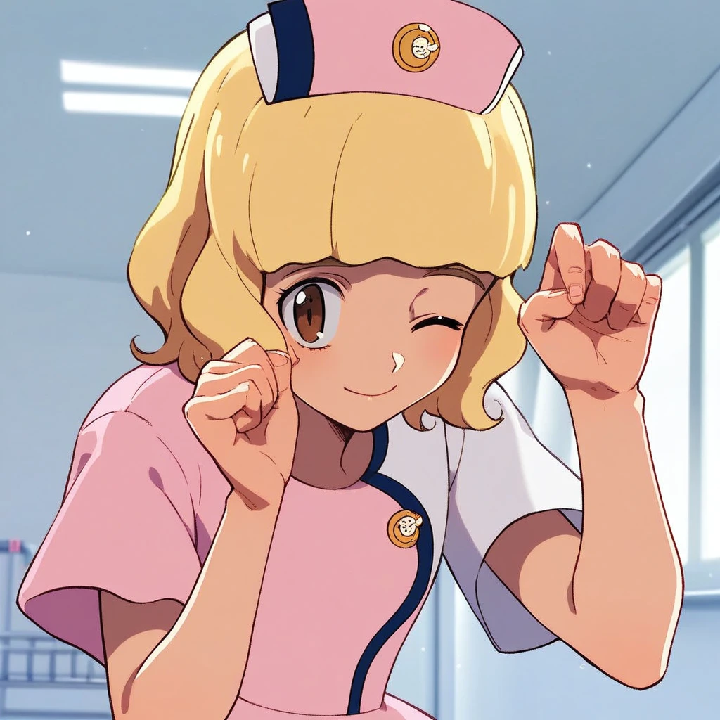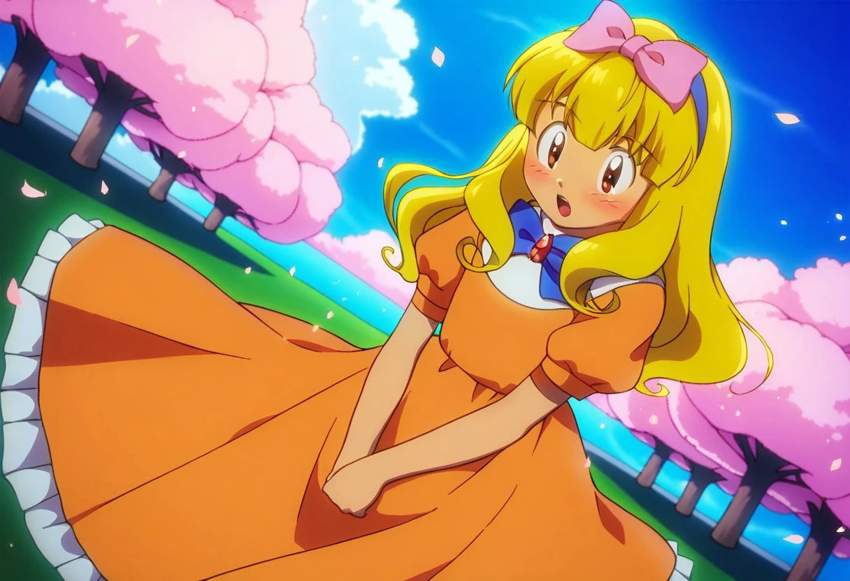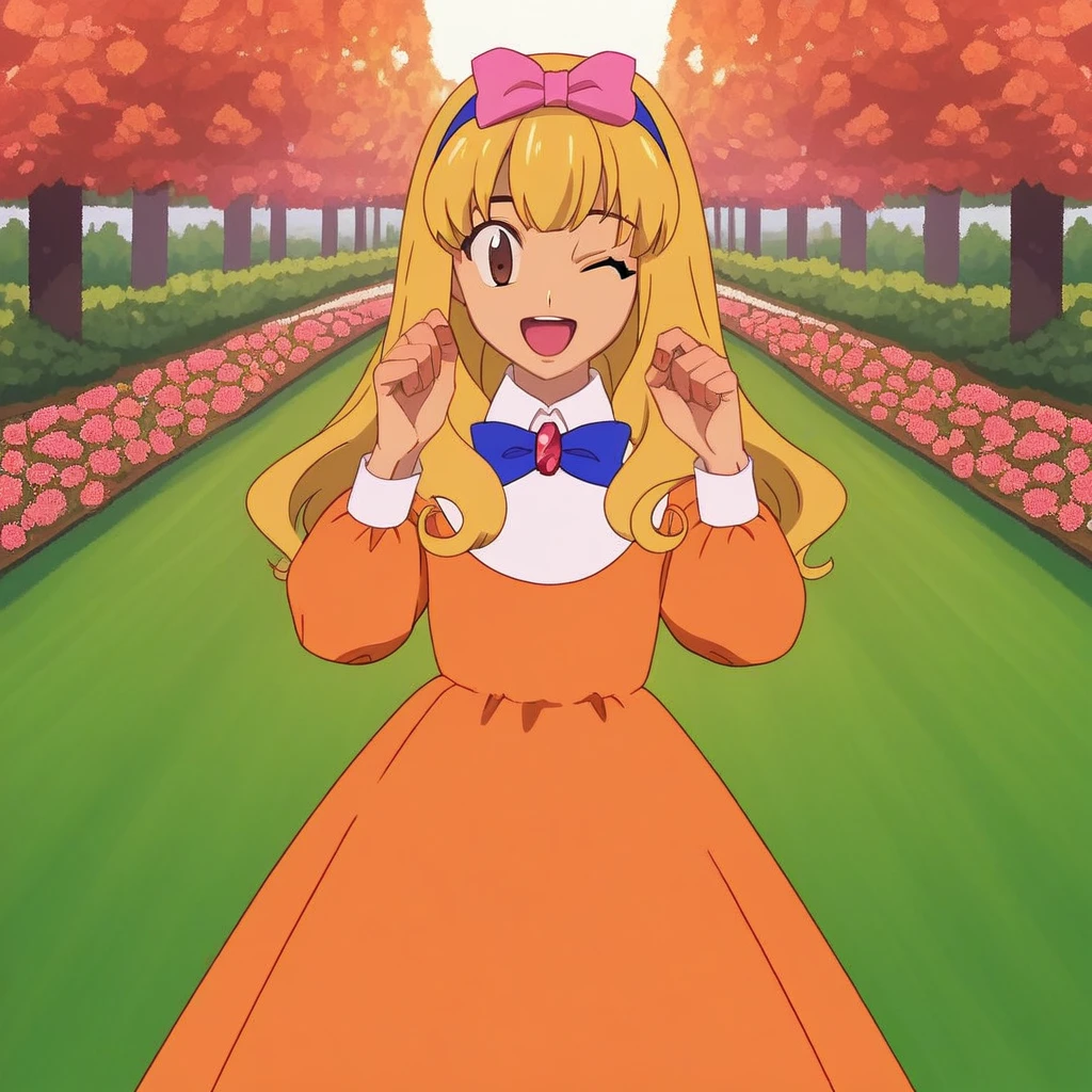 ashley ketchum, blonde hair, long hair, brown eyes, dark blue hairband, pink ribbon