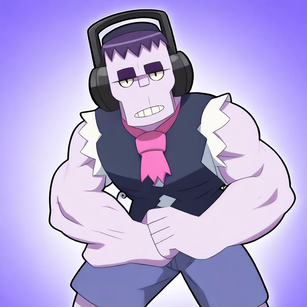 Fr4nkBS, mature male, 1boy, muscular, purple pointed hair, headphones, half closed eyes, dark blue sleeveless vest, sleeveless shirt, lilac skin, pink necktie, blue shorts,