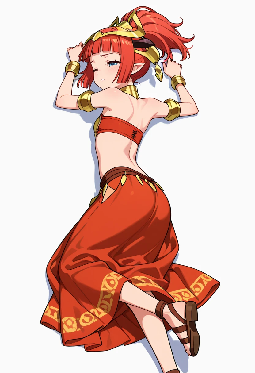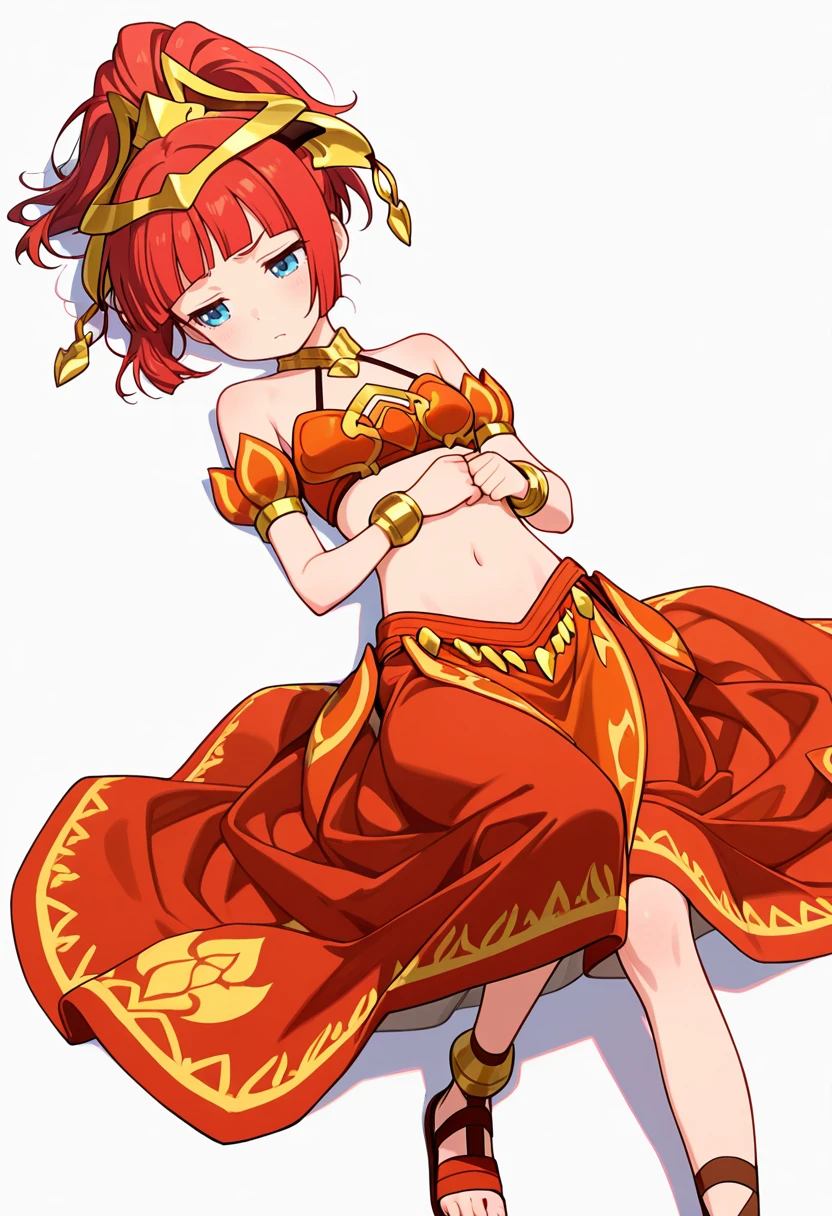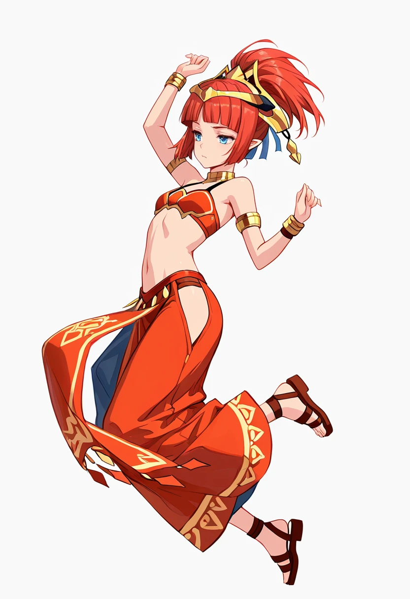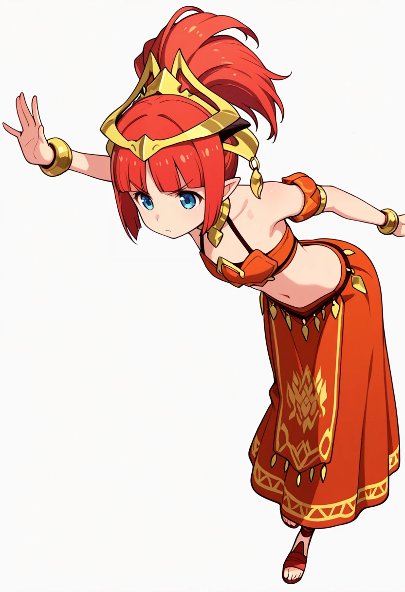 1girl, red hair, blue eyes, short hair, ponytail,blunt bangs,headdress,hair ornament,pointy ears, 👗Signature Outfit