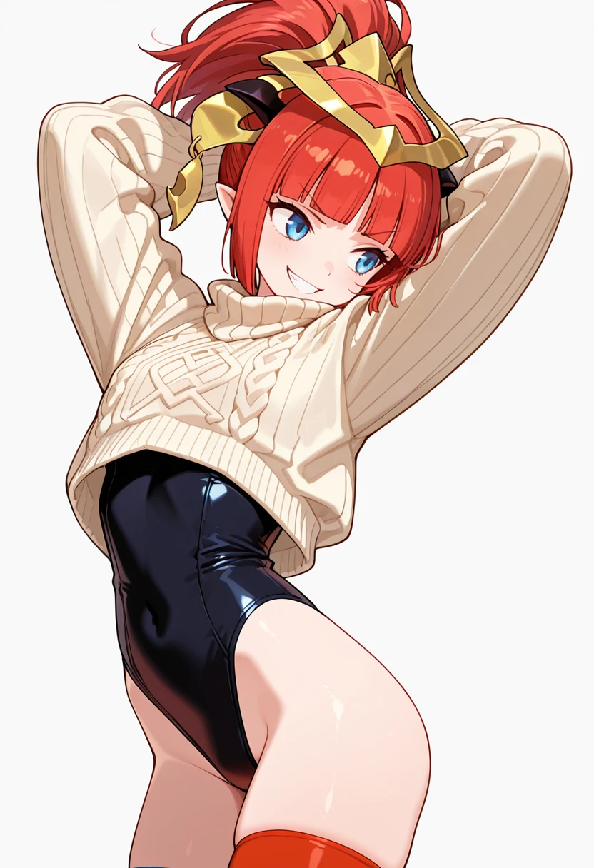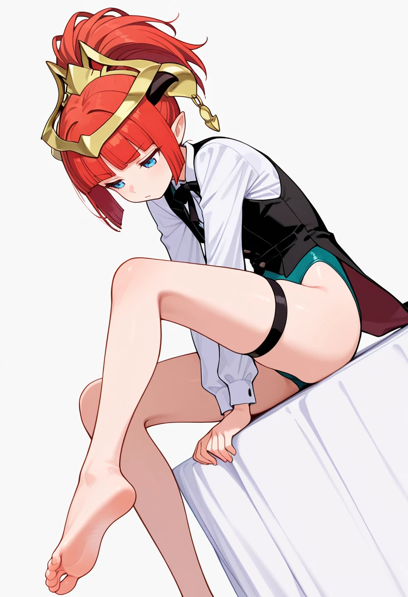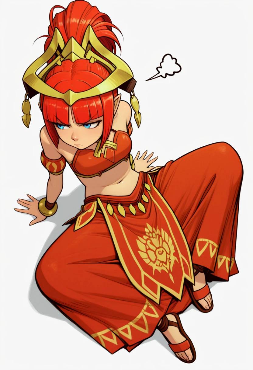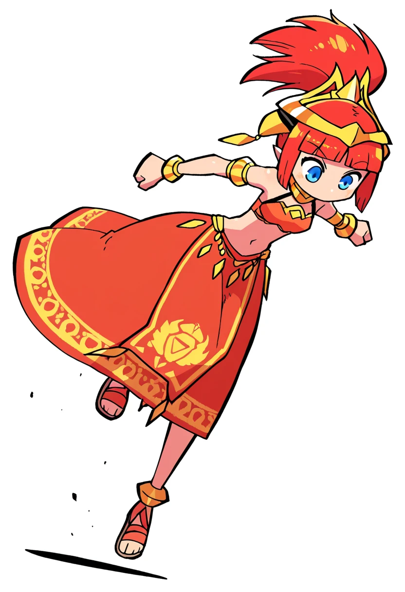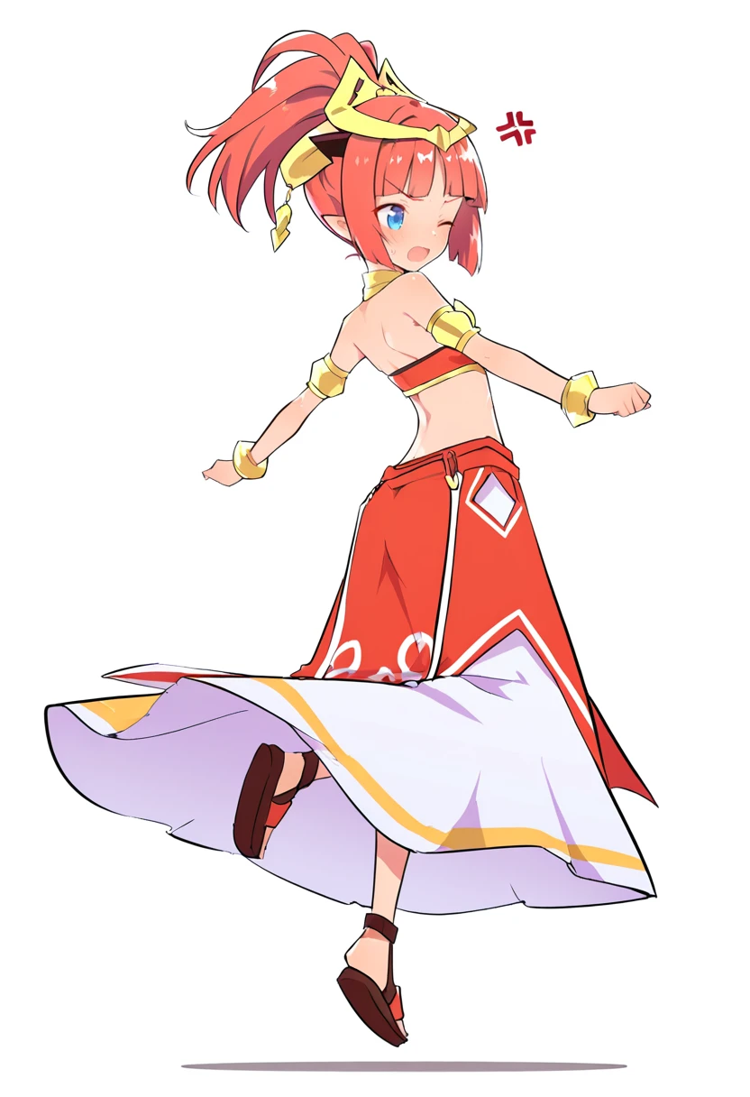 1girl, red hair, blue eyes, short hair, ponytail,blunt bangs,headdress,hair ornament,pointy ears, 👗Signature Outfit