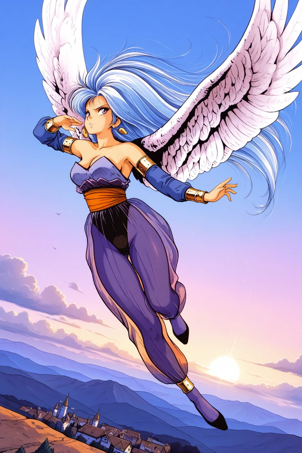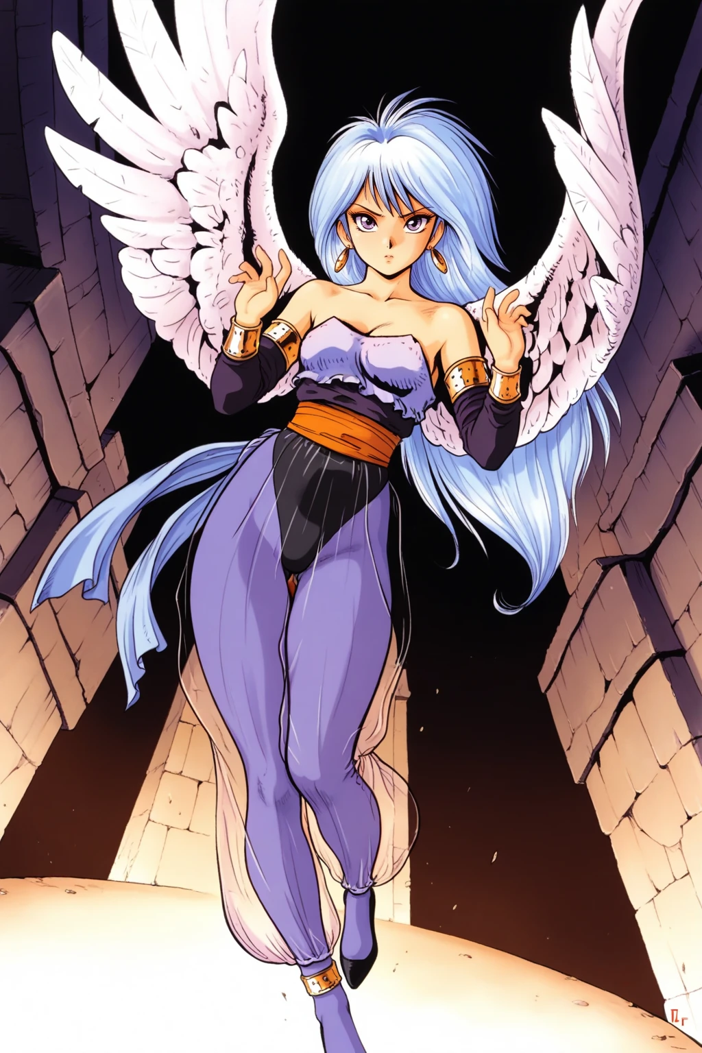 1girl, female focus, long hair, blue hair, earrings, anklet, purple off-shoulder top, gold bracelets, armlets, detached sleeves, black leotard, sash, feathered wings, angel wings, transparent harem pants, purple pantyhose, black shoes