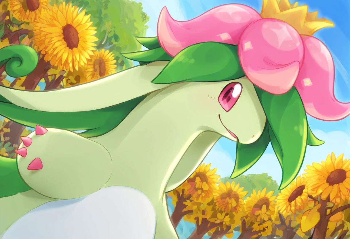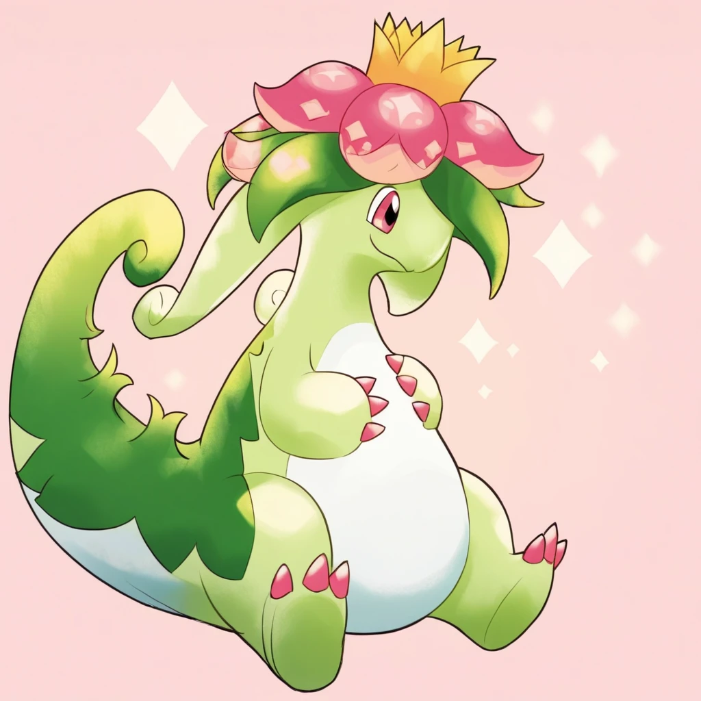 Dinossom_Palworld, pink eyes, white belly, green body, flower, tail, pink claws, flower
