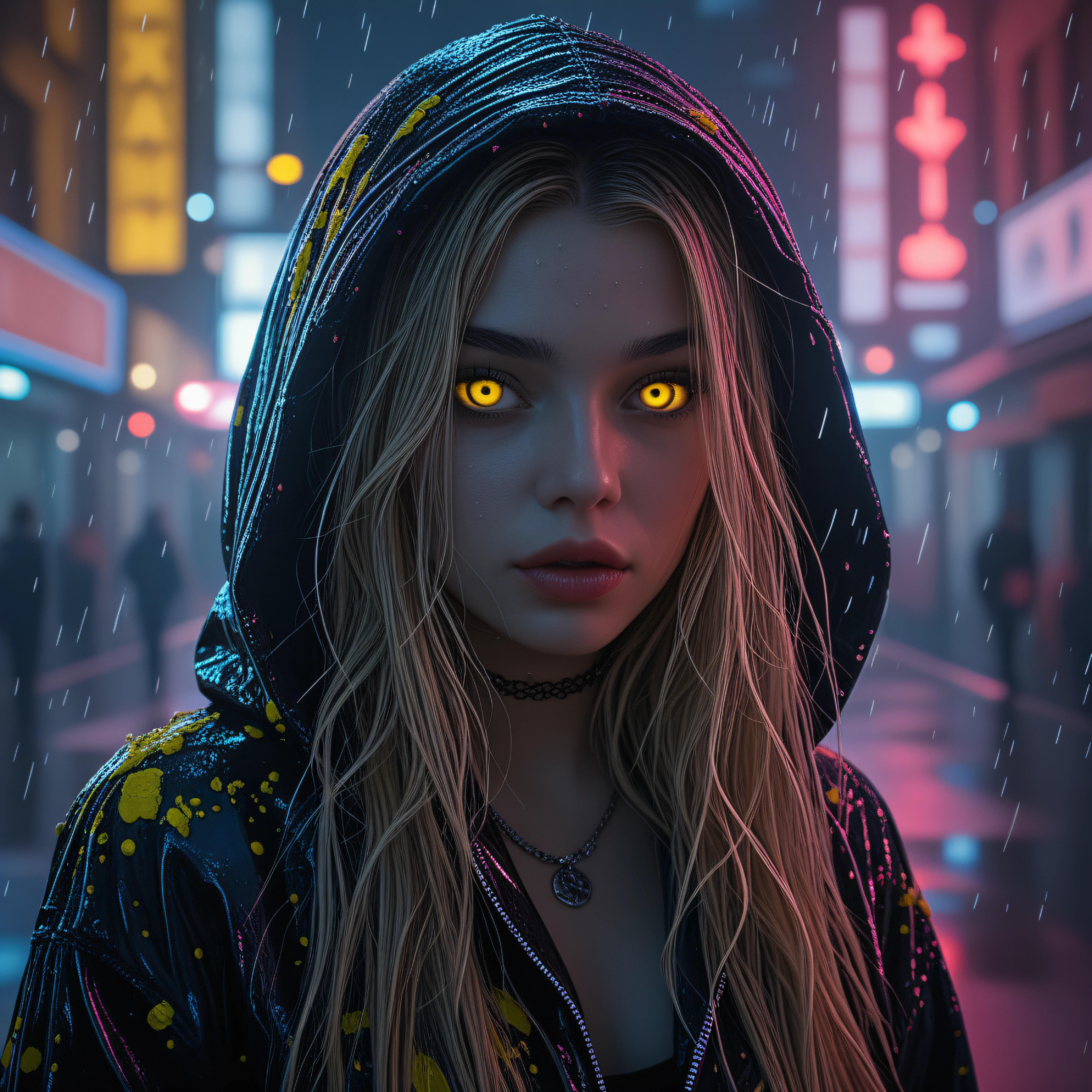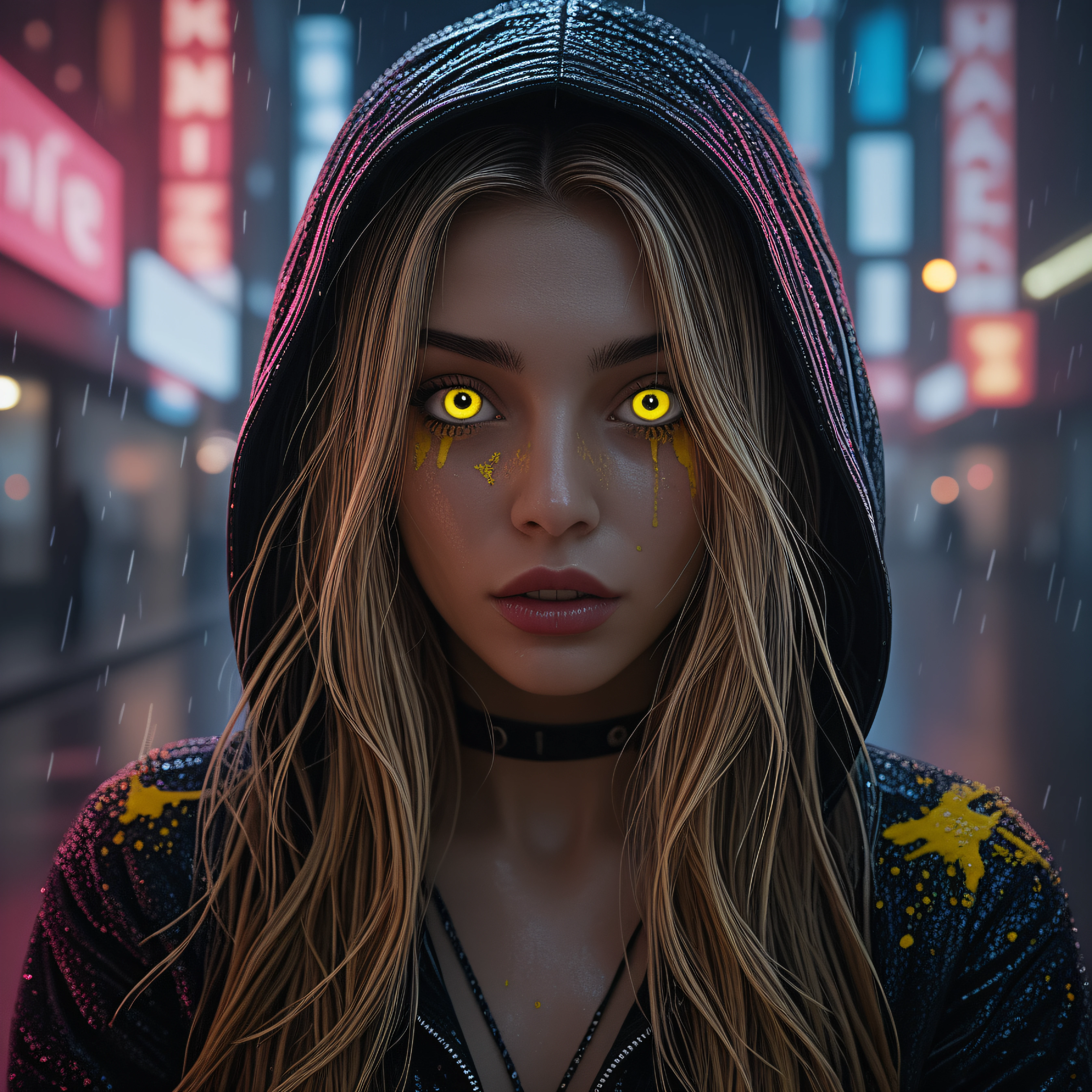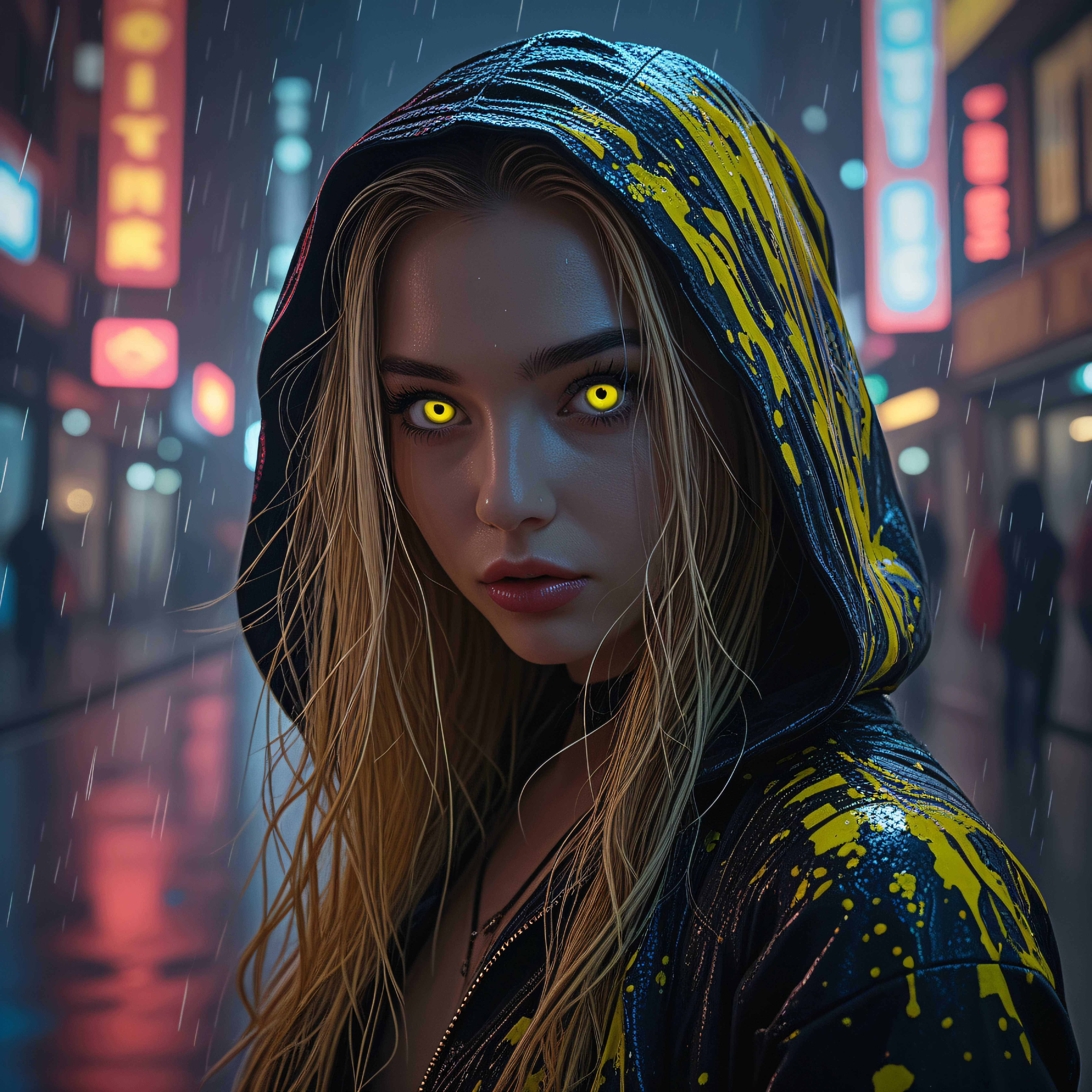 This LoRA is trained on a highly detailed cyberpunk style girl with distinct character traits: glowing yellow eyes, a wet glossy hooded jacket with yellow accents, long blonde hair, and an atmospheric neon rainy city in the background.