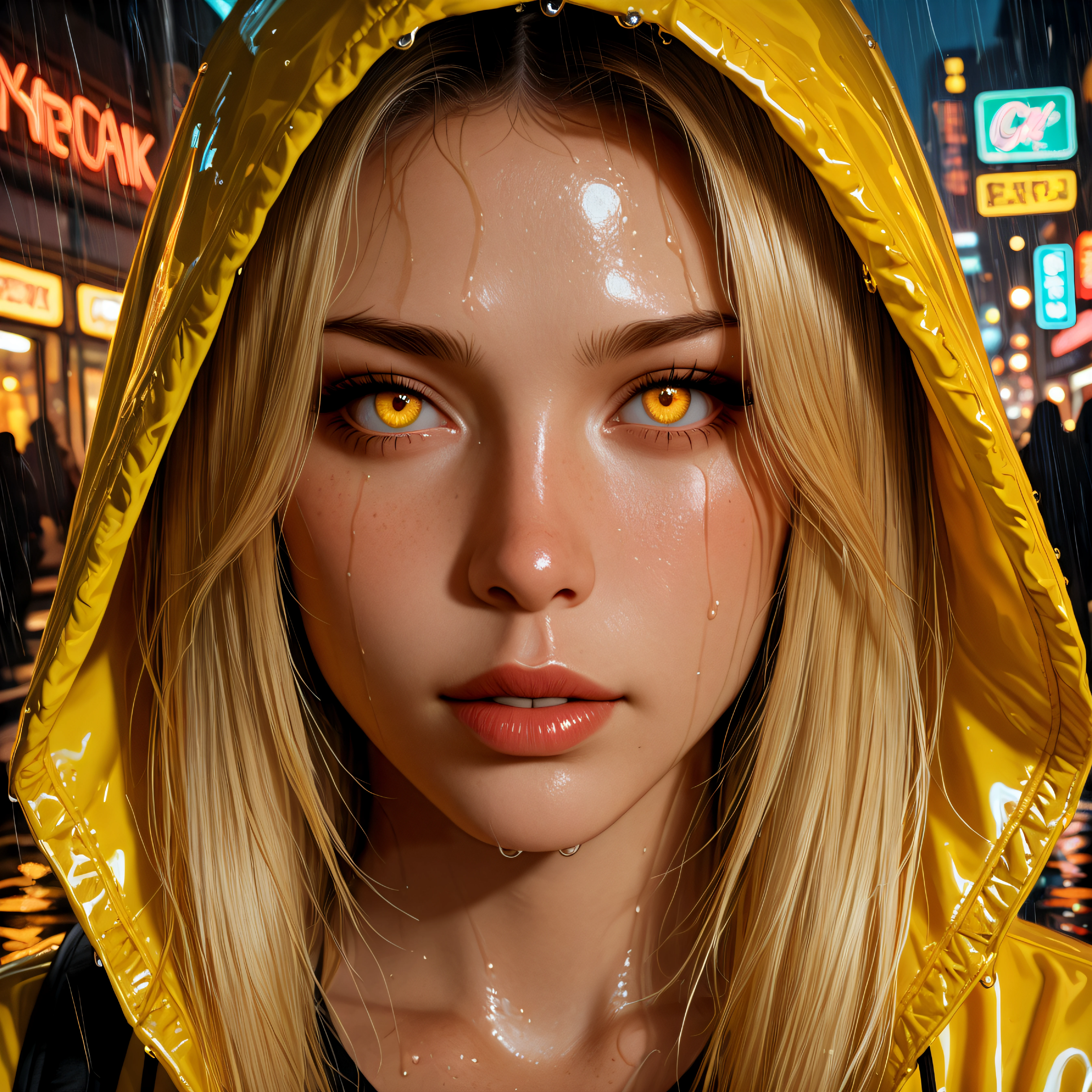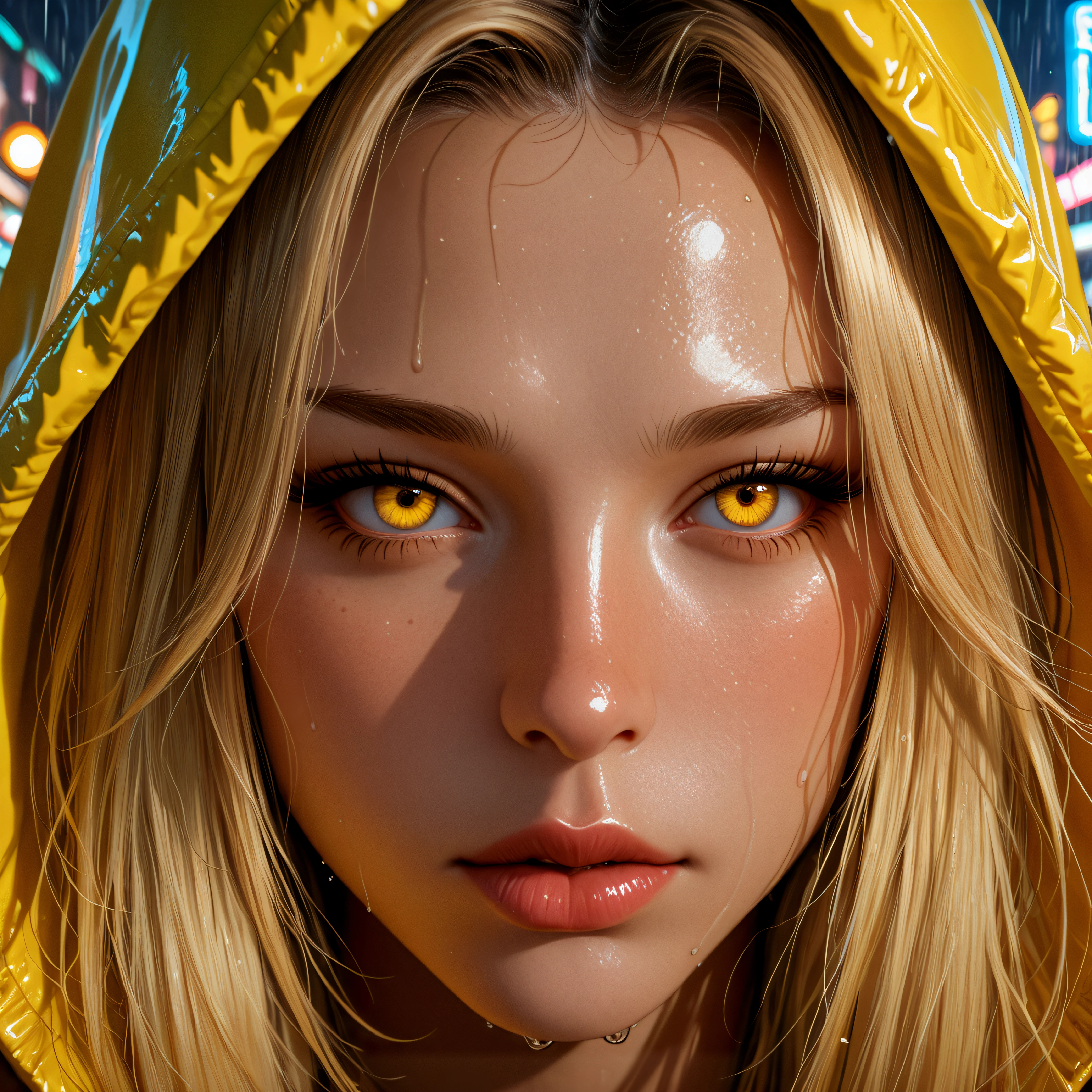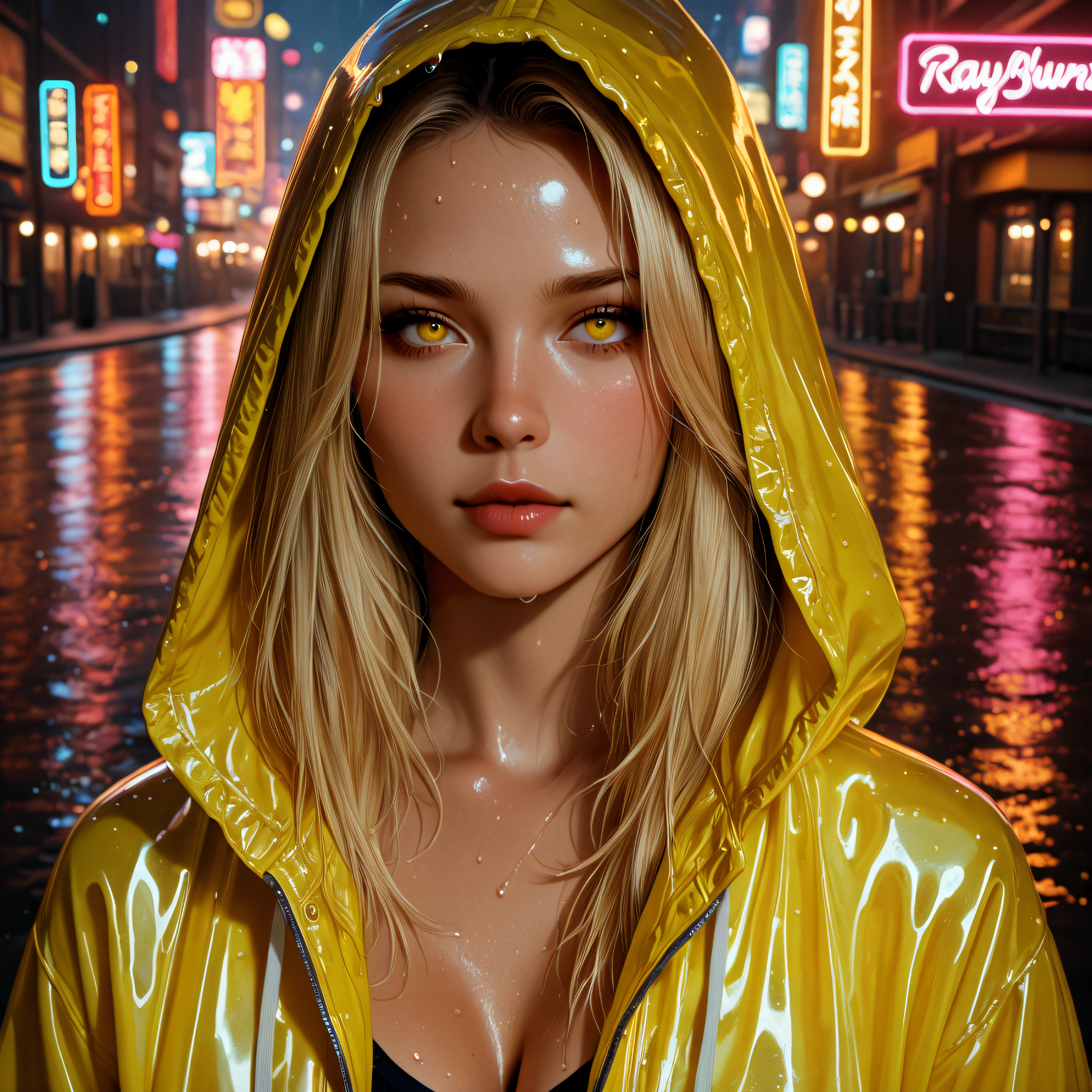 This LoRA is trained on a highly detailed cyberpunk style girl with distinct character traits: glowing yellow eyes, a wet glossy hooded jacket with yellow accents, long blonde hair, and an atmospheric neon rainy city in the background.