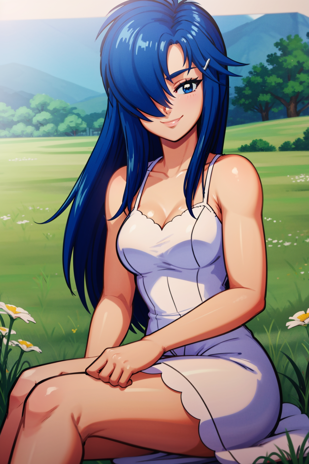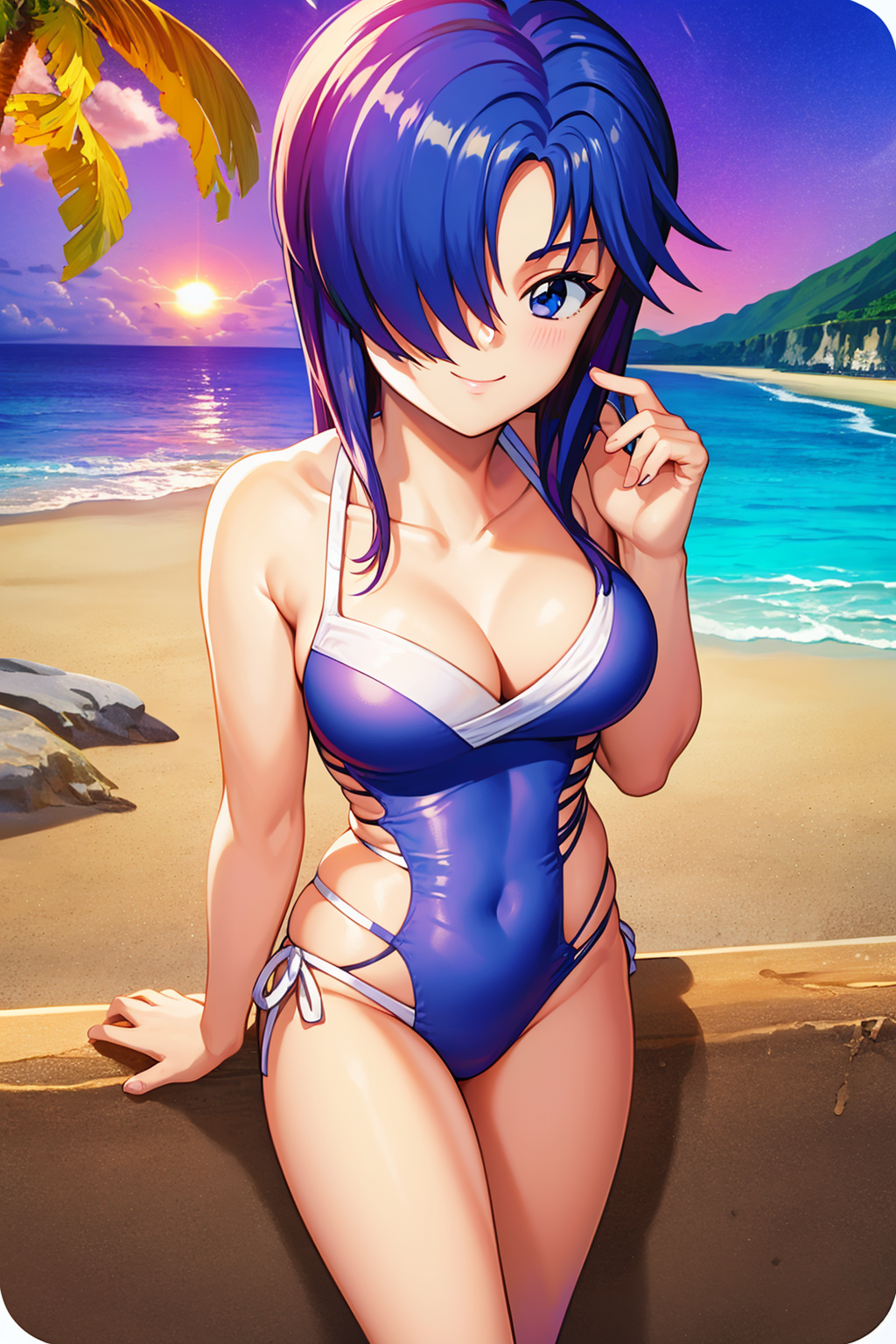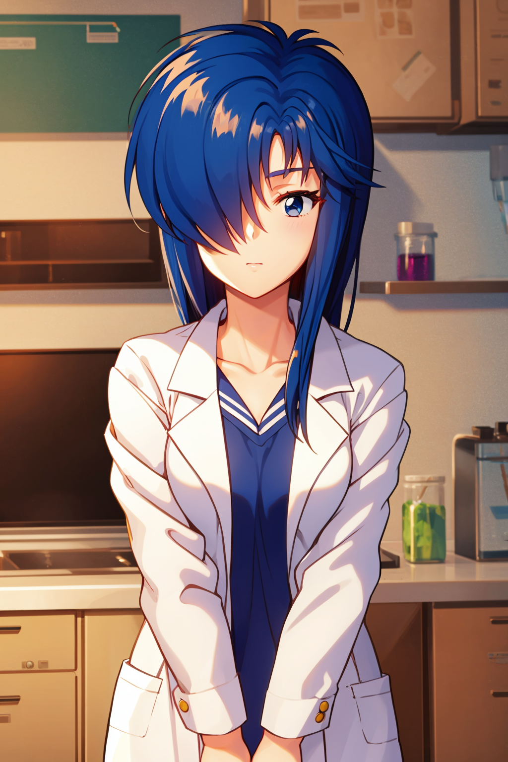 Other prompts : blue eyes, blue hair, hair over one eye,