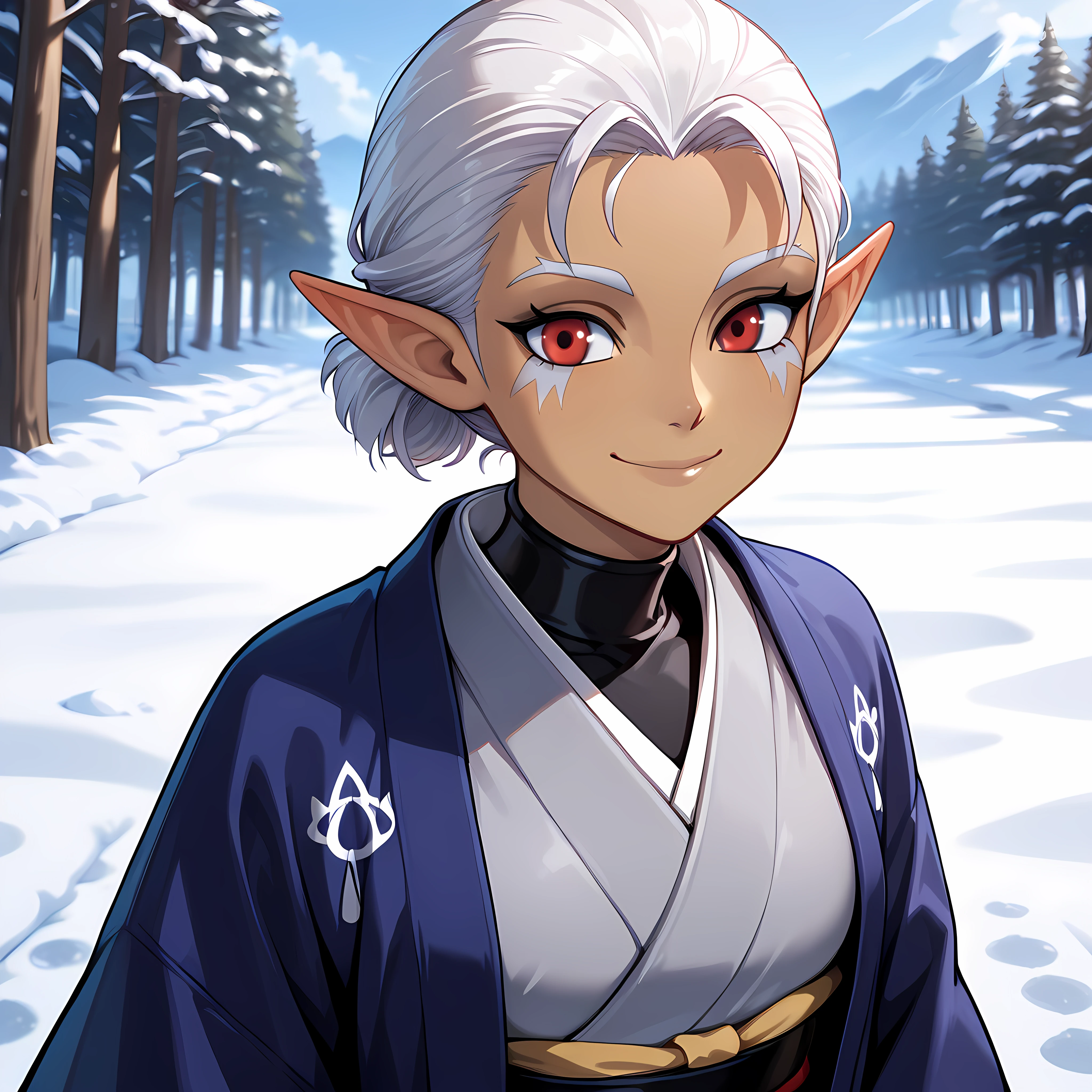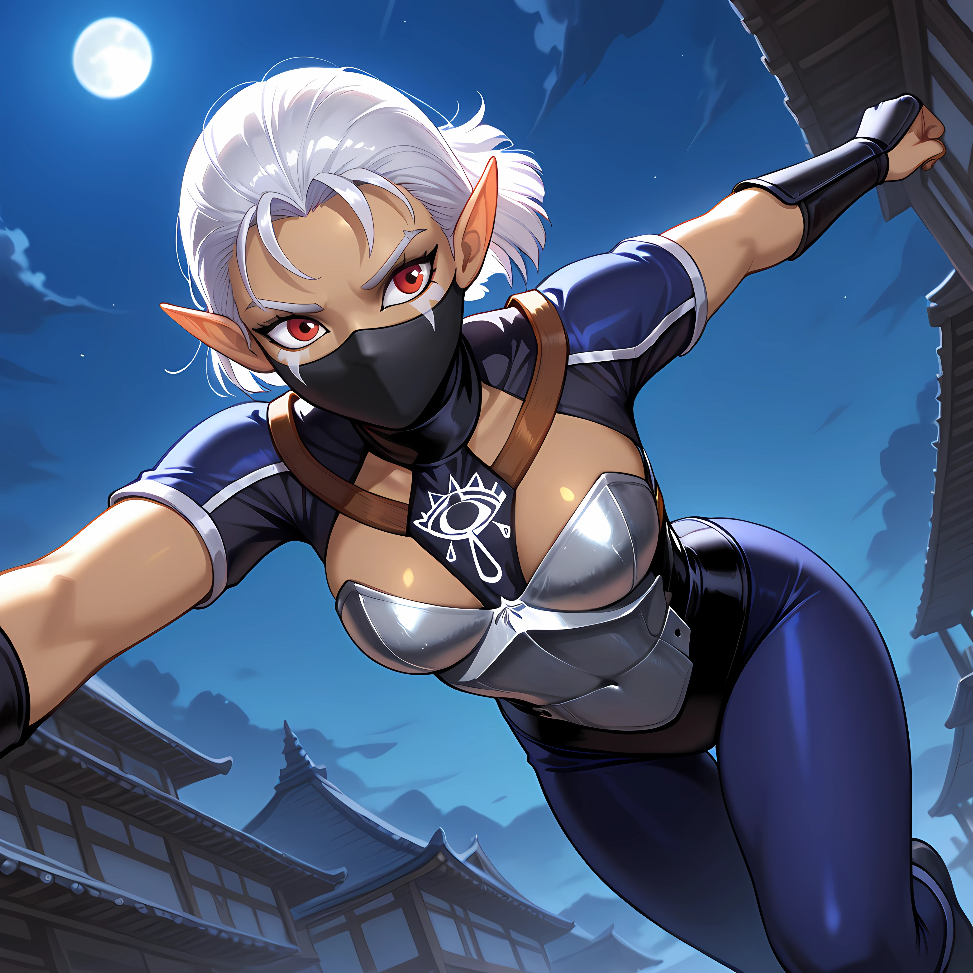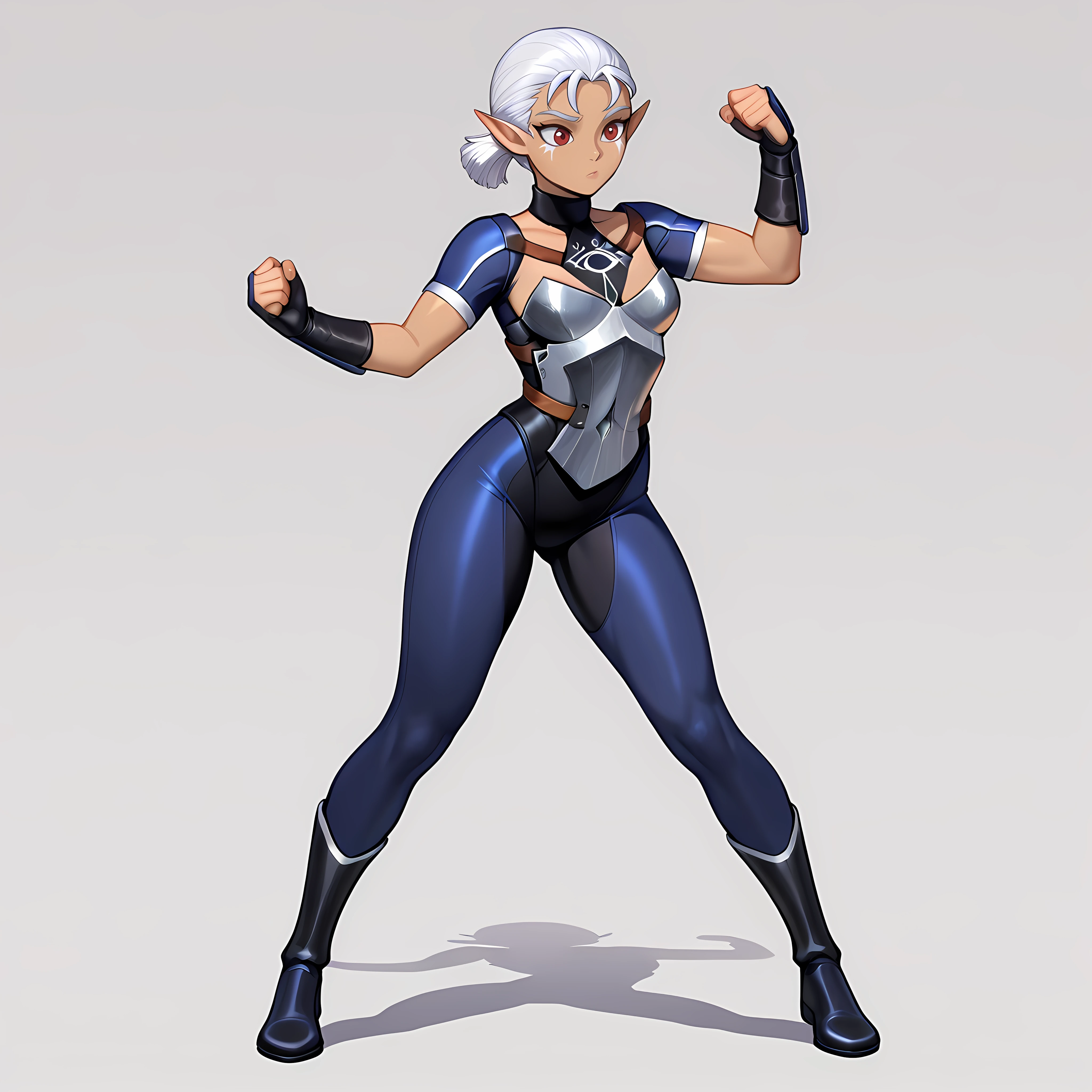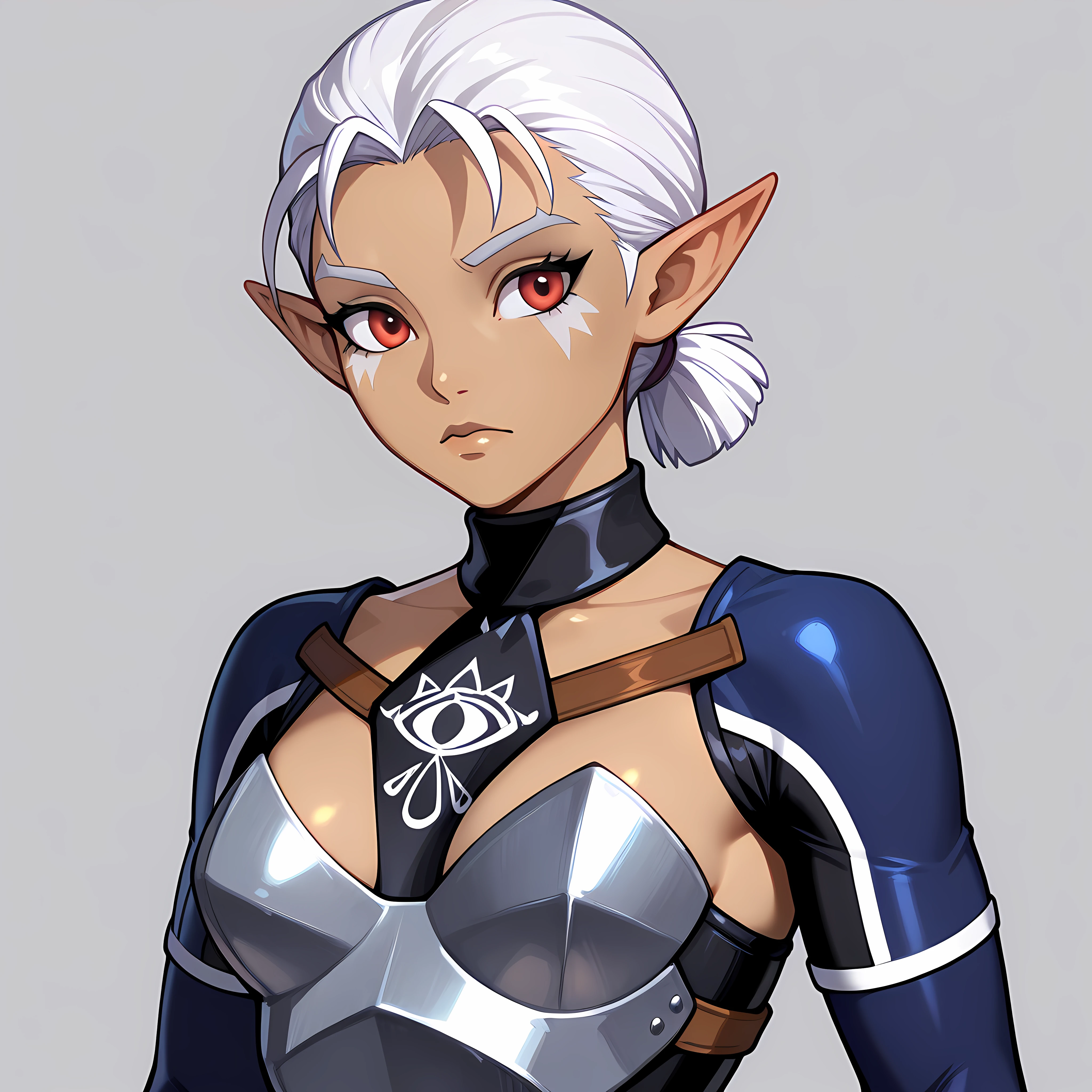 Optional: Red eyes, pointy ears, dark skin white hair, short hair, eye marks, blue bodysuit, chestplate