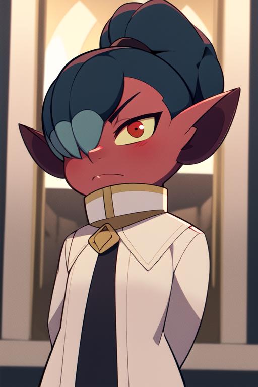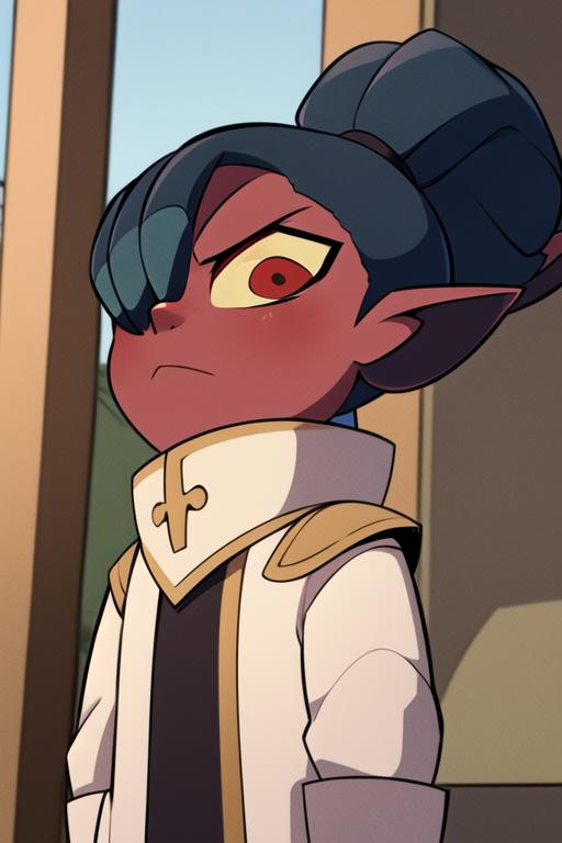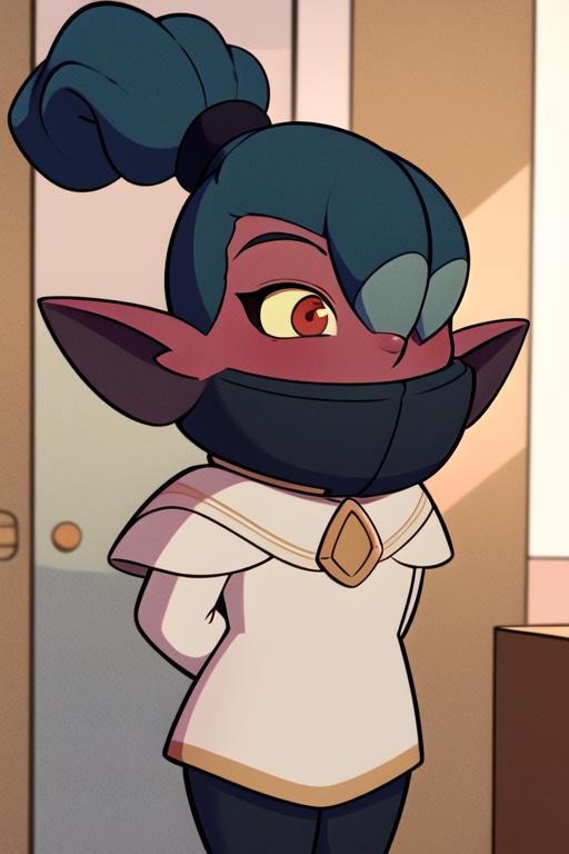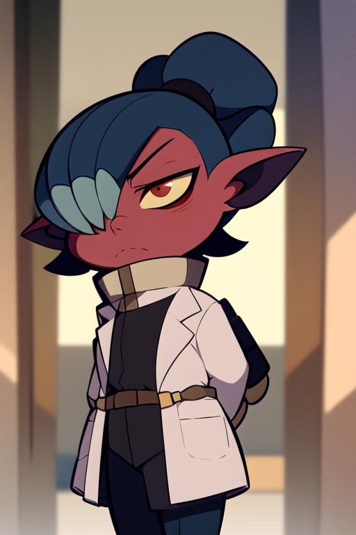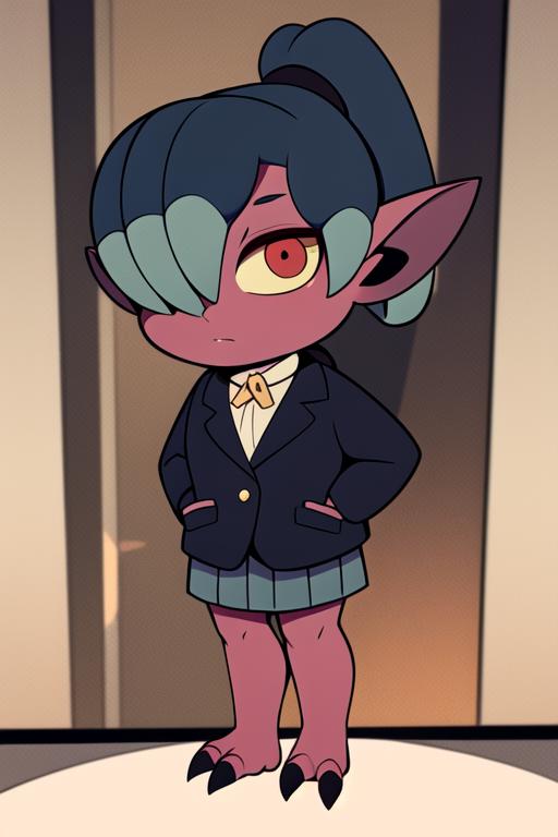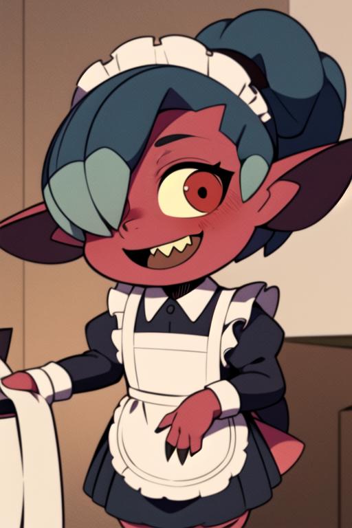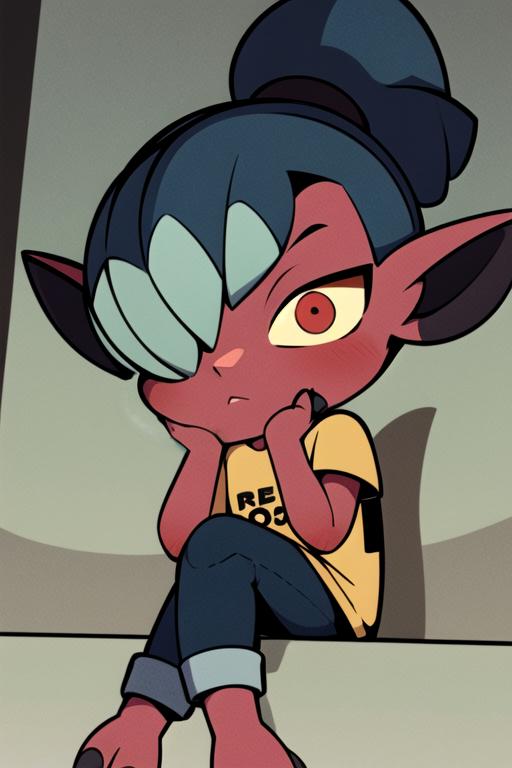 kikimora, monster girl, dwarf, red skin, ponytail, hair over one eye, yellow sclera, red eyes, no humansThe model has issues with Kikimora's height, who is originally small. To correct it, you can use 'dwarf' or 'female child'