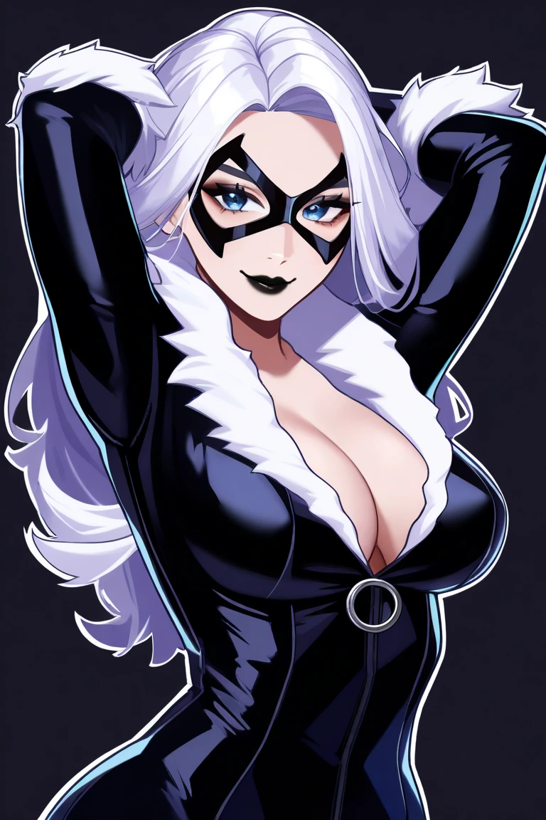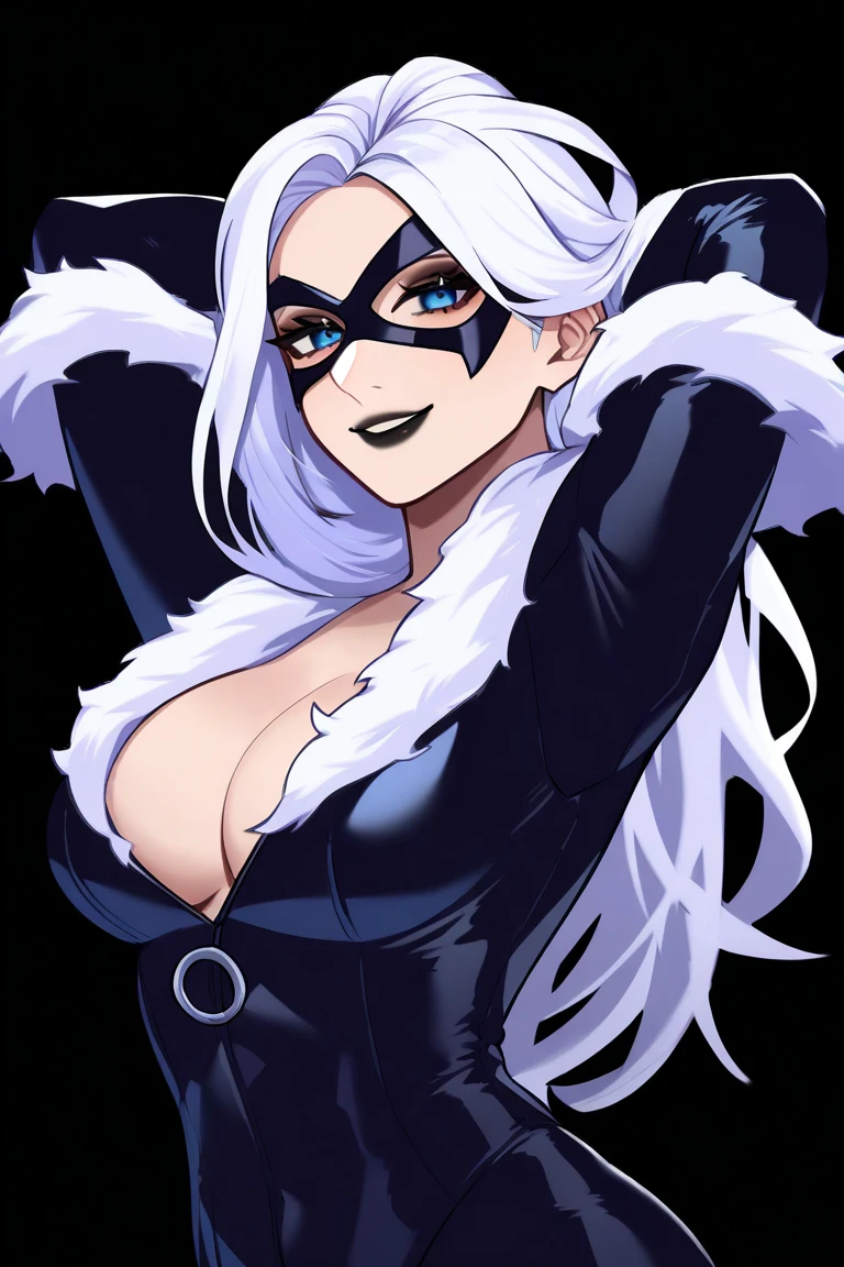 felici4, 1girl, long hair, white hair, large breasts, (mask), domino mask, blue eyes, black lips, makeup, lipstick, smile,