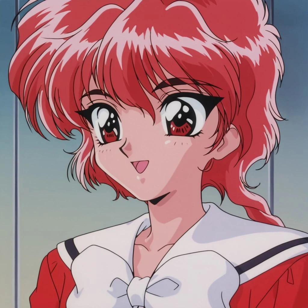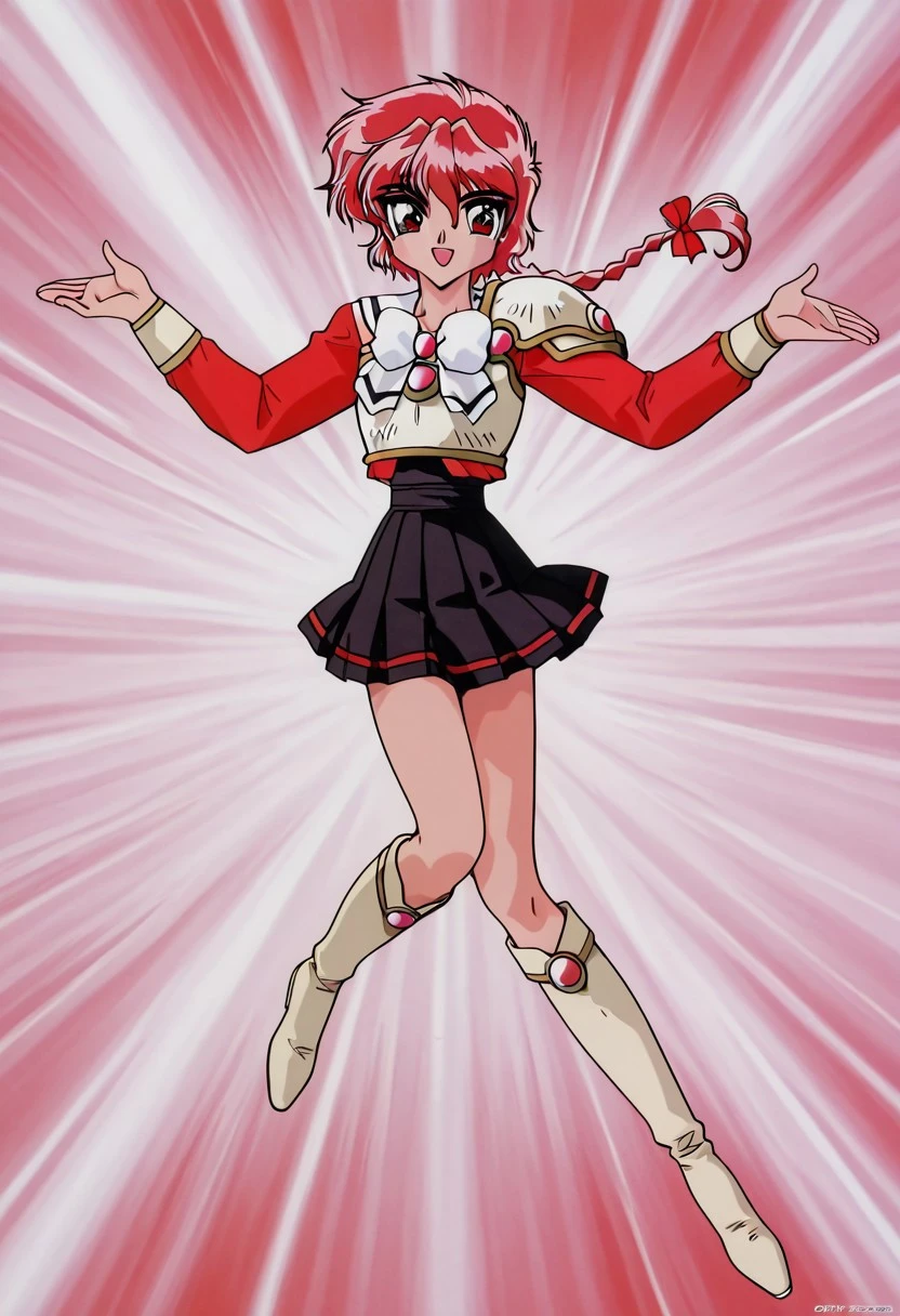 1girl ,solo, Hikaru Shidou, red eyes, short hair, red hair, braid, single braid, red hairbow, school uniform, blazer, white bow, sailor collar, black and red pleatered skirt, red socks, black loafer,1990s (style), retro artstyle, official style,
