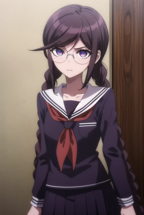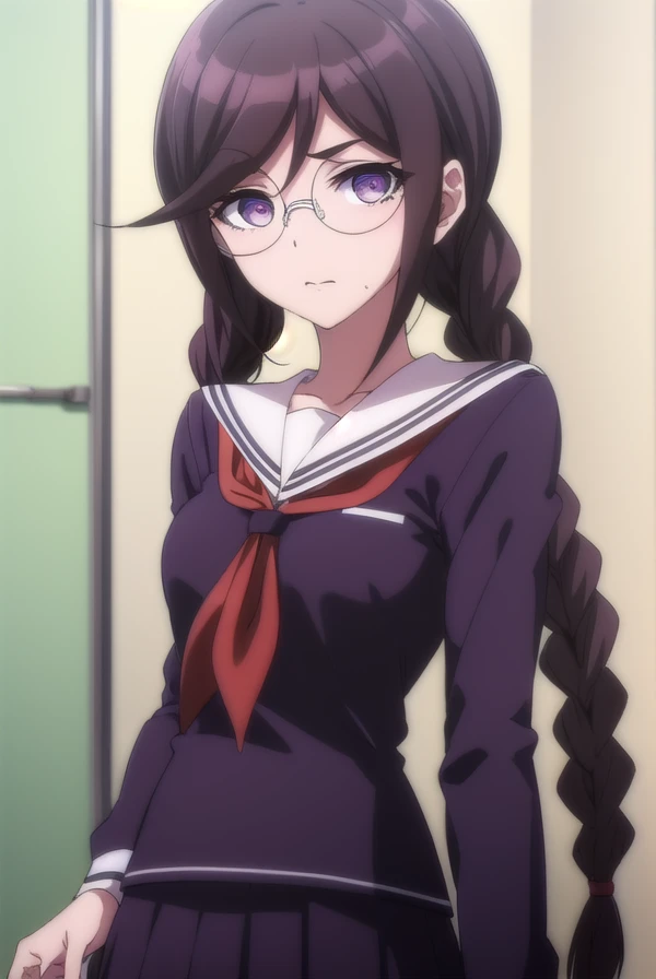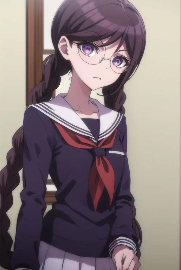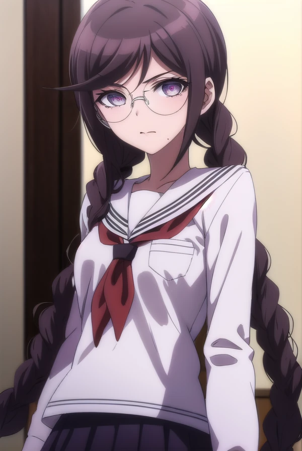 touko fukawa, long hair, bangs, brown hair, braid, glasses, mole, twin braids, mole under mouth, round eyewear, (brown eyes:1.3),