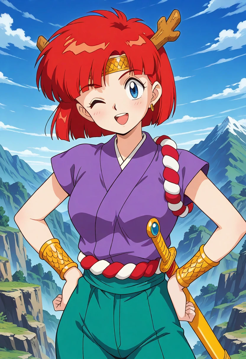 red hair, short hair, horns, bangs, blue eyes, headband, single earring