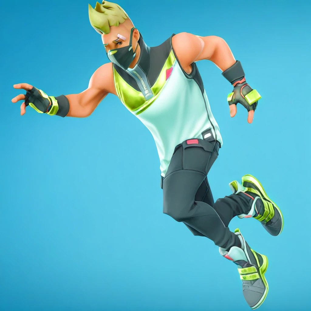 • drift_fortnite, bandaid on eyebrow, blonde spiky hair, brown eyes, black face mask, white tank top, high collar with zipper, dark shoulder accent, black cargo pants, pink accents, gold accents, grey sneakers with gold straps, black fingerless gloves with gold wrist guards, sleeveless,