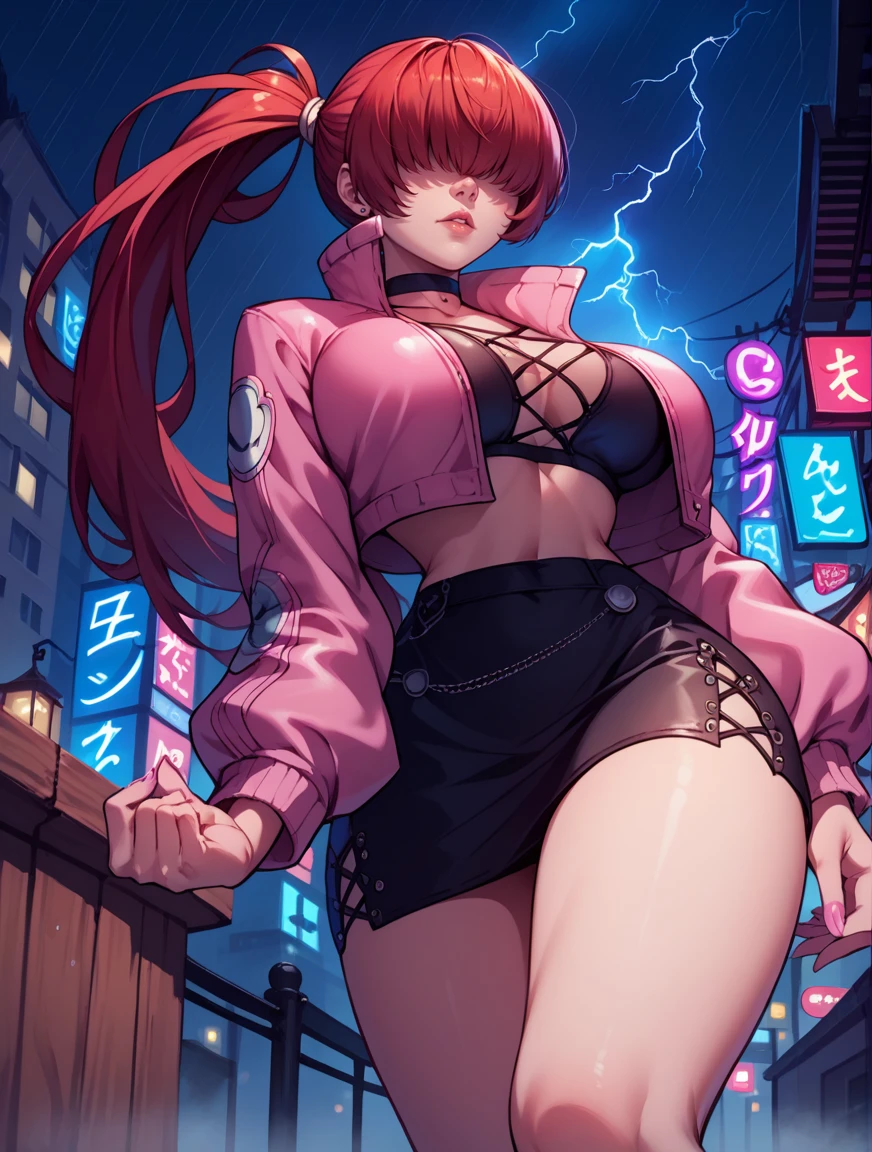split ponytail, long hair, bangs, hair over eyes,red hair,