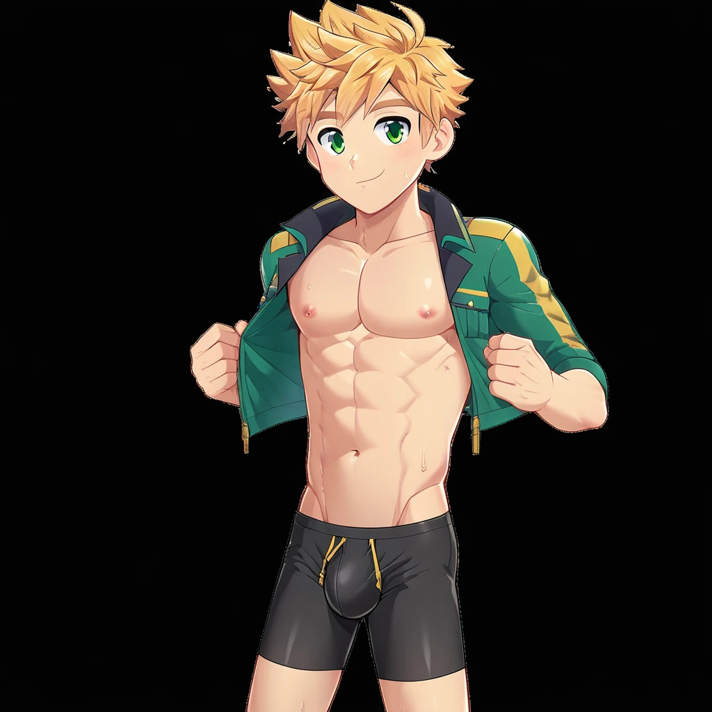 hikarishi_kenji_v2, blond hair, short hair, spiky hair, bangs, green eyes, 1boy, solo, solo focus