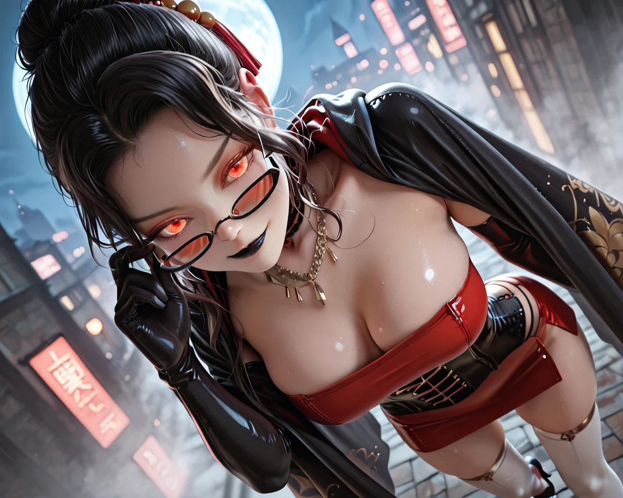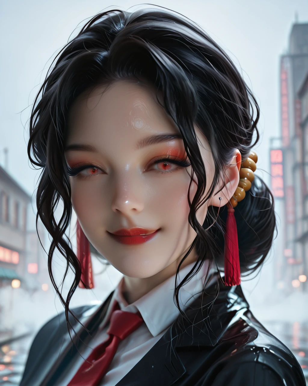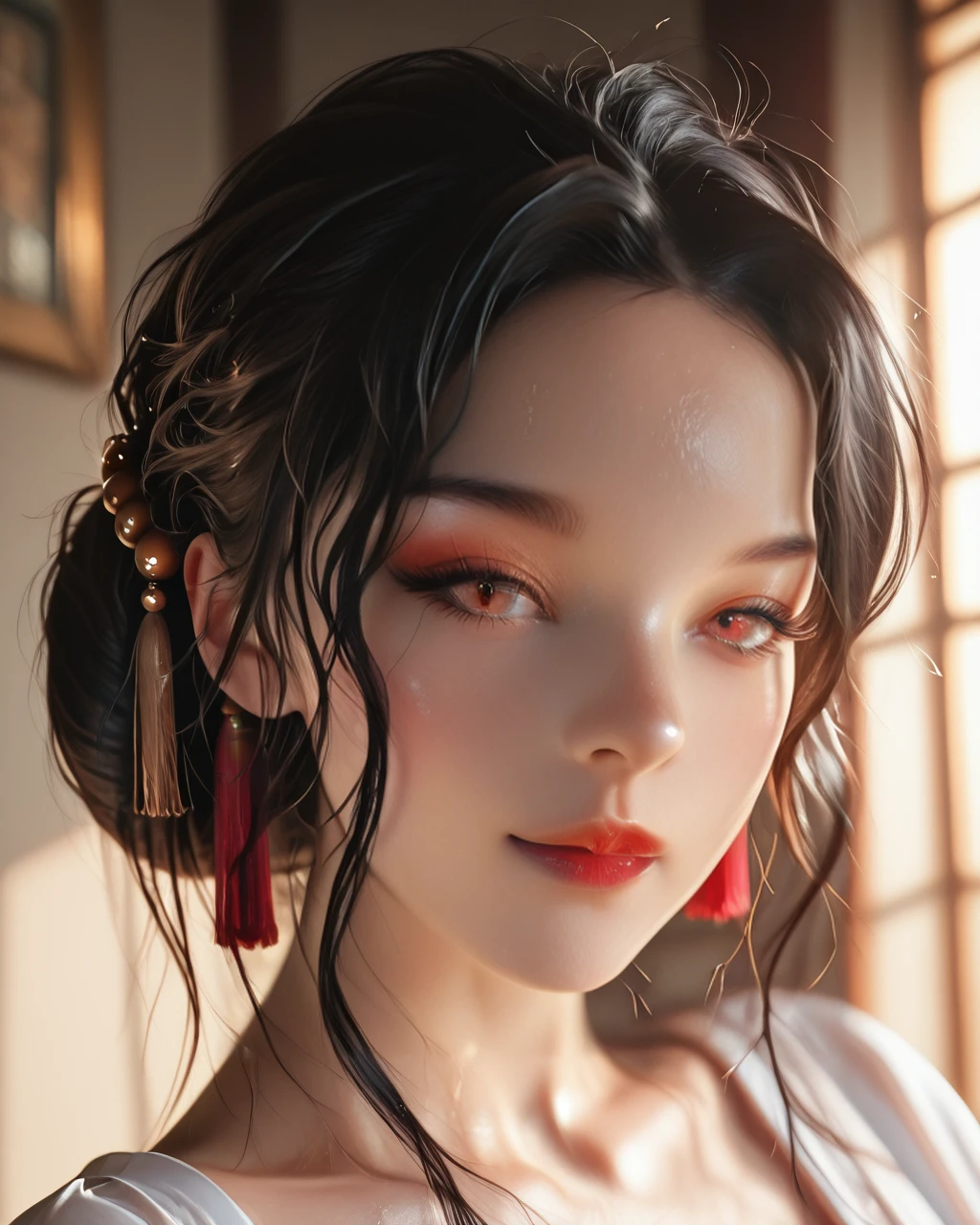 black hair, hair ornament, red eyes, hair bun, red lips,