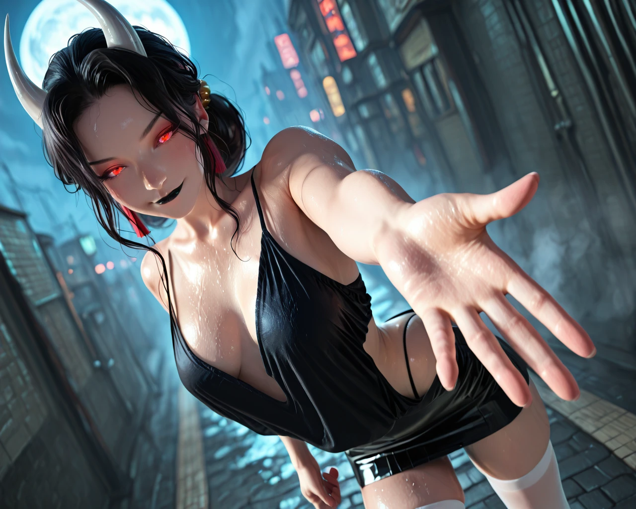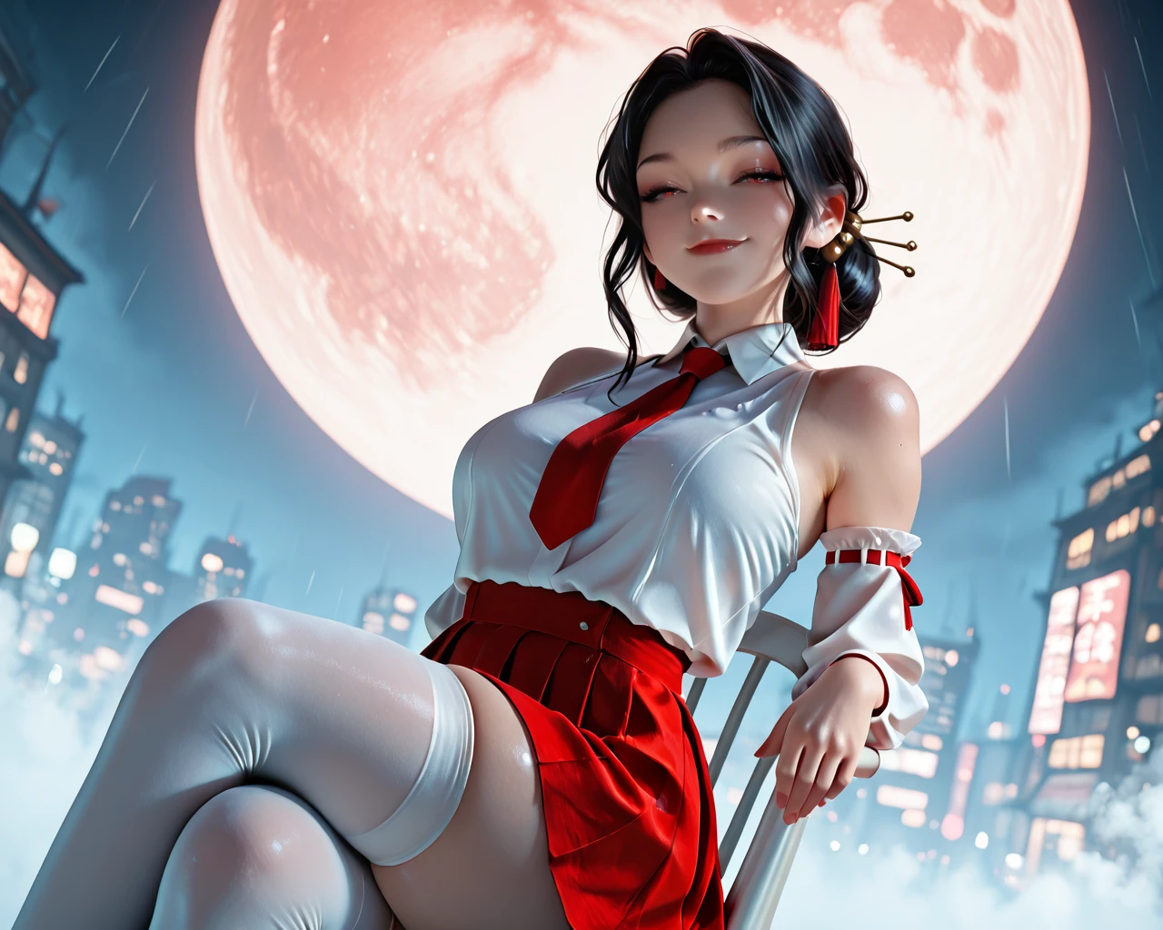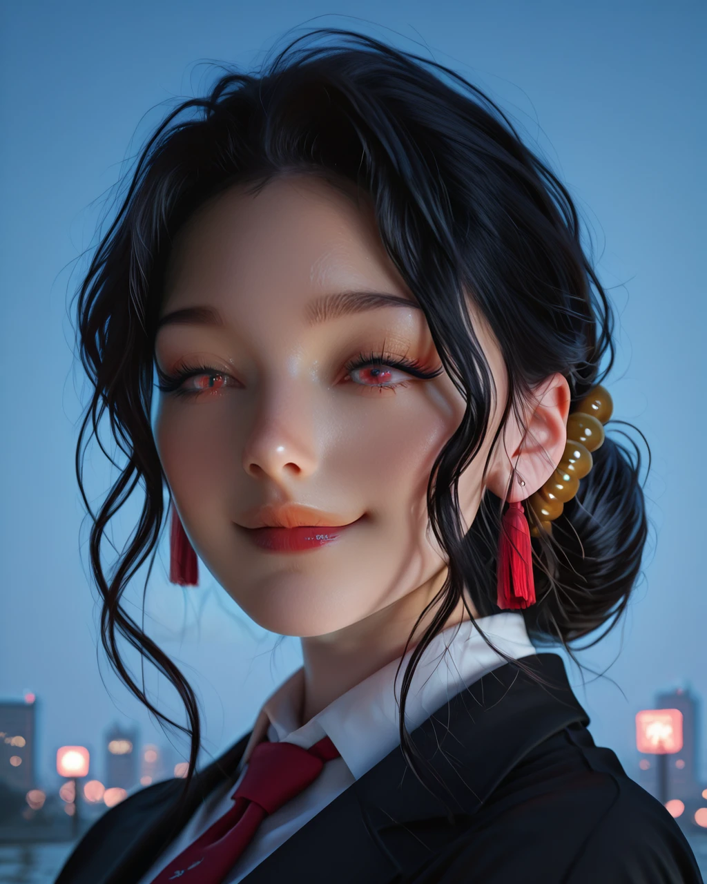 black hair, hair ornament, red eyes, hair bun, red lips,