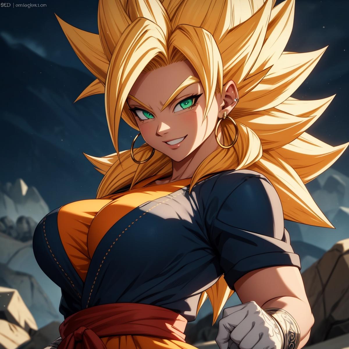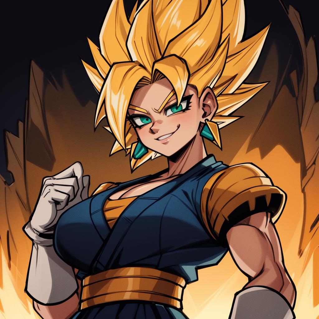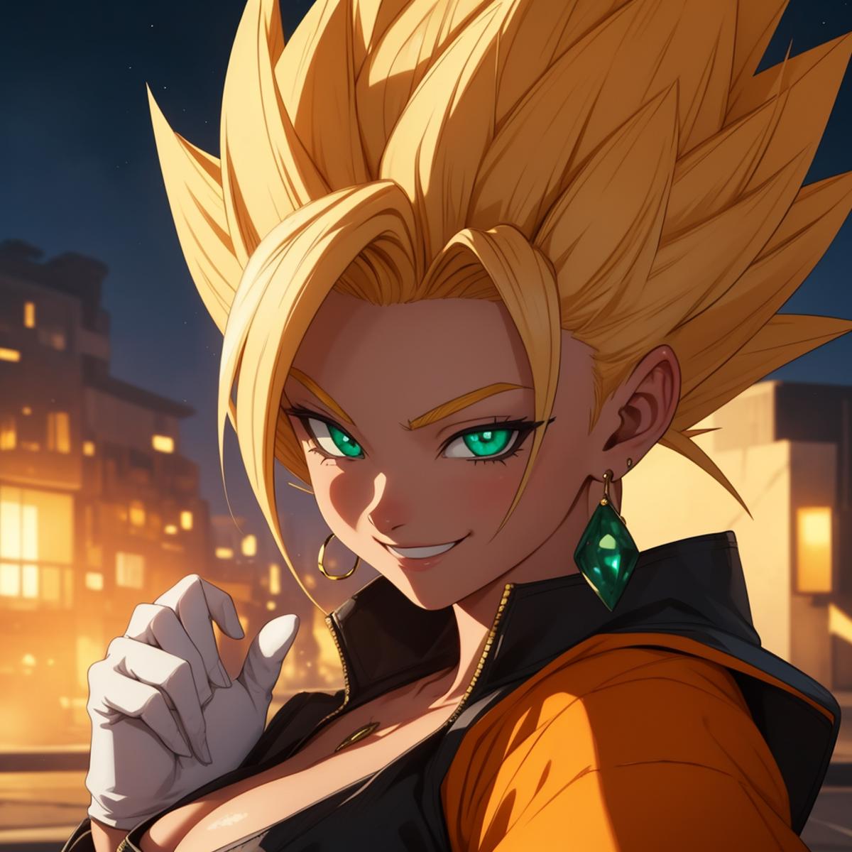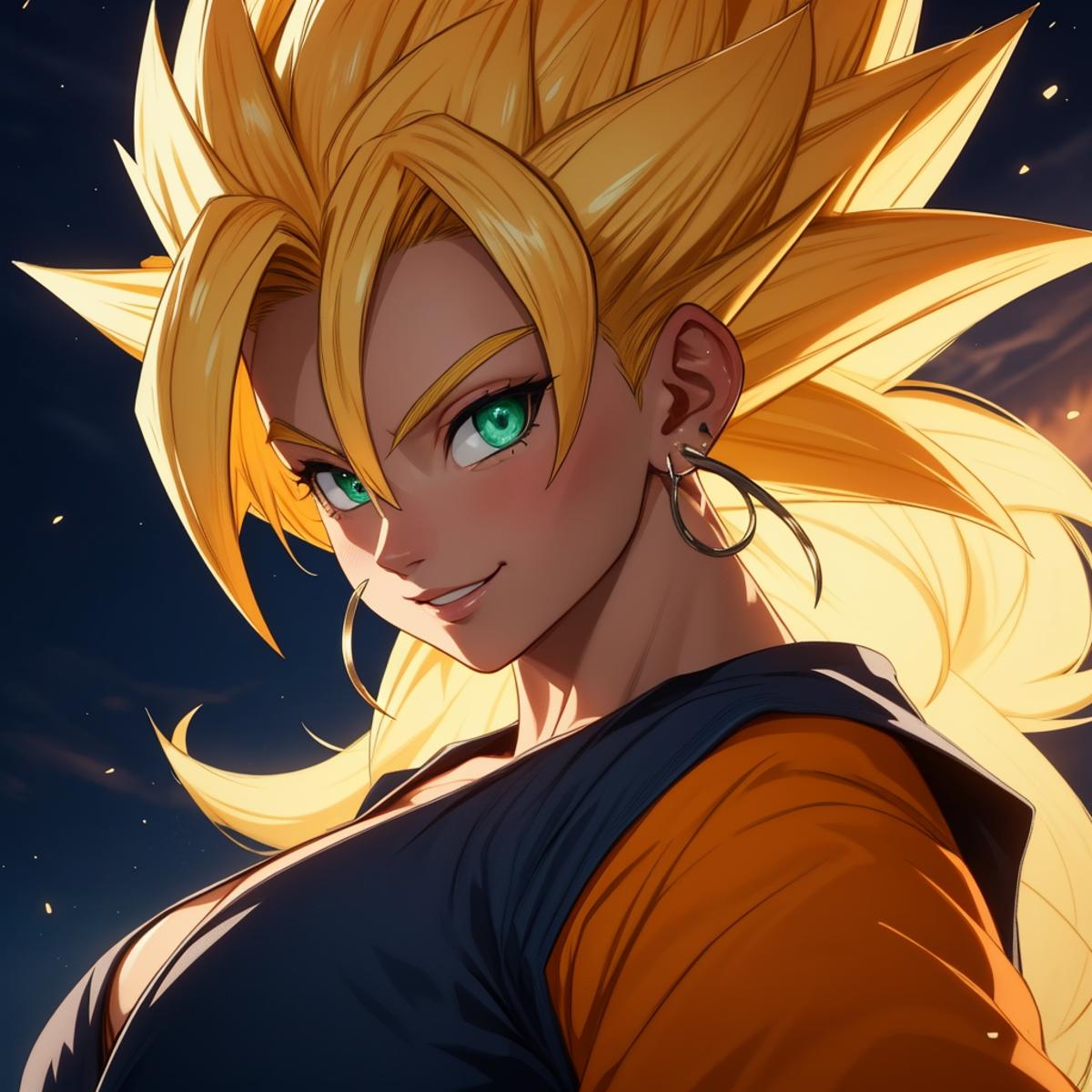 超级赛亚人3:Vegetto, 1boy, male focus, earrings, jewelry, solo, white gloves, muscular, looking at viewer, dougi, closed mouth, muscular male, smile, cowboy shot, super saiyan 3, spiked hair, blonde hair, green eyes, long hair,
