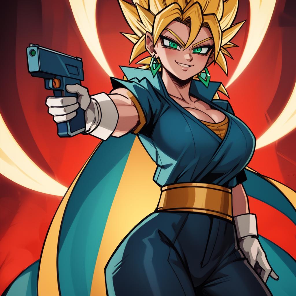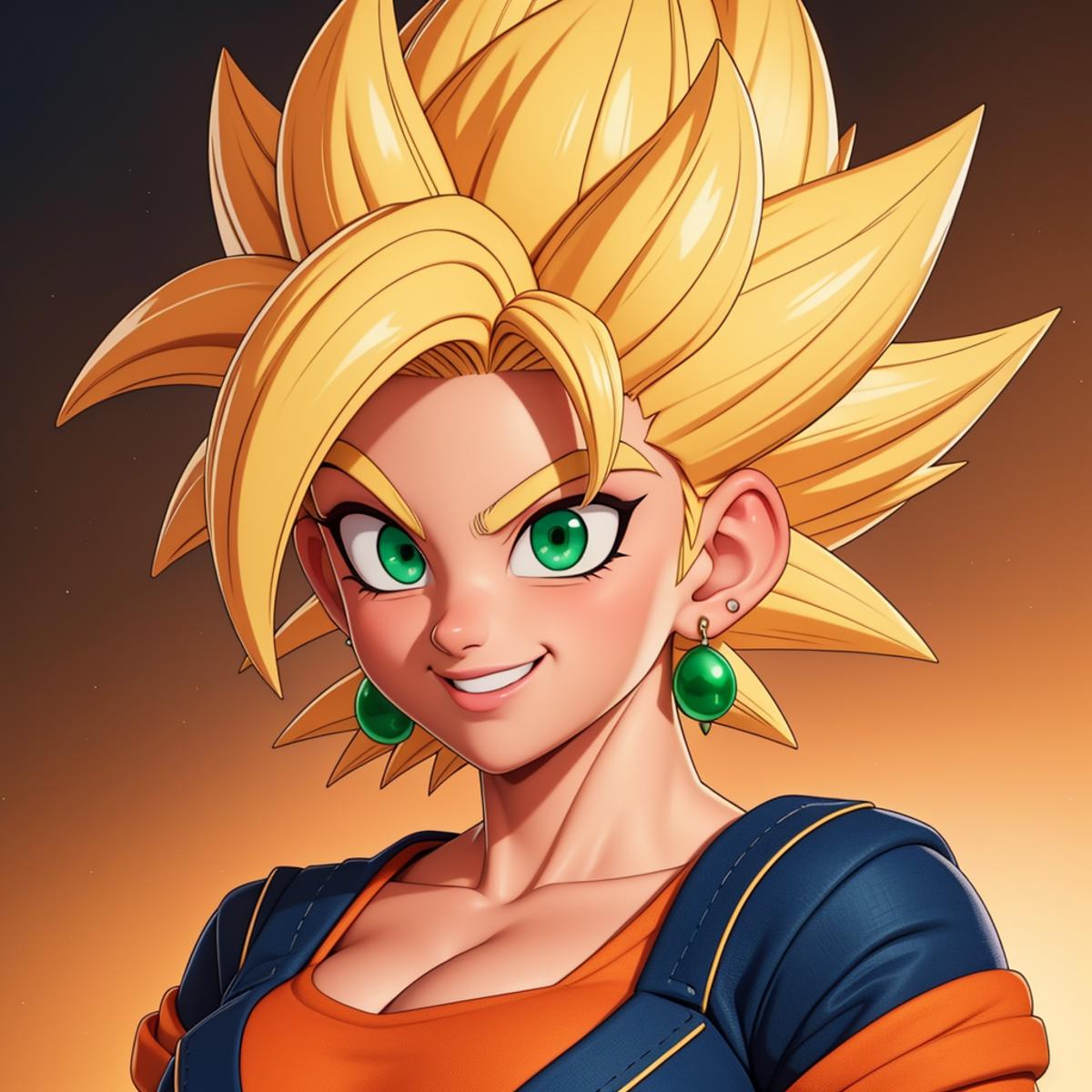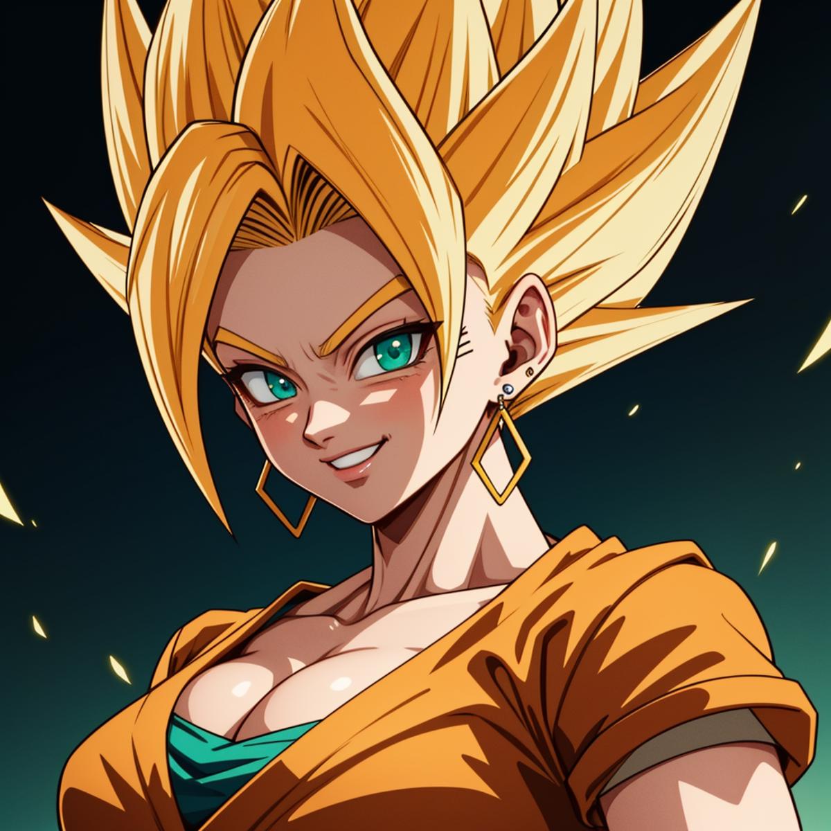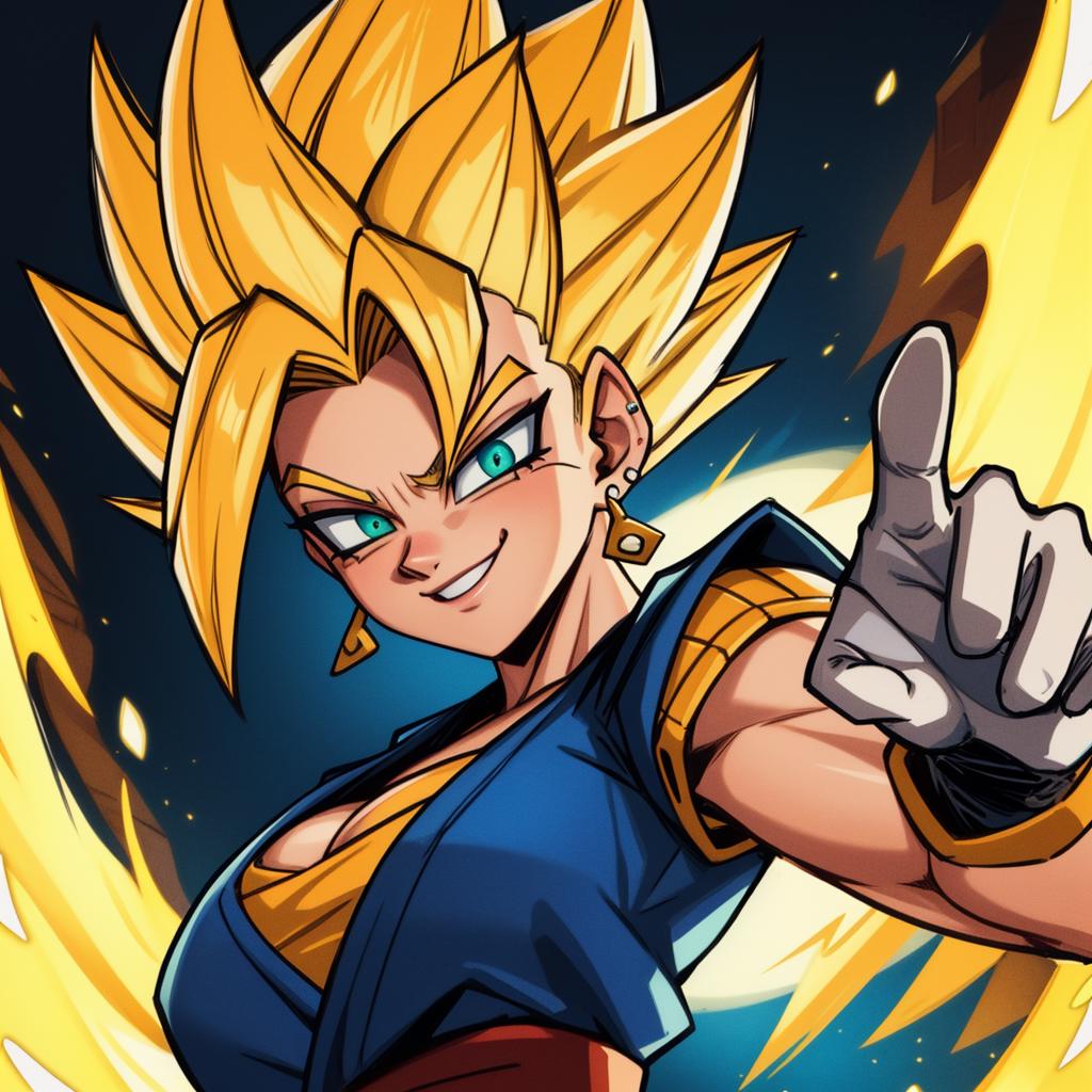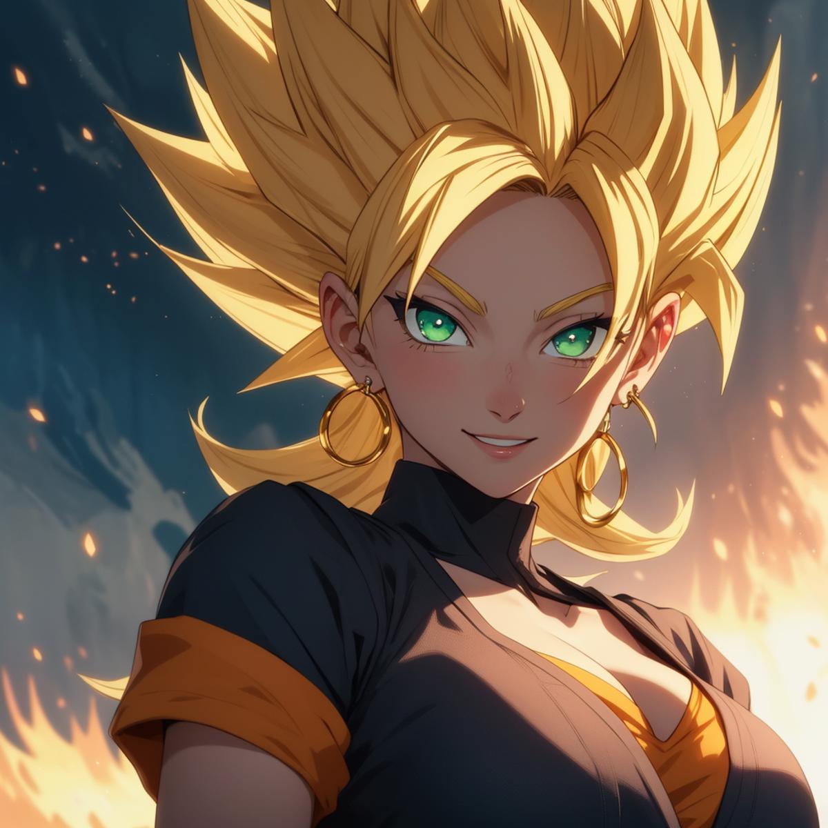 超级赛亚人3:Vegetto, 1boy, male focus, earrings, jewelry, solo, white gloves, muscular, looking at viewer, dougi, closed mouth, muscular male, smile, cowboy shot, super saiyan 3, spiked hair, blonde hair, green eyes, long hair,