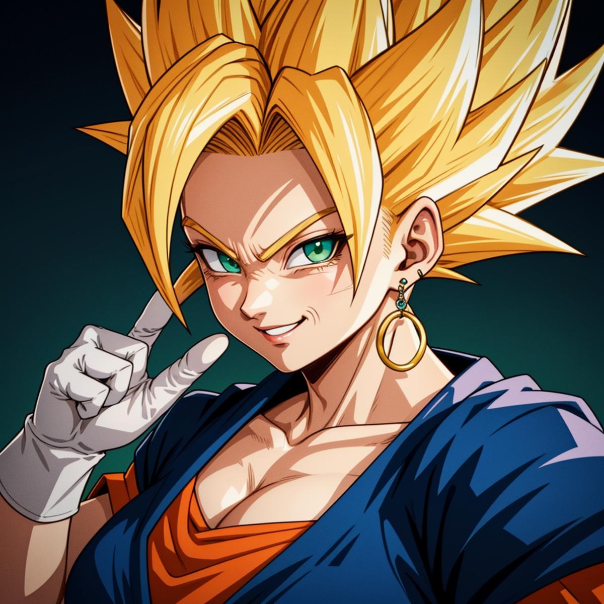 超级赛亚人:Vegetto, 1boy, male focus, earrings, jewelry, solo, white gloves, muscular, spiked hair, looking at viewer, dougi, closed mouth, muscular male, simple background, smile, white background,hands on hips, blonde hair, green eyes, super saiyan,