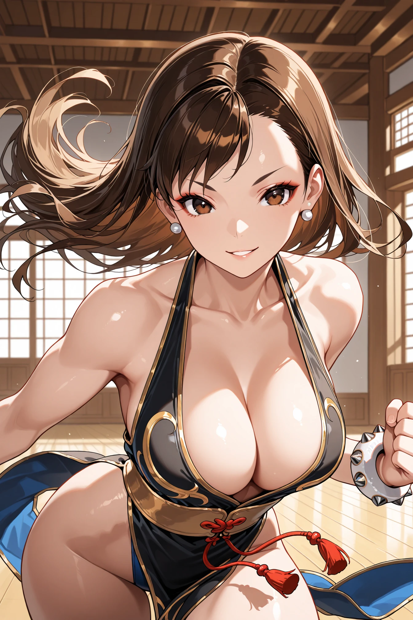 "chun-li, brown eyes, double bun, bun cover, qipao, spiked bracelet, sheer pantyhose, Blue leotard" for her default outfit.