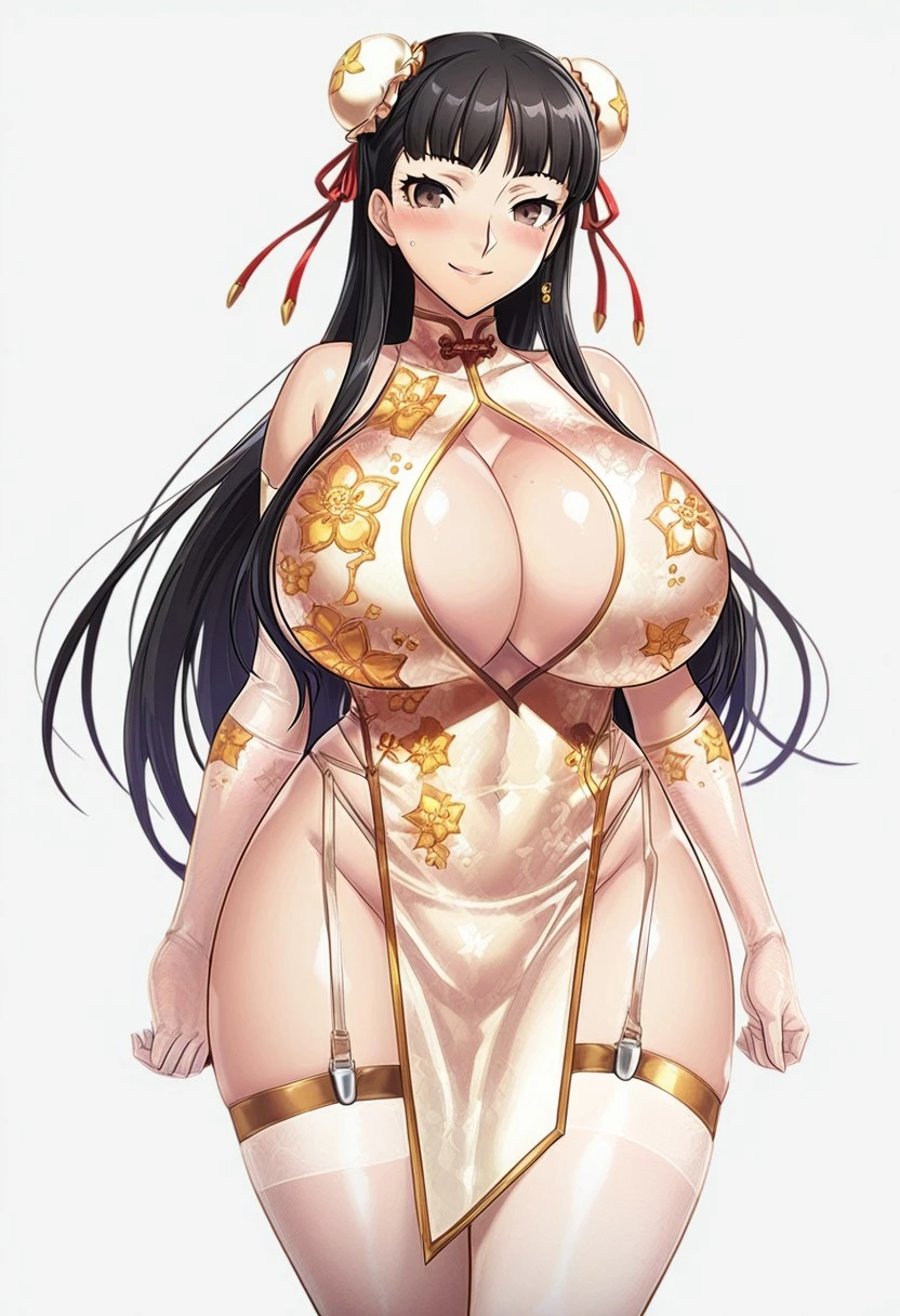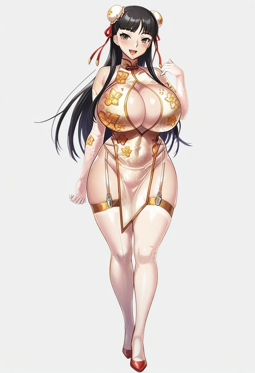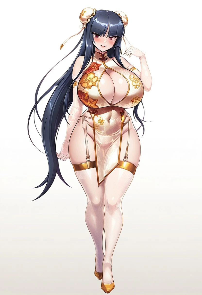 white china dress,chinese clothes,clothing cutout,garter straps,elbow gloves,see-through,bare shoulders,pelvic curtain,cleavage cutout,white thighhighs,double bun, bun cover,ribbon,pelvic curtain,white high heels,