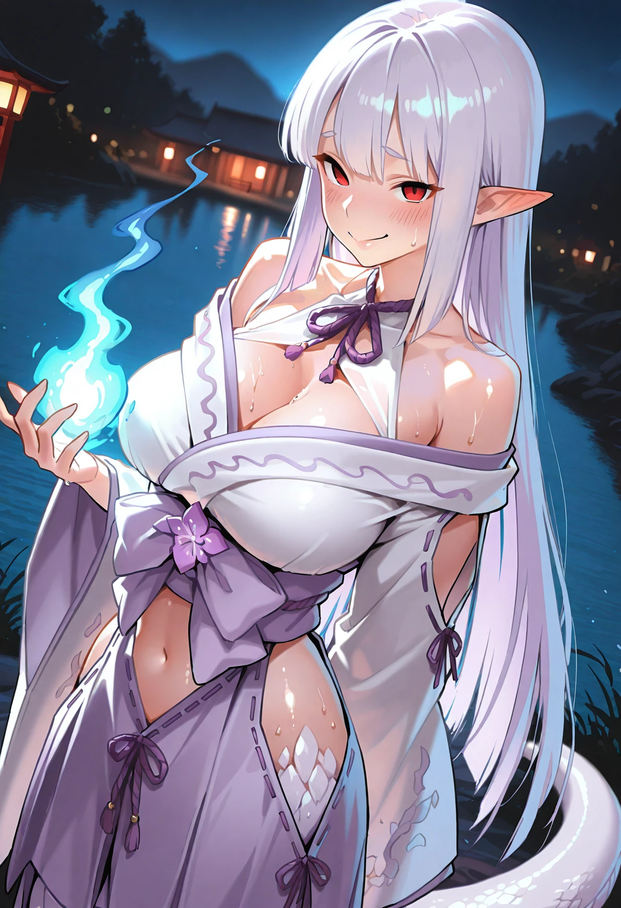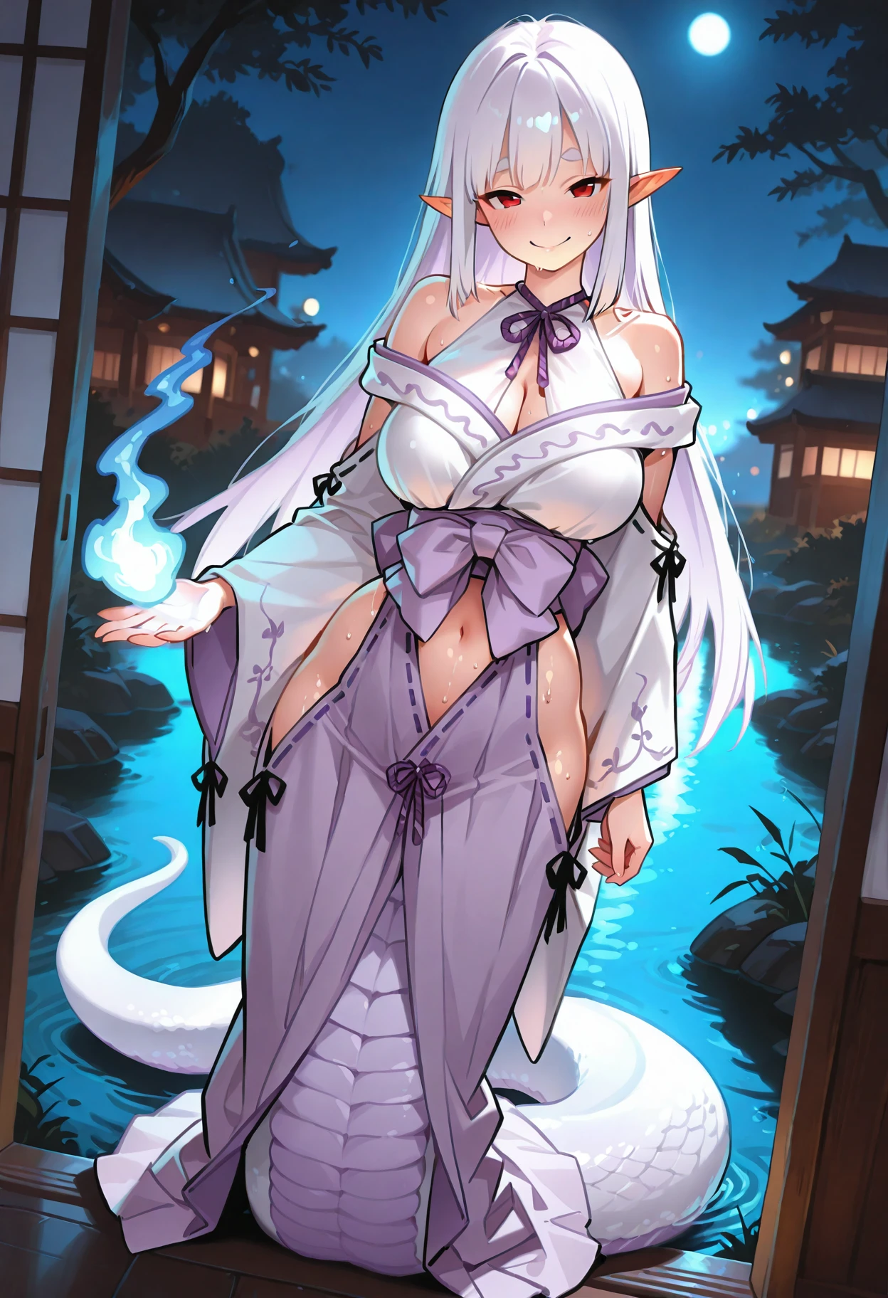 shirohebimge, lamia, monster girl, pointy ears, white tail, white scales, light purple underside👤 Character Appearance:
