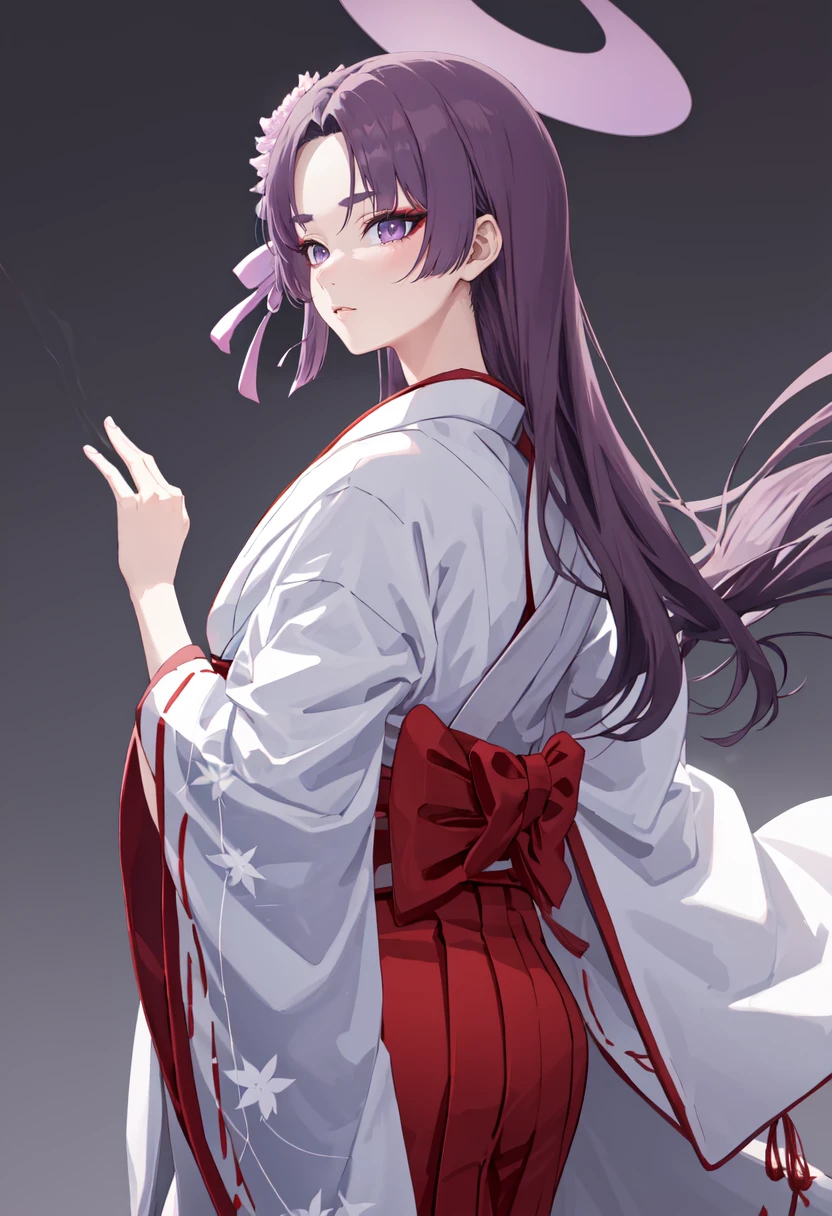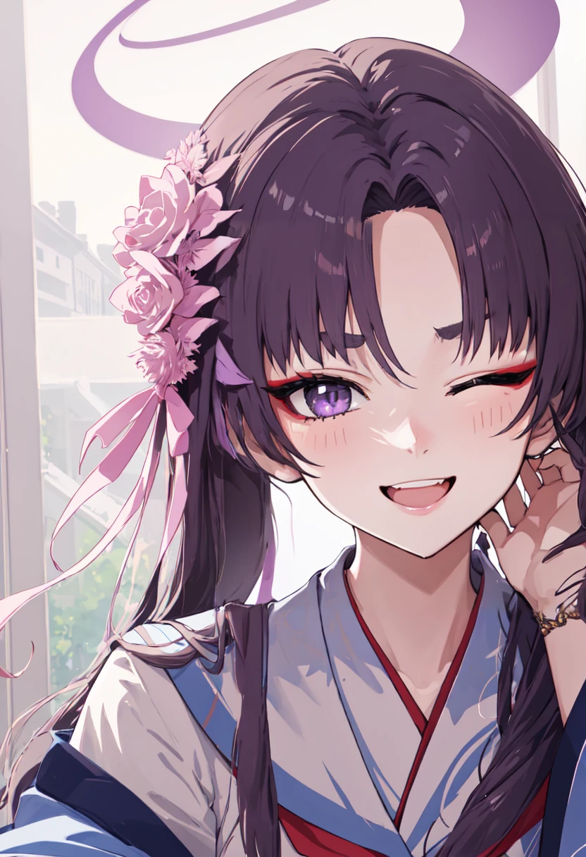 - The pruned character tags are long hair, purple hair, halo, purple halo, hair ornament, hair flower, purple eyes, eyeshadow, red eyeshadow, breasts, fang, skin fang, large breasts. You can add them into prompts when core features (e.g. hair color) of character is not so stable.