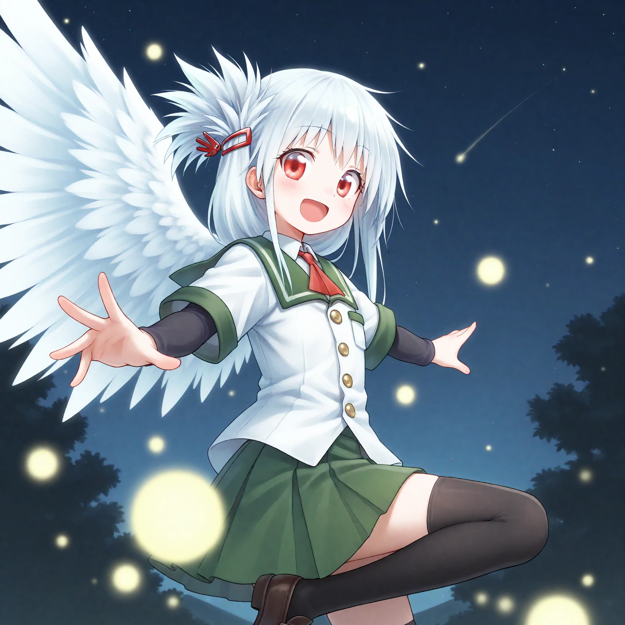MaihaTwiIns,fireflies,white hair, long hair, right folded hair, right folded ponytail, red hairclip, red eyes, sidelocks,green sailor collar, red neckerchief, serafuku, white shirt, golden buttons, green trim, pocket, short over long sleeves, black long sleeves,green pleated skirt, black thighhighs, brown loafers,