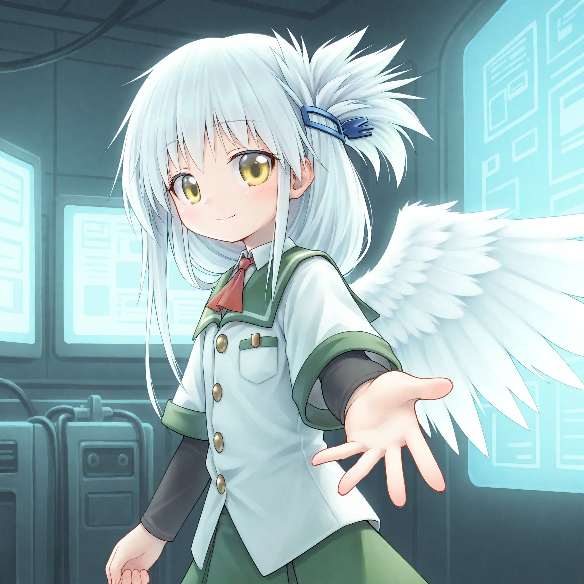 TsubasaTwiIns,white hair, long hair, left folded hair, left folded ponytail, blue hairclip, yellow eyes, sidelocks,green sailor collar, red neckerchief, serafuku, white shirt, golden buttons, green trim, pocket, short over long sleeves, black long sleeves,green pleated skirt,black thighhighs, brown loafers,