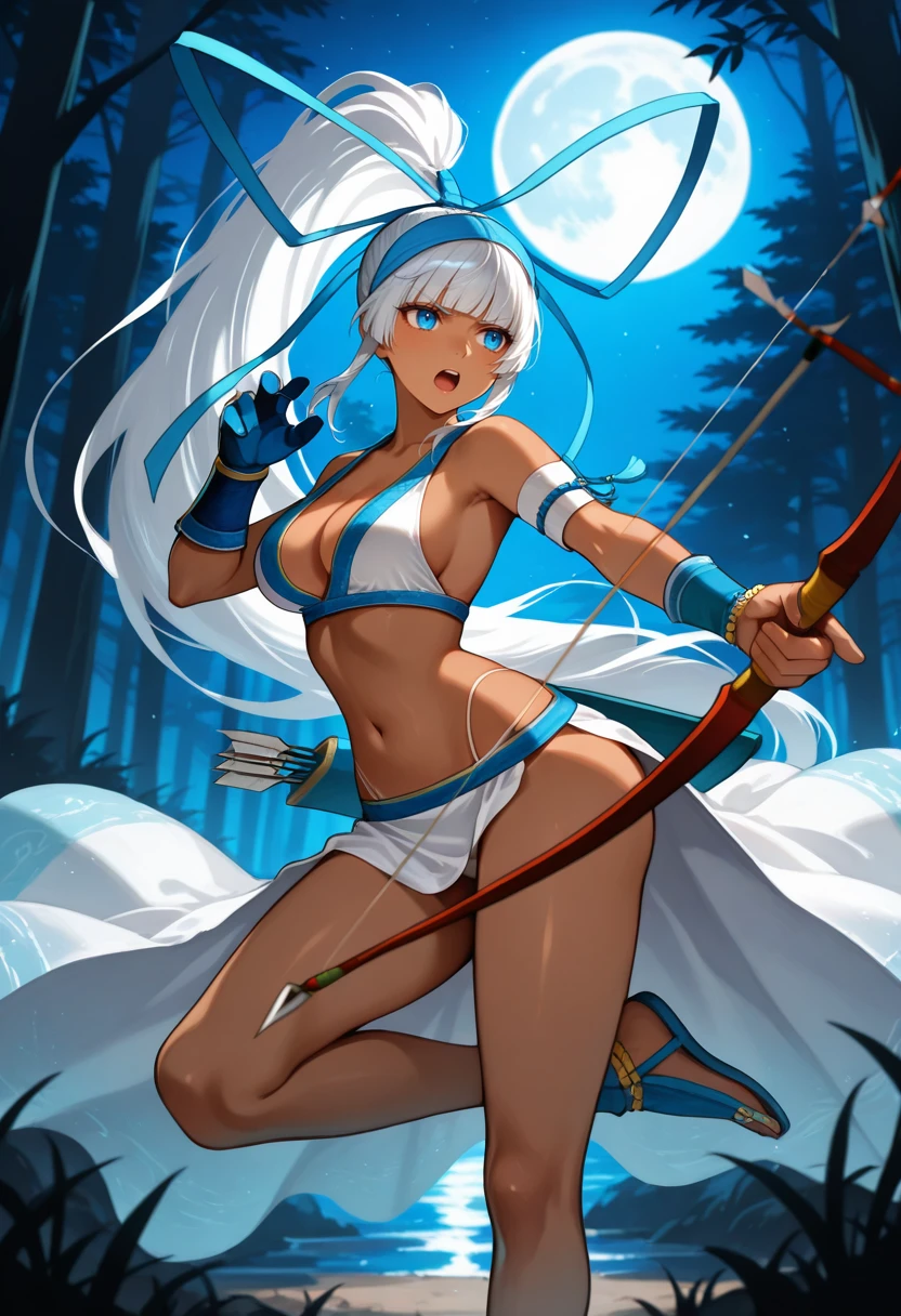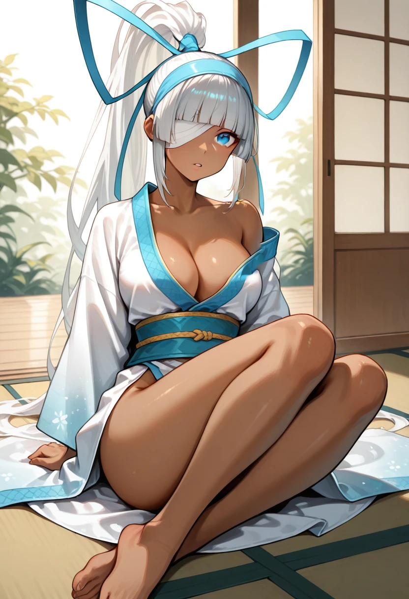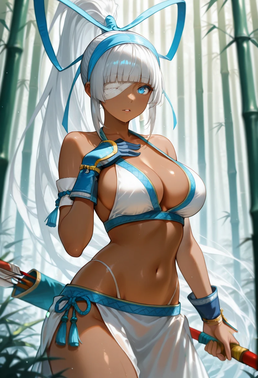 "SSMAKIJ,dark-skinned female, white hair, blunt bangs, long hair,high ponytail, hair ribbon, blue eyes, blue hairband, bandaged eye, white bikini, armlet, white sarong, blue glove, single glove, arm guards"