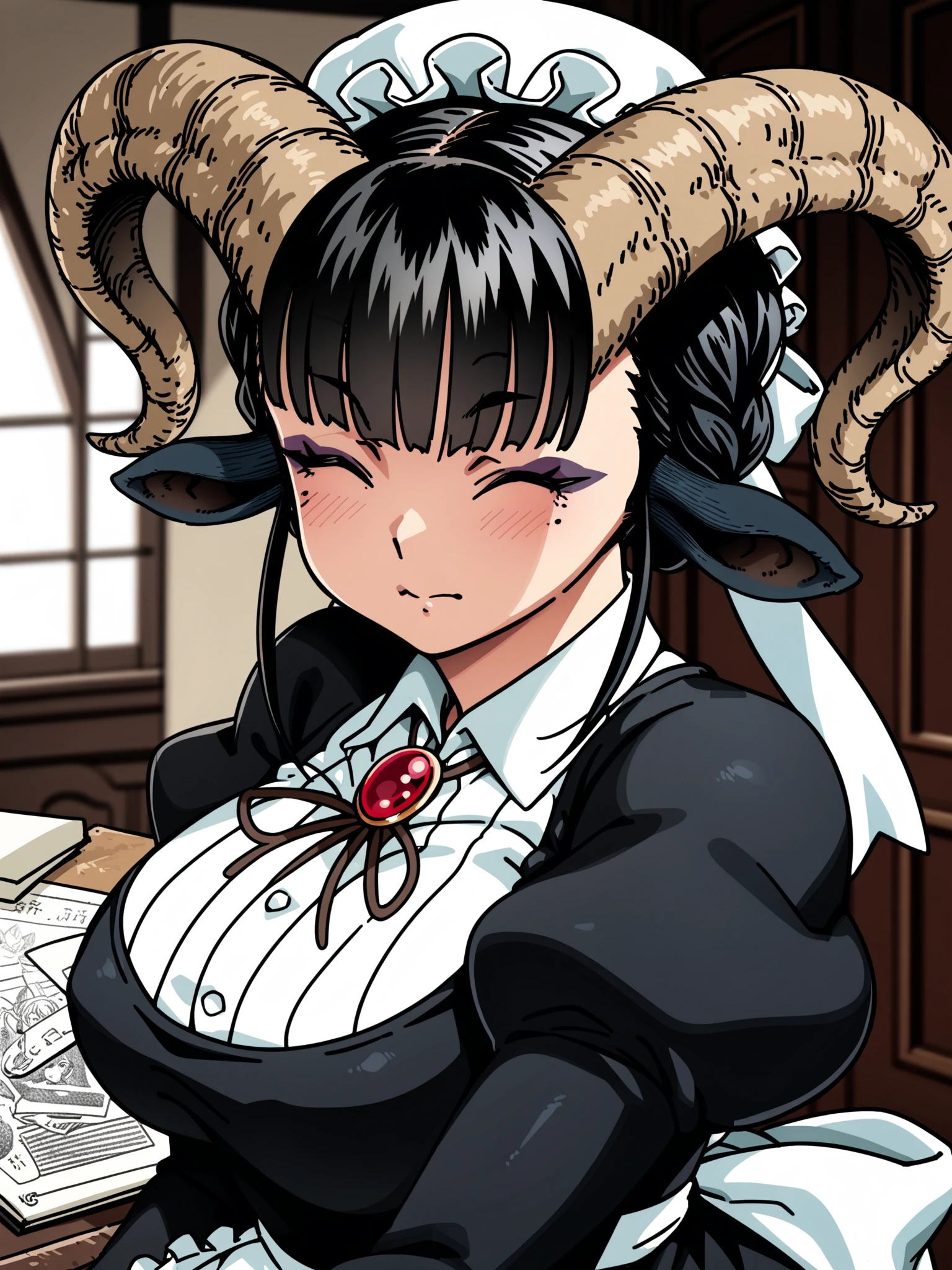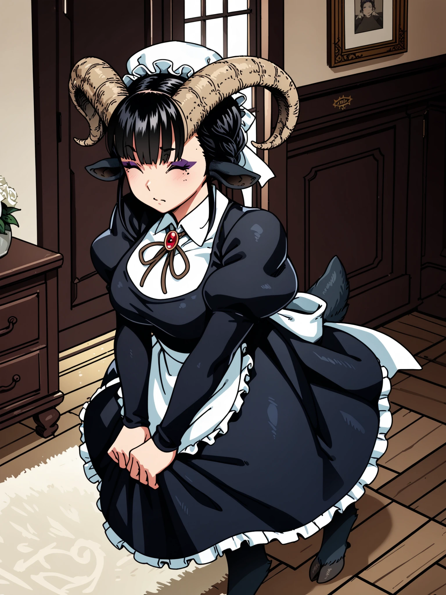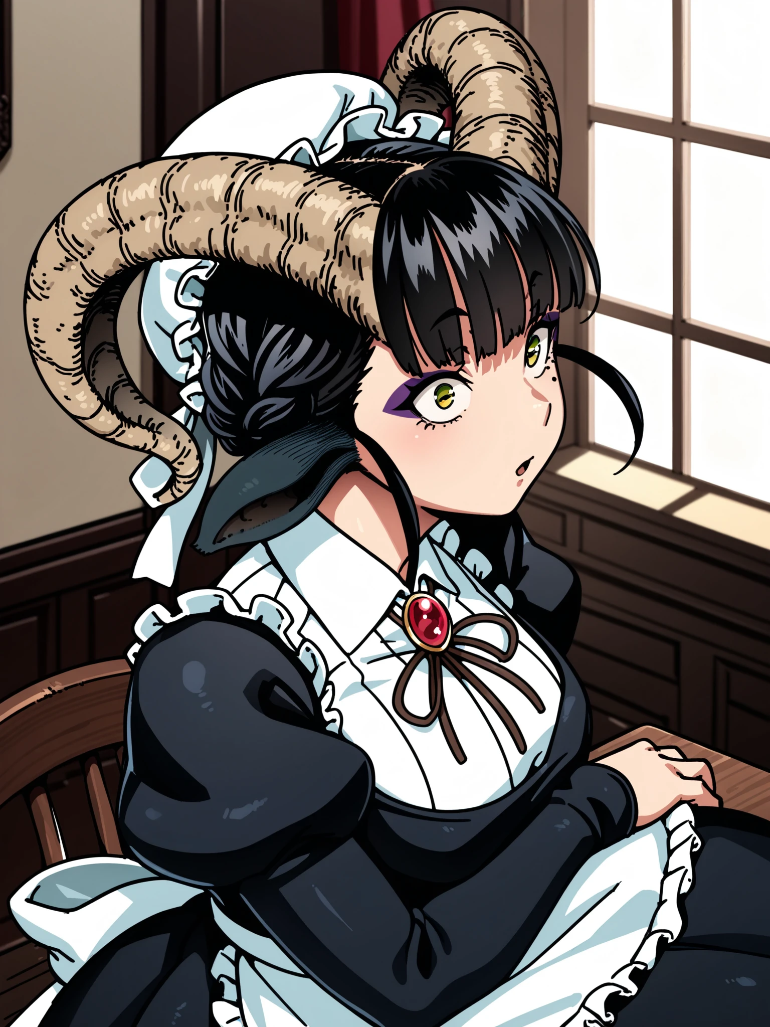 Default outfit: maid, apron, mob cap, collared shirt, long sleeves, puffy sleeves, juliet sleeves, brooch
