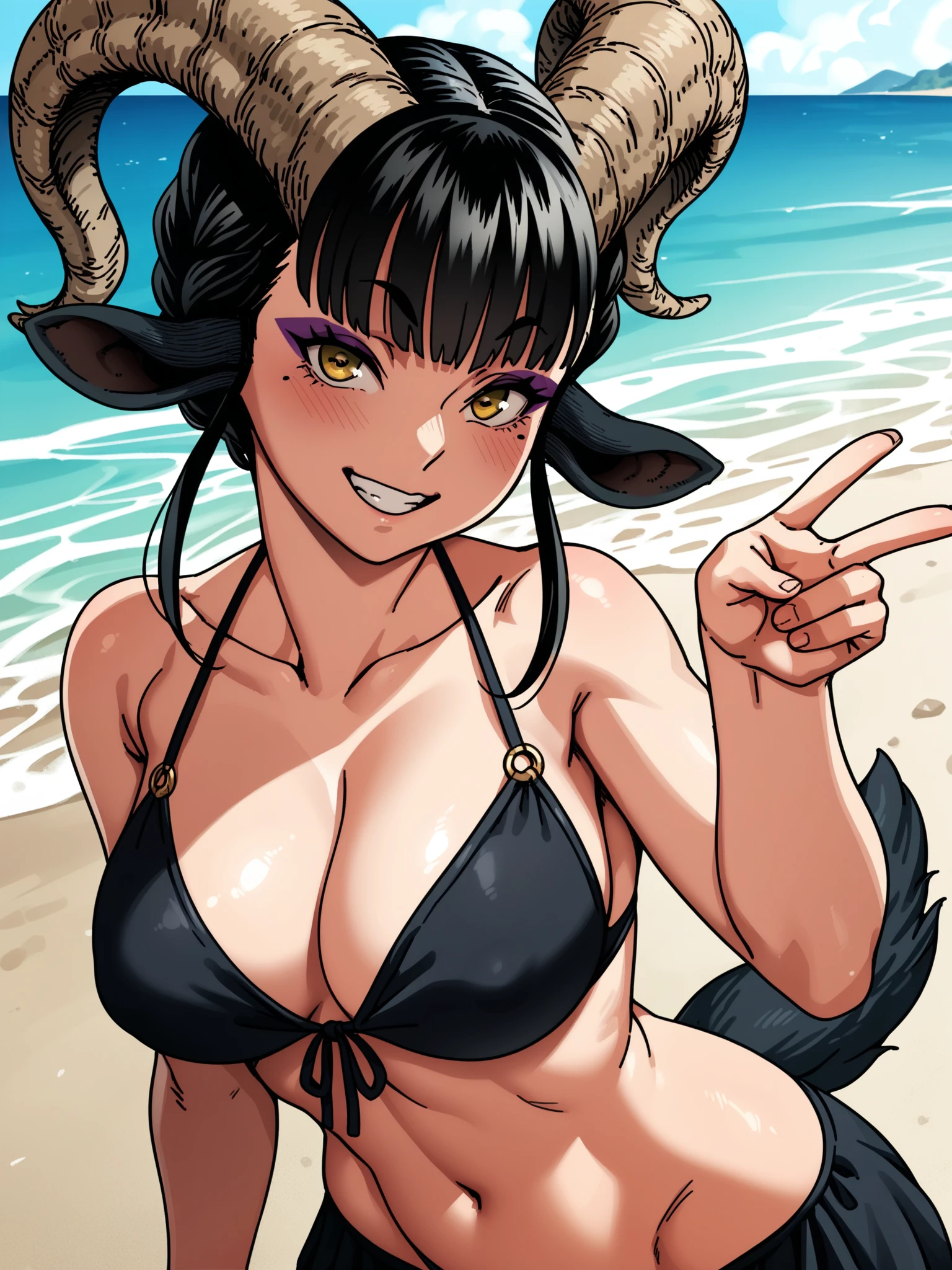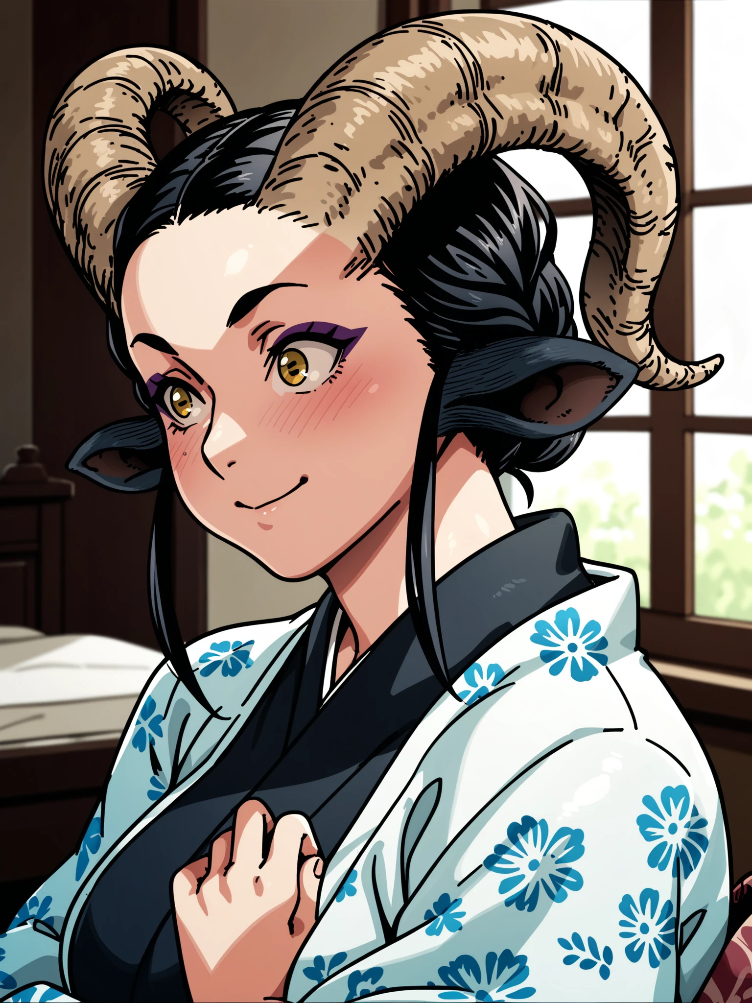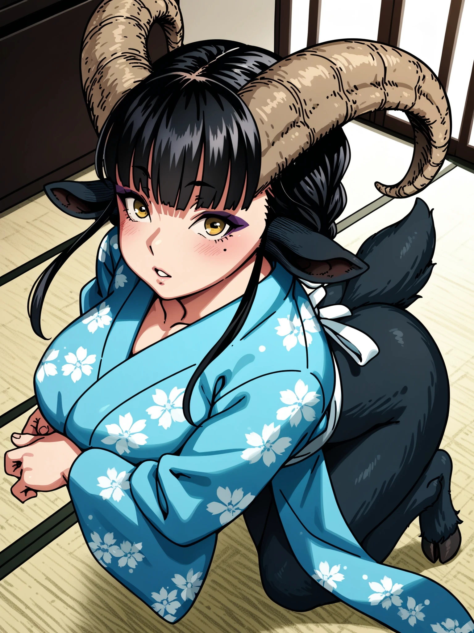 Recommended prompt: ht_maya, satyr, goat girl, goat horns, goat tail, hooves, yellow eyes, eyeshadow