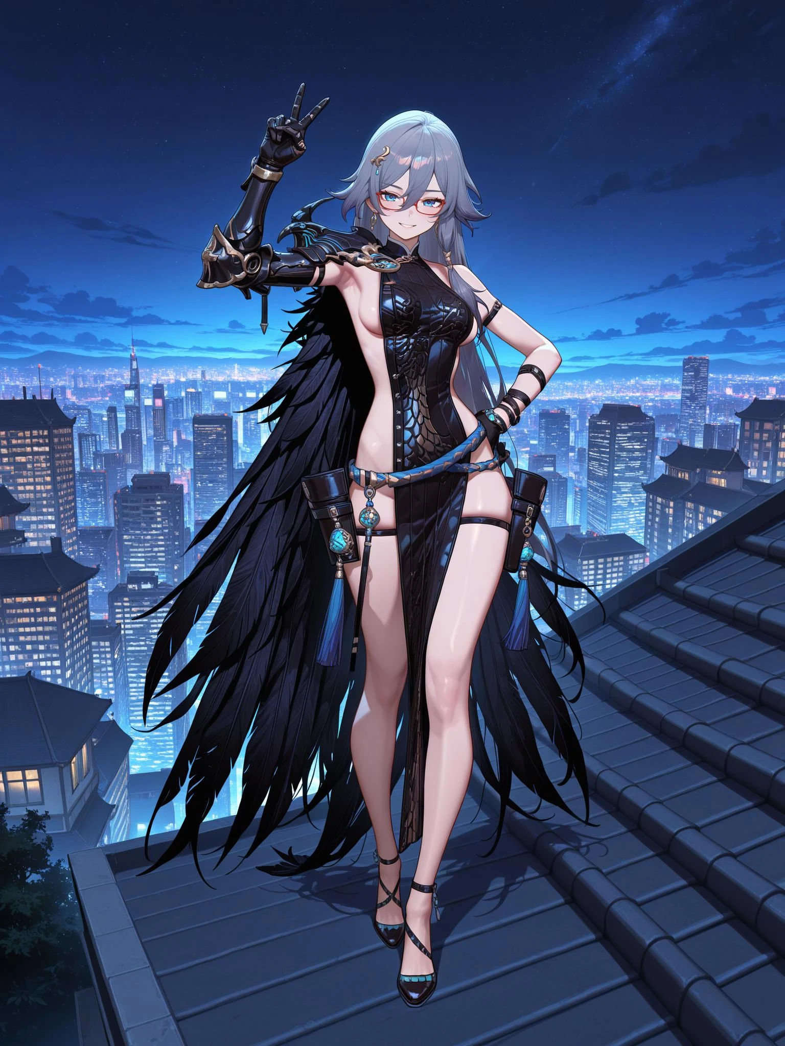 ravenfall, black leather tabard, naked tabard, sideboob, sideless, thighighs, black cape, black_feathers, feather_cape, armored right arm, bare left arm, black gloves, armor, black gloves