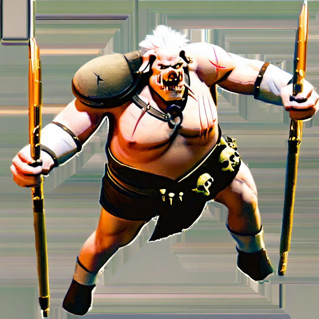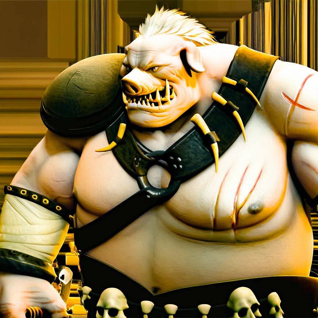 zhuxxj,snout, pig nose, pig ears,pig, shoulder pad, fangs, red scar, blonde hair, chest harness, black harness, o-ring, scar,fat,belly