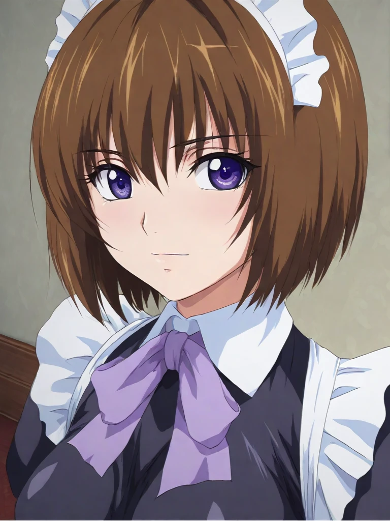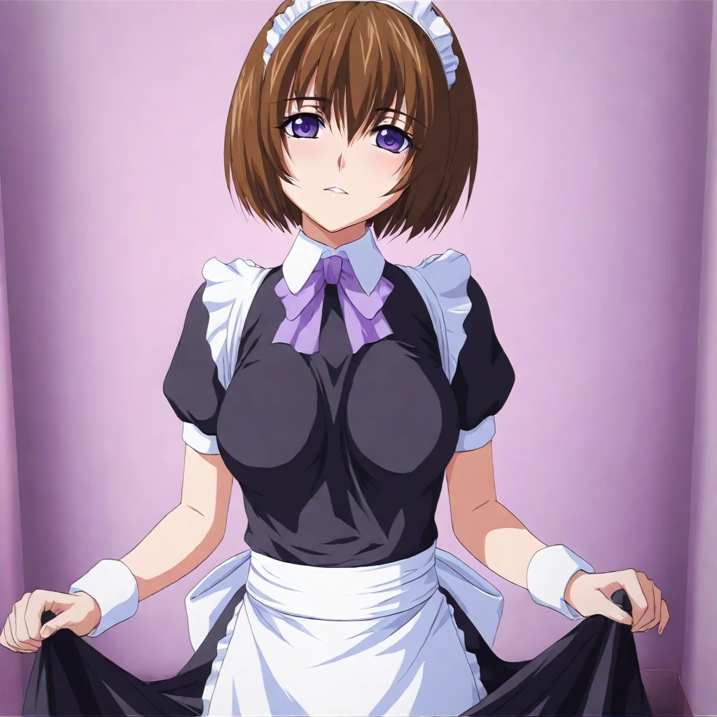 ester, brown hair, short hair, purple eyes, medium breasts