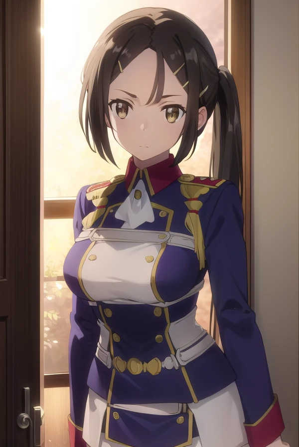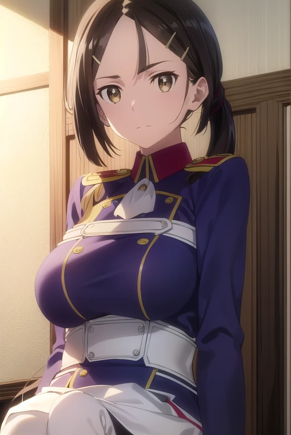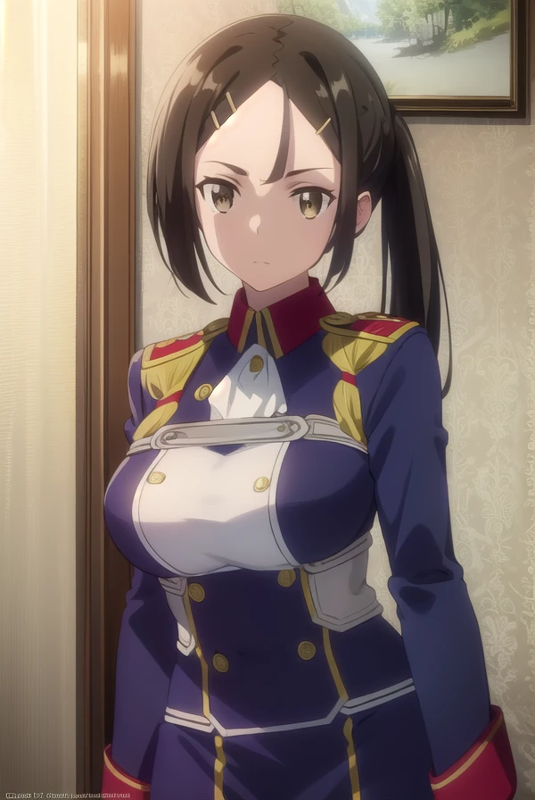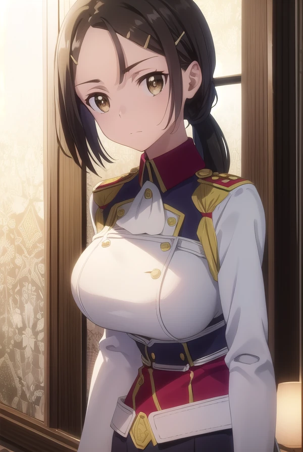 bianca, black hair, hair ornament, (brown eyes:1.5), hairclip, ponytail,